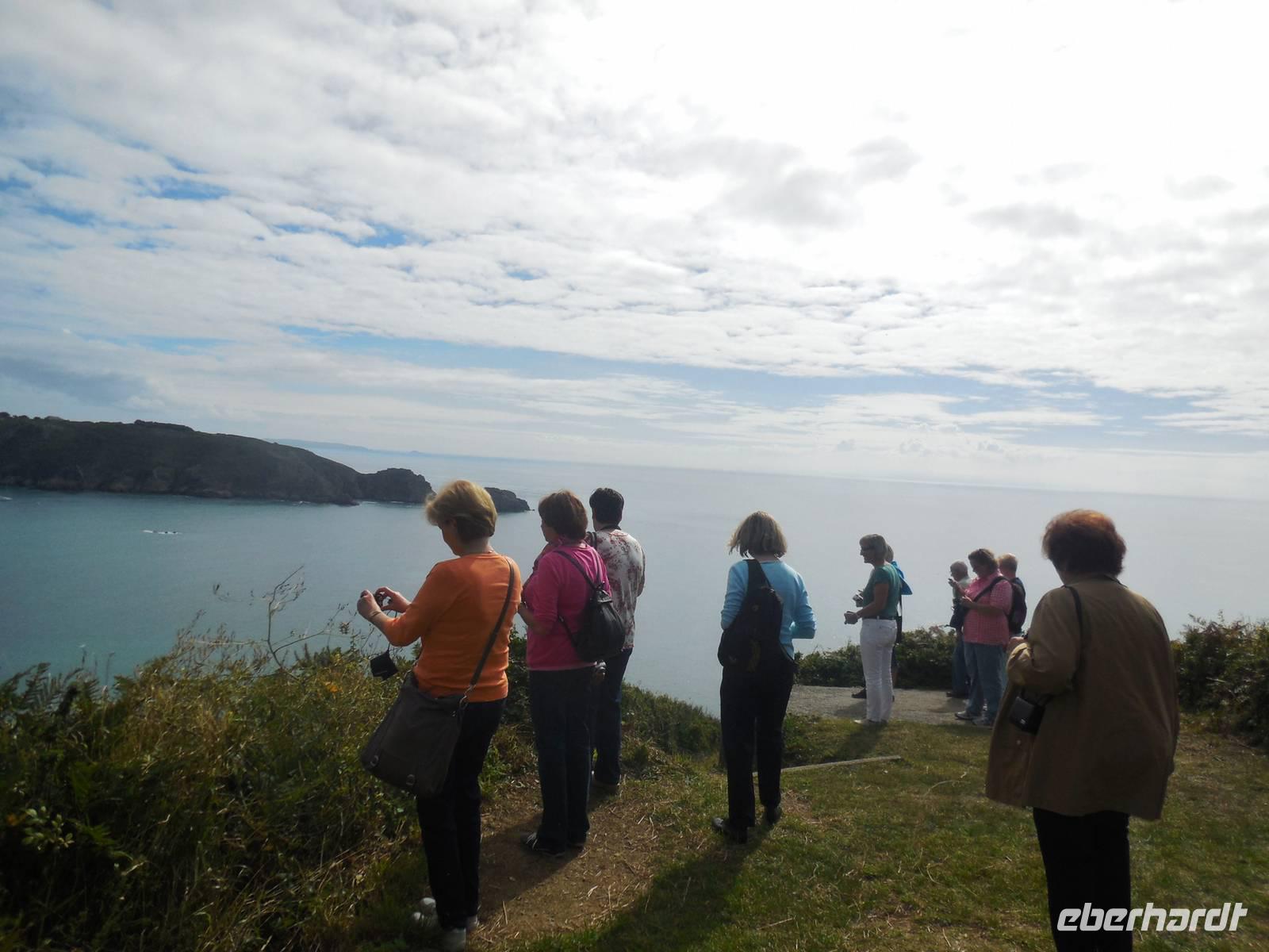 Auch der heutige Tag bietet wieder die Qual der Wahl. Jersey hat einfach zu viele schöne, interessante Eckchen, die zu Erkunden es sich lohnt. Heute stehen eine Inlandsrundfahrt oder eine Klippenwanderung zur Auswahl. Wieder andere wandern die Küste entlang bis nach Gorey, einige fahren mit der hübschen Bimmelbahn nach St.Aubin und besichtigen die Glaskirche. Die Hälfte unserer kleinen gemütlichen Gruppe begibt sich mit Reiseleiter Ernst auf eine Inlandstour und bestaunt das ländliche Leben Jerseys, mit den Jerseykühen und idyllische Gärtchen.