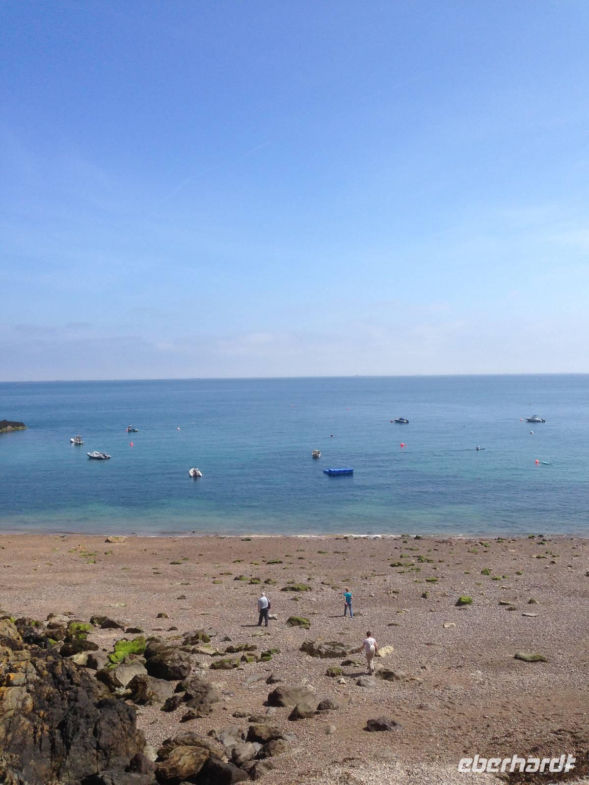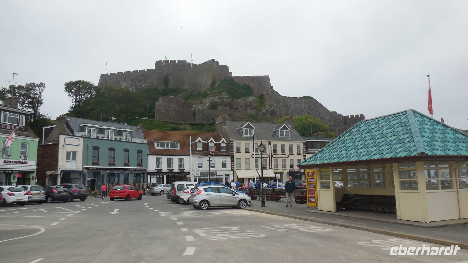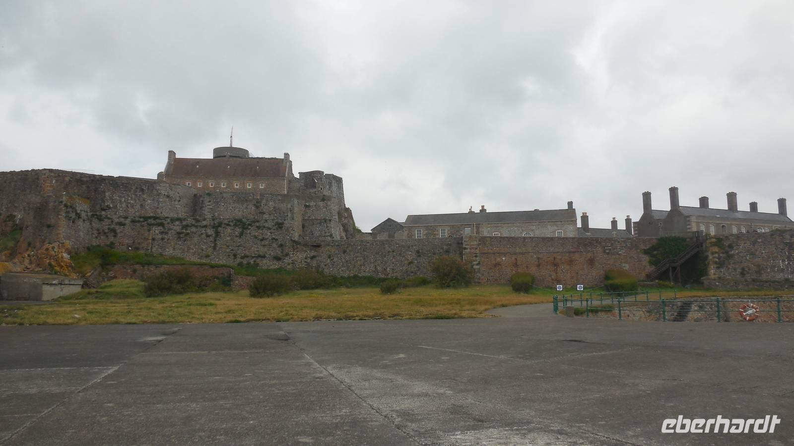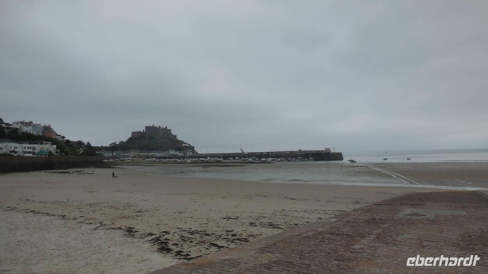 Der heutige Tag steht uns zur freien Verfügung. Am Morgen entscheiden wir uns für einen gemeinsamen Besuch des Elizabeth Castles in St. Helier. Nach einem langem Weg und einem Fotostopp an der Steam Clock erreichen wir den Hafen. Bei Ebbe kann man hier zu Fuß zum Elizabeth Castle spazieren. Wir fahren Pflastermüde mit einem Amphibienfahrzeug, der „castle ferry" hinüber zur Burg. Das ulkige Fahrzeug (halb Bus, halb Boot) bringt uns mit dem noch witzigeren Sicherheitsvideo von Soldaten zum Lachen. Wir genießen die Überfahrt und begeben uns zur richtigen Zeit an den richtigen Ort, denn um kurz vor zwölf kommen wir in den Genuss des Kanonenschusses. Bei einer lustigen Zeremonie mit freiwilligen Soldaten, in diesem Falle Besucher, die das Marschieren erlernen müssen, wird eine Kanone gereinigt, geladen und abgefeuert. Der Knall ist lauter als gedacht und auch oben auf der Burg laut zu vernehmen. Nachdem wir uns die hübsche, verwinkelte uns sehr gut erhaltene Burg zur Genüge angeschaut haben begeben wir uns per castle ferry zurück ans Ufer von St. Helier und fahren mit dem Little Train, einem kleinen zugähnlichen Gefährt Richtung St. Aubin. Dort genießen wir den Rest des Tages bei einem leckeren Kaffee oder Jersey-Eiscreme oder mit weiteren Erkundungen der vielfältigen Gegend.