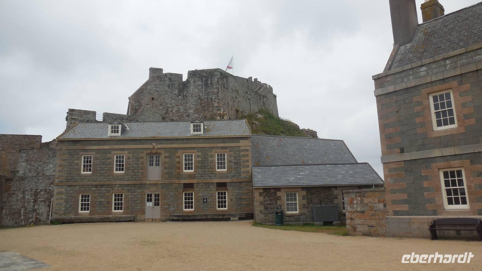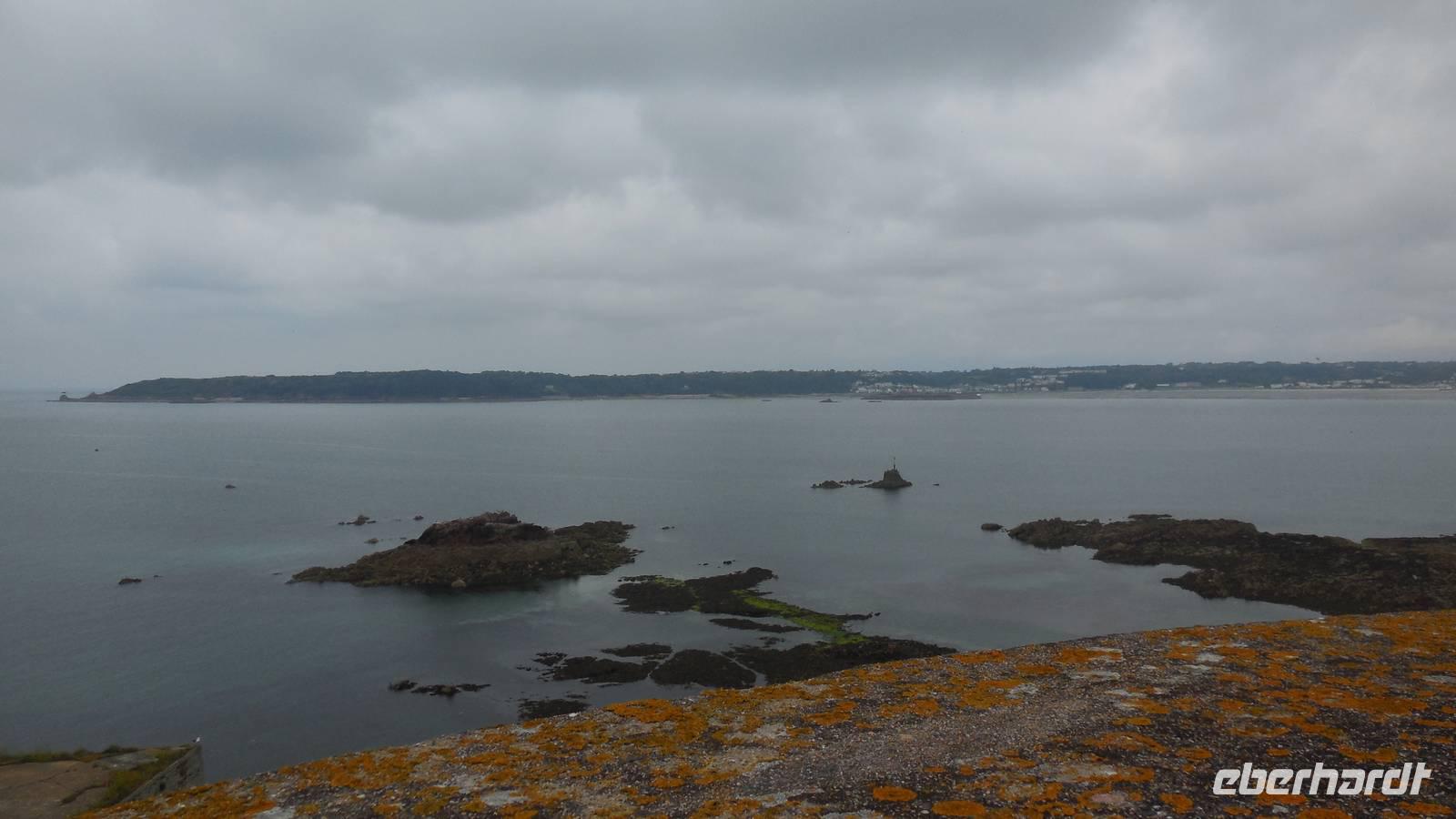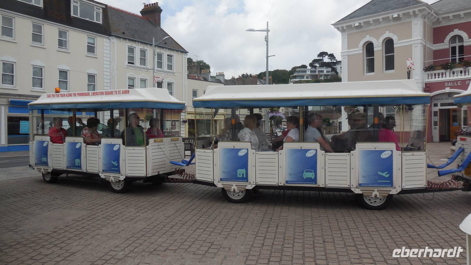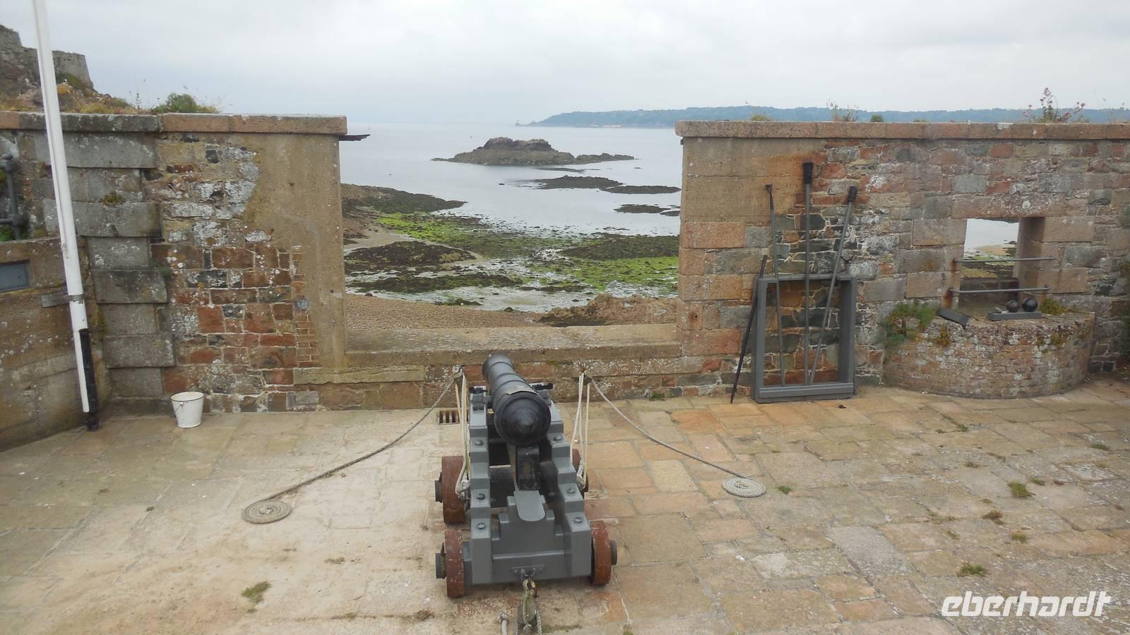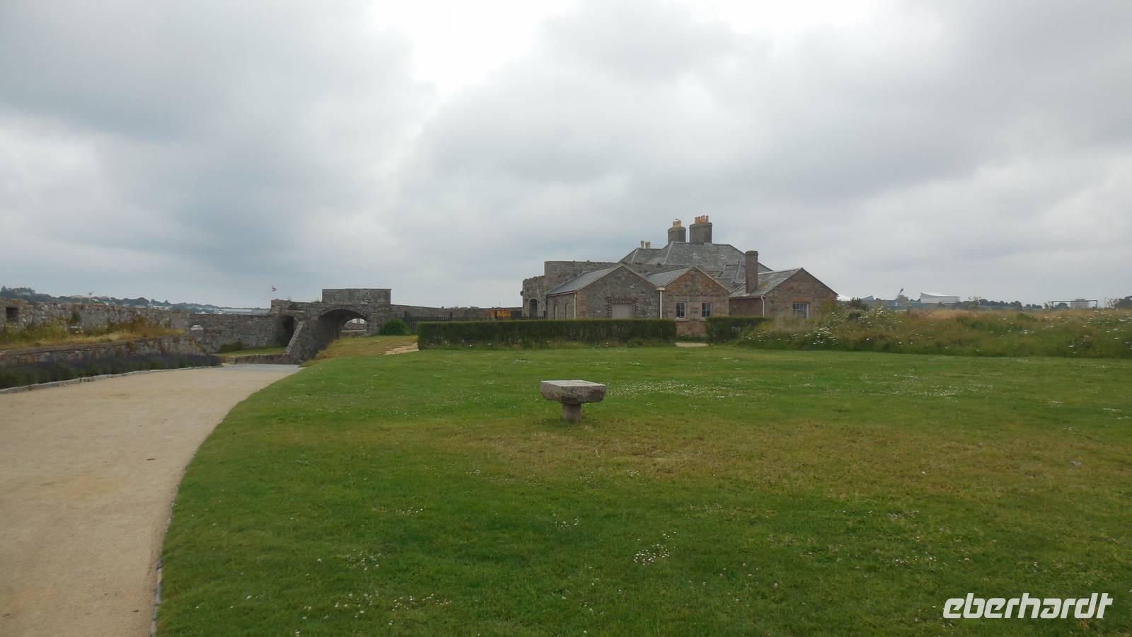 Der heutige Tag steht uns zur freien Verfügung. Am Morgen entscheiden wir uns für einen gemeinsamen Besuch des Elizabeth Castles in St. Helier. Nach einem langem Weg und einem Fotostopp an der Steam Clock erreichen wir den Hafen. Bei Ebbe kann man hier zu Fuß zum Elizabeth Castle spazieren. Wir fahren Pflastermüde mit einem Amphibienfahrzeug, der „castle ferry" hinüber zur Burg. Das ulkige Fahrzeug (halb Bus, halb Boot) bringt uns mit dem noch witzigeren Sicherheitsvideo von Soldaten zum Lachen. Wir genießen die Überfahrt und begeben uns zur richtigen Zeit an den richtigen Ort, denn um kurz vor zwölf kommen wir in den Genuss des Kanonenschusses. Bei einer lustigen Zeremonie mit freiwilligen Soldaten, in diesem Falle Besucher, die das Marschieren erlernen müssen, wird eine Kanone gereinigt, geladen und abgefeuert. Der Knall ist lauter als gedacht und auch oben auf der Burg laut zu vernehmen. Nachdem wir uns die hübsche, verwinkelte uns sehr gut erhaltene Burg zur Genüge angeschaut haben begeben wir uns per castle ferry zurück ans Ufer von St. Helier und fahren mit dem Little Train, einem kleinen zugähnlichen Gefährt Richtung St. Aubin. Dort genießen wir den Rest des Tages bei einem leckeren Kaffee oder Jersey-Eiscreme oder mit weiteren Erkundungen der vielfältigen Gegend.