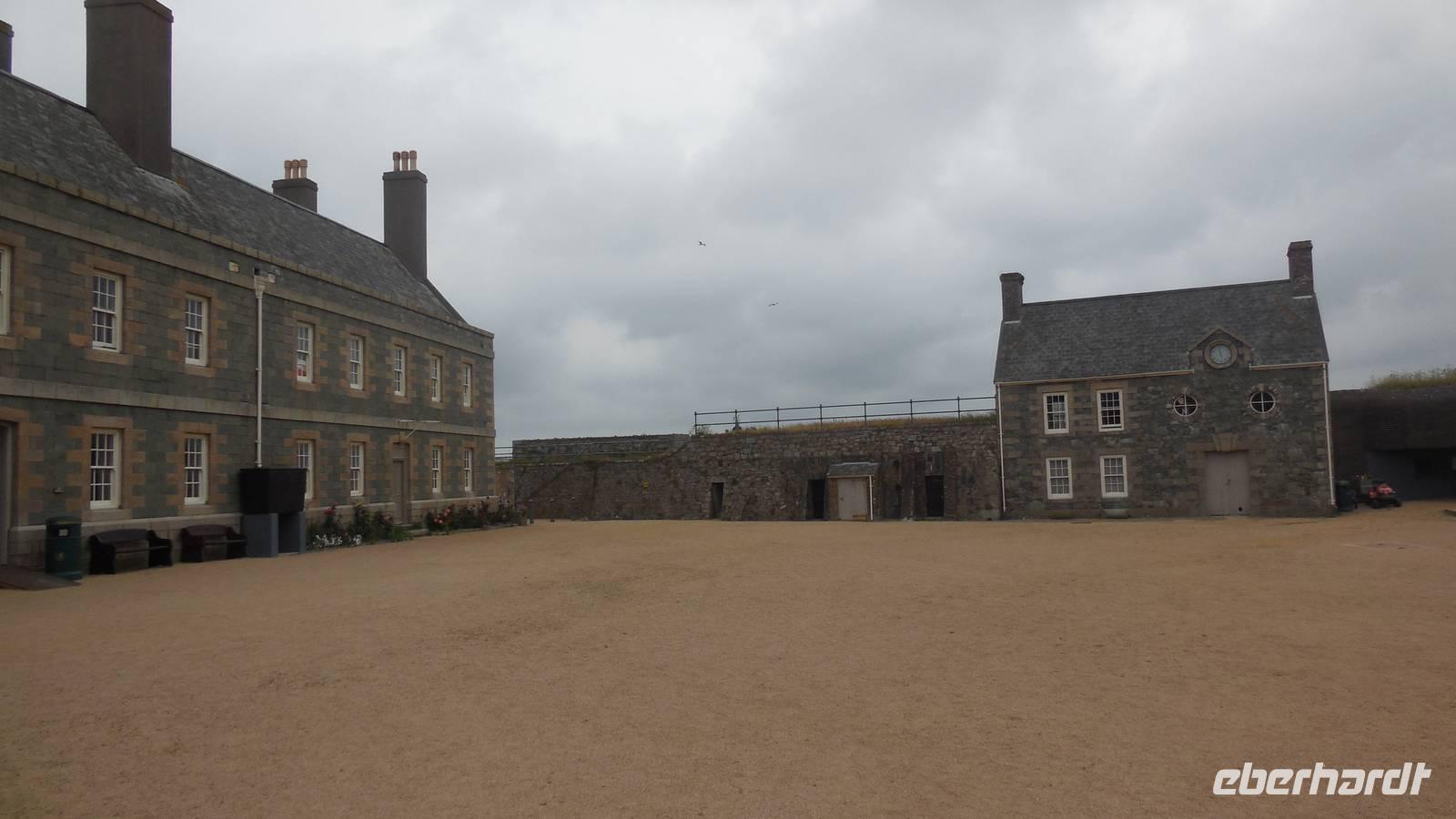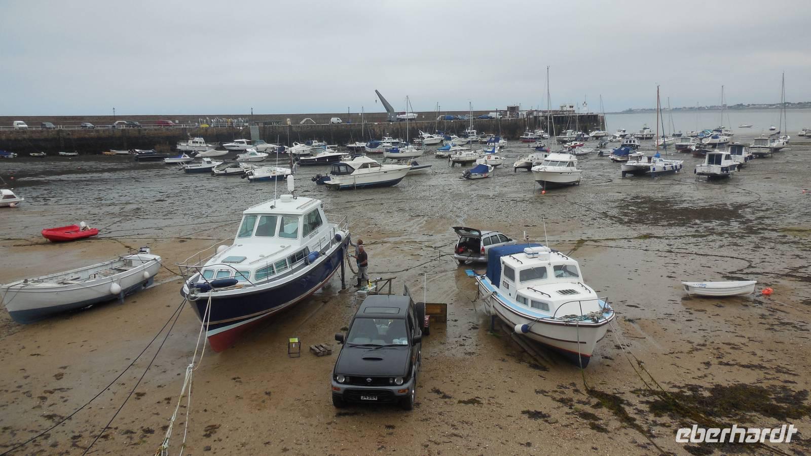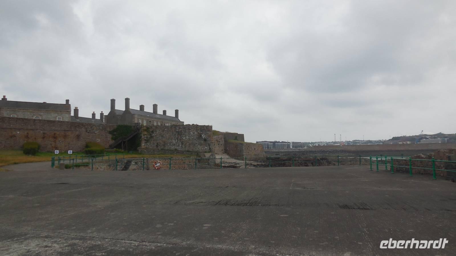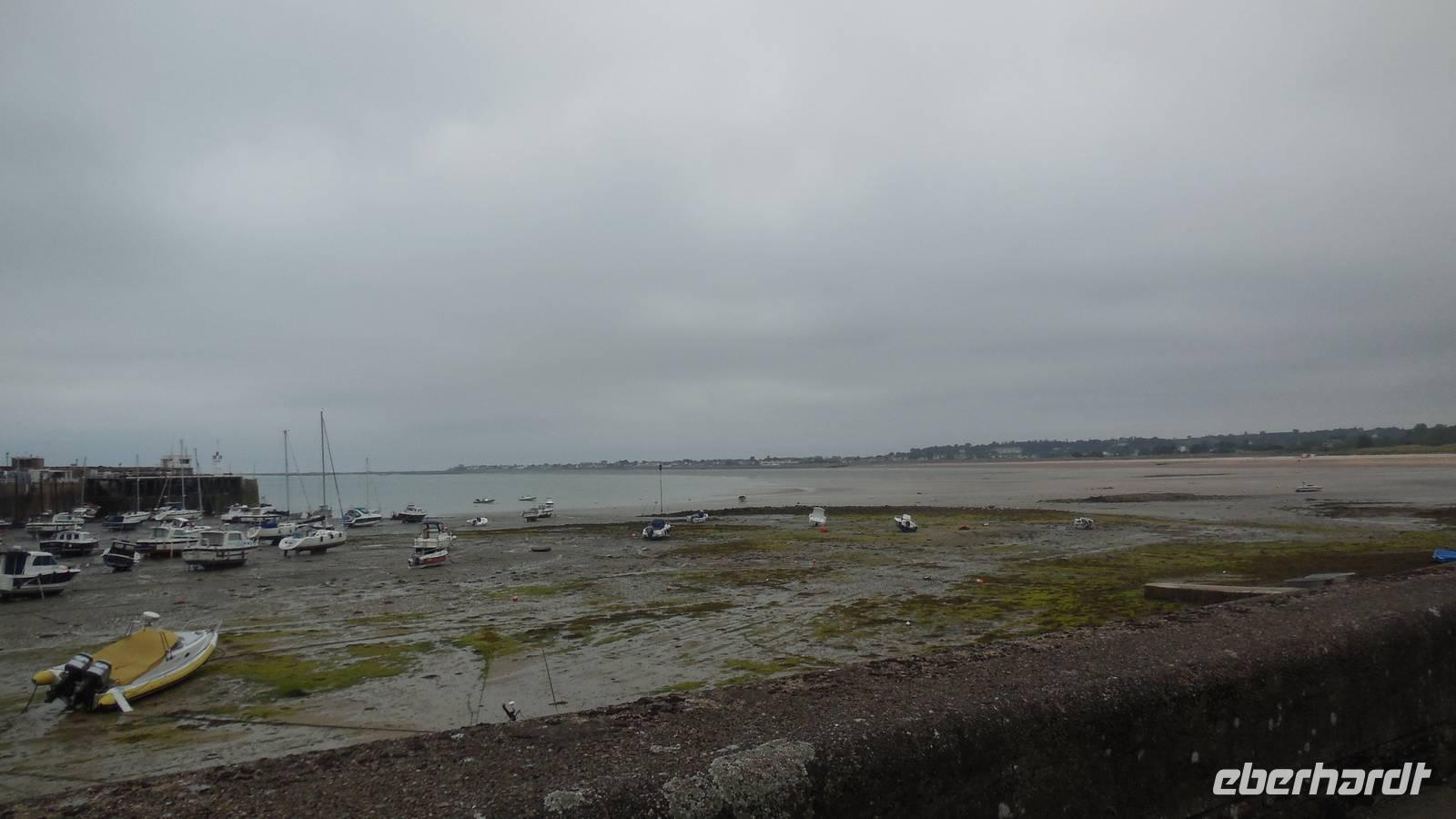 Der heutige Tag steht uns zur freien Verfügung. Am Morgen entscheiden wir uns für einen gemeinsamen Besuch des Elizabeth Castles in St. Helier. Nach einem langem Weg und einem Fotostopp an der Steam Clock erreichen wir den Hafen. Bei Ebbe kann man hier zu Fuß zum Elizabeth Castle spazieren. Wir fahren Pflastermüde mit einem Amphibienfahrzeug, der „castle ferry" hinüber zur Burg. Das ulkige Fahrzeug (halb Bus, halb Boot) bringt uns mit dem noch witzigeren Sicherheitsvideo von Soldaten zum Lachen. Wir genießen die Überfahrt und begeben uns zur richtigen Zeit an den richtigen Ort, denn um kurz vor zwölf kommen wir in den Genuss des Kanonenschusses. Bei einer lustigen Zeremonie mit freiwilligen Soldaten, in diesem Falle Besucher, die das Marschieren erlernen müssen, wird eine Kanone gereinigt, geladen und abgefeuert. Der Knall ist lauter als gedacht und auch oben auf der Burg laut zu vernehmen. Nachdem wir uns die hübsche, verwinkelte uns sehr gut erhaltene Burg zur Genüge angeschaut haben begeben wir uns per castle ferry zurück ans Ufer von St. Helier und fahren mit dem Little Train, einem kleinen zugähnlichen Gefährt Richtung St. Aubin. Dort genießen wir den Rest des Tages bei einem leckeren Kaffee oder Jersey-Eiscreme oder mit weiteren Erkundungen der vielfältigen Gegend.