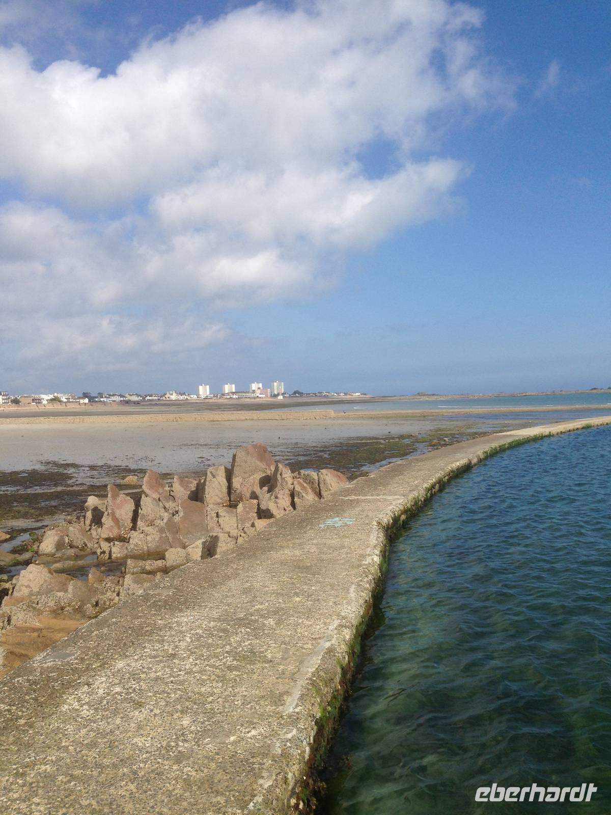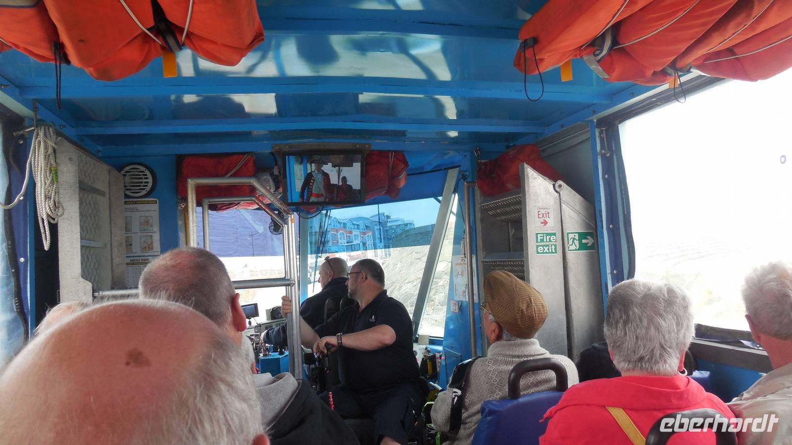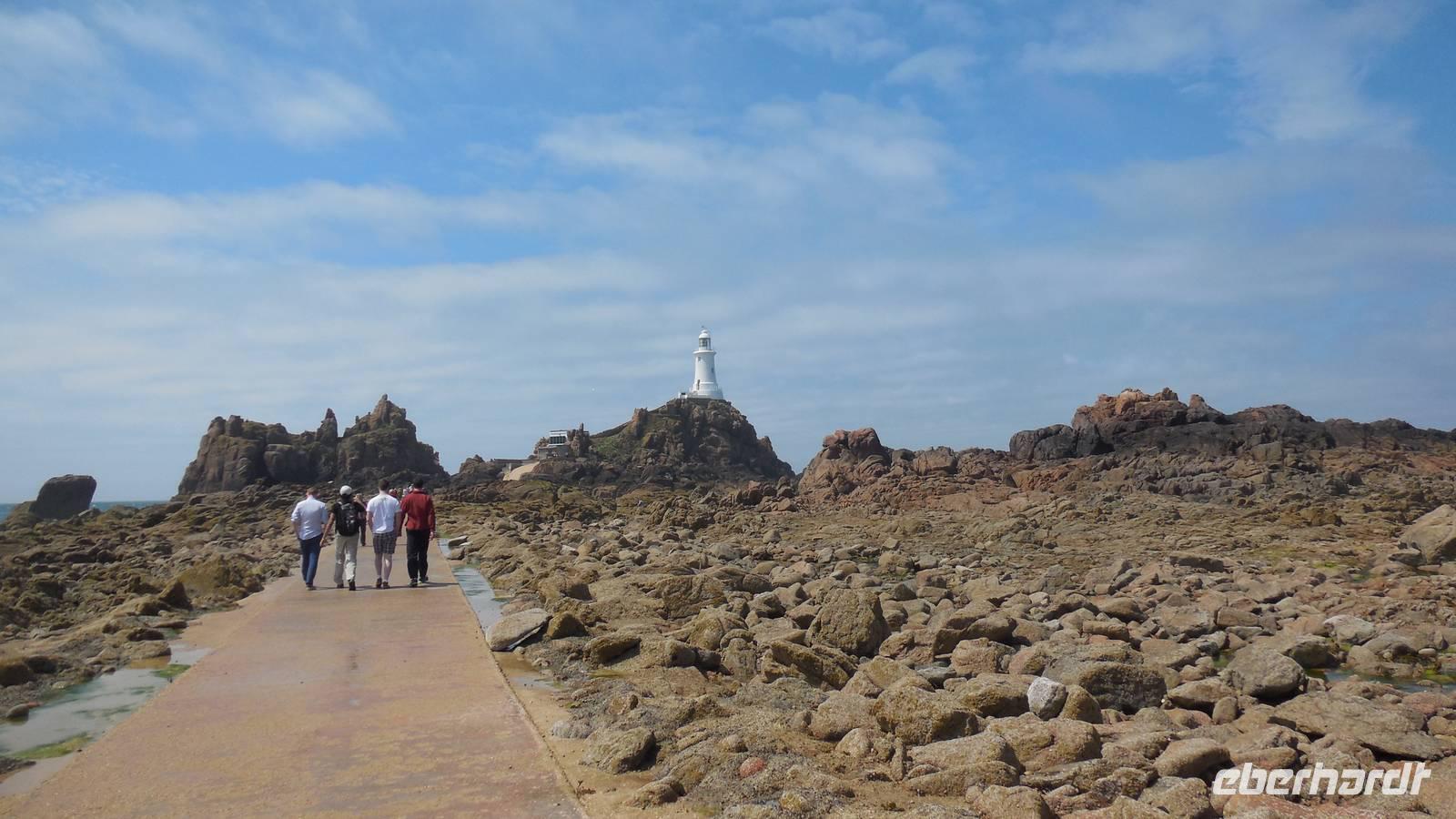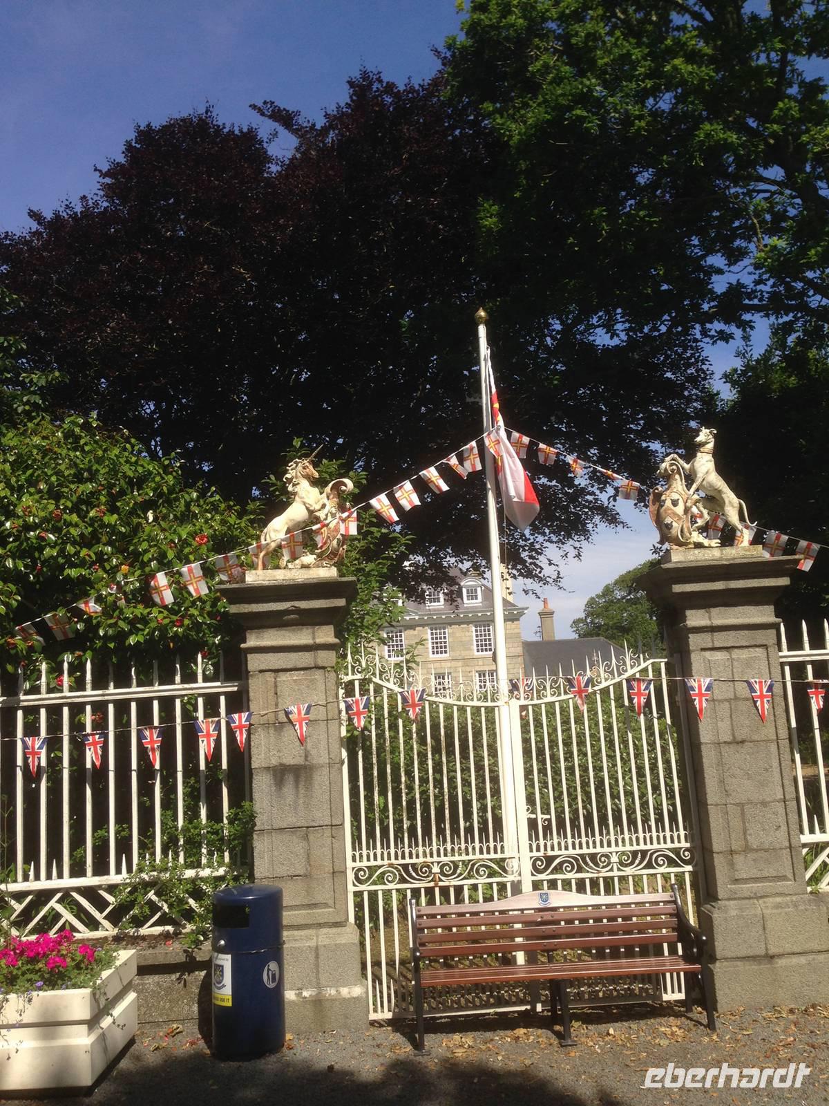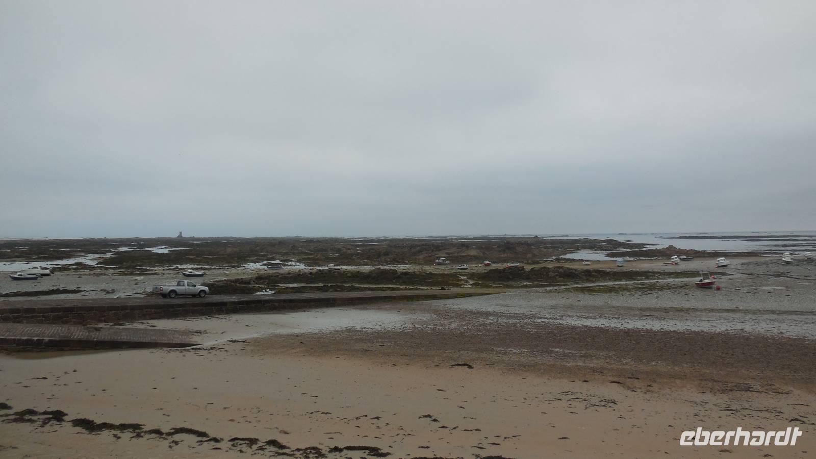 Der heutige Tag steht uns zur freien Verfügung. Am Morgen entscheiden wir uns für einen gemeinsamen Besuch des Elizabeth Castles in St. Helier. Nach einem langem Weg und einem Fotostopp an der Steam Clock erreichen wir den Hafen. Bei Ebbe kann man hier zu Fuß zum Elizabeth Castle spazieren. Wir fahren Pflastermüde mit einem Amphibienfahrzeug, der „castle ferry" hinüber zur Burg. Das ulkige Fahrzeug (halb Bus, halb Boot) bringt uns mit dem noch witzigeren Sicherheitsvideo von Soldaten zum Lachen. Wir genießen die Überfahrt und begeben uns zur richtigen Zeit an den richtigen Ort, denn um kurz vor zwölf kommen wir in den Genuss des Kanonenschusses. Bei einer lustigen Zeremonie mit freiwilligen Soldaten, in diesem Falle Besucher, die das Marschieren erlernen müssen, wird eine Kanone gereinigt, geladen und abgefeuert. Der Knall ist lauter als gedacht und auch oben auf der Burg laut zu vernehmen. Nachdem wir uns die hübsche, verwinkelte uns sehr gut erhaltene Burg zur Genüge angeschaut haben begeben wir uns per castle ferry zurück ans Ufer von St. Helier und fahren mit dem Little Train, einem kleinen zugähnlichen Gefährt Richtung St. Aubin. Dort genießen wir den Rest des Tages bei einem leckeren Kaffee oder Jersey-Eiscreme oder mit weiteren Erkundungen der vielfältigen Gegend.