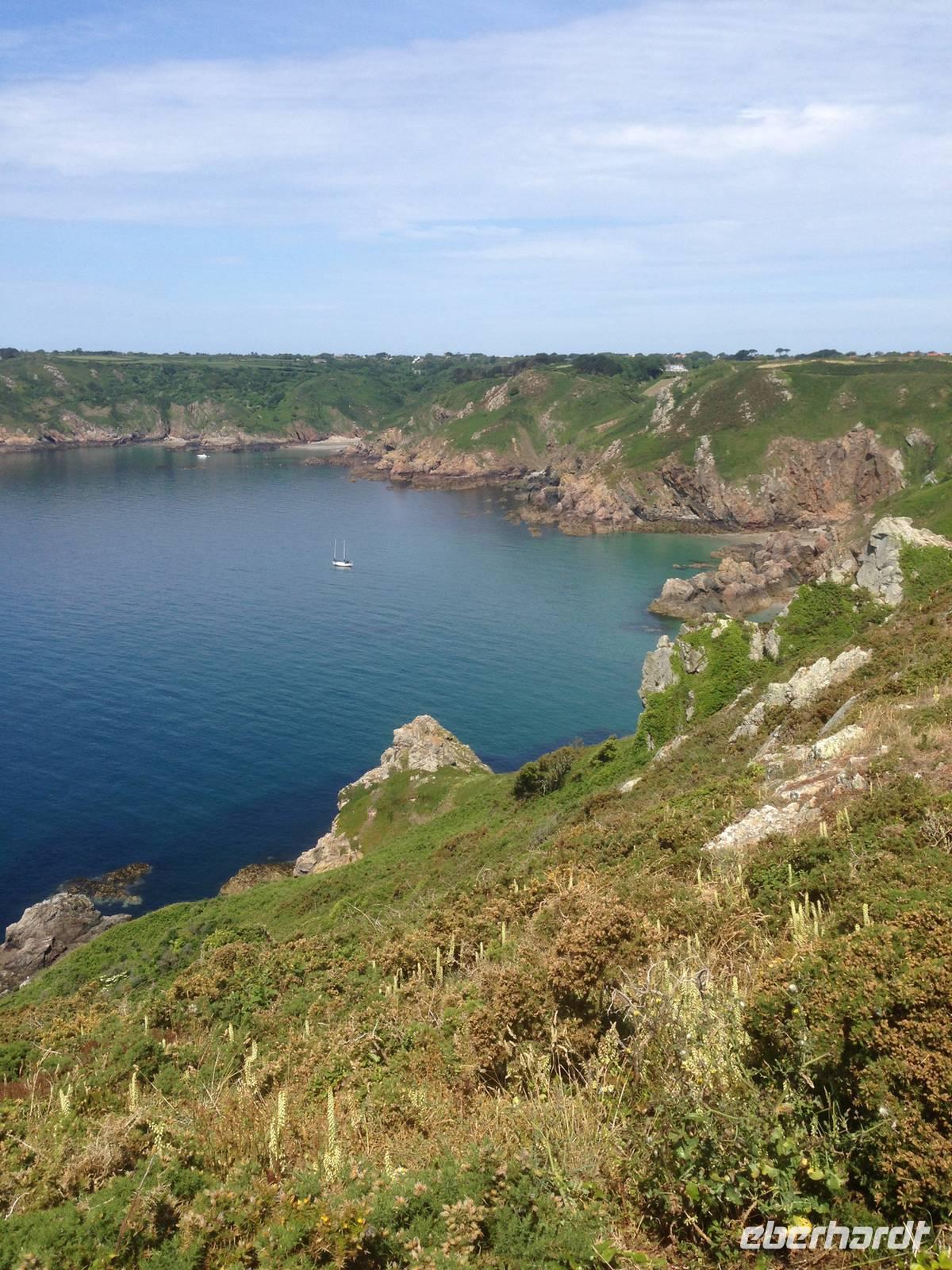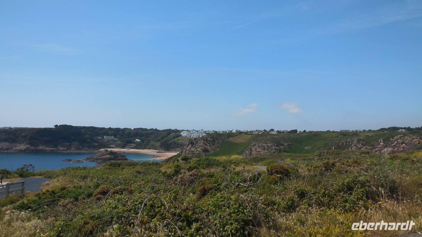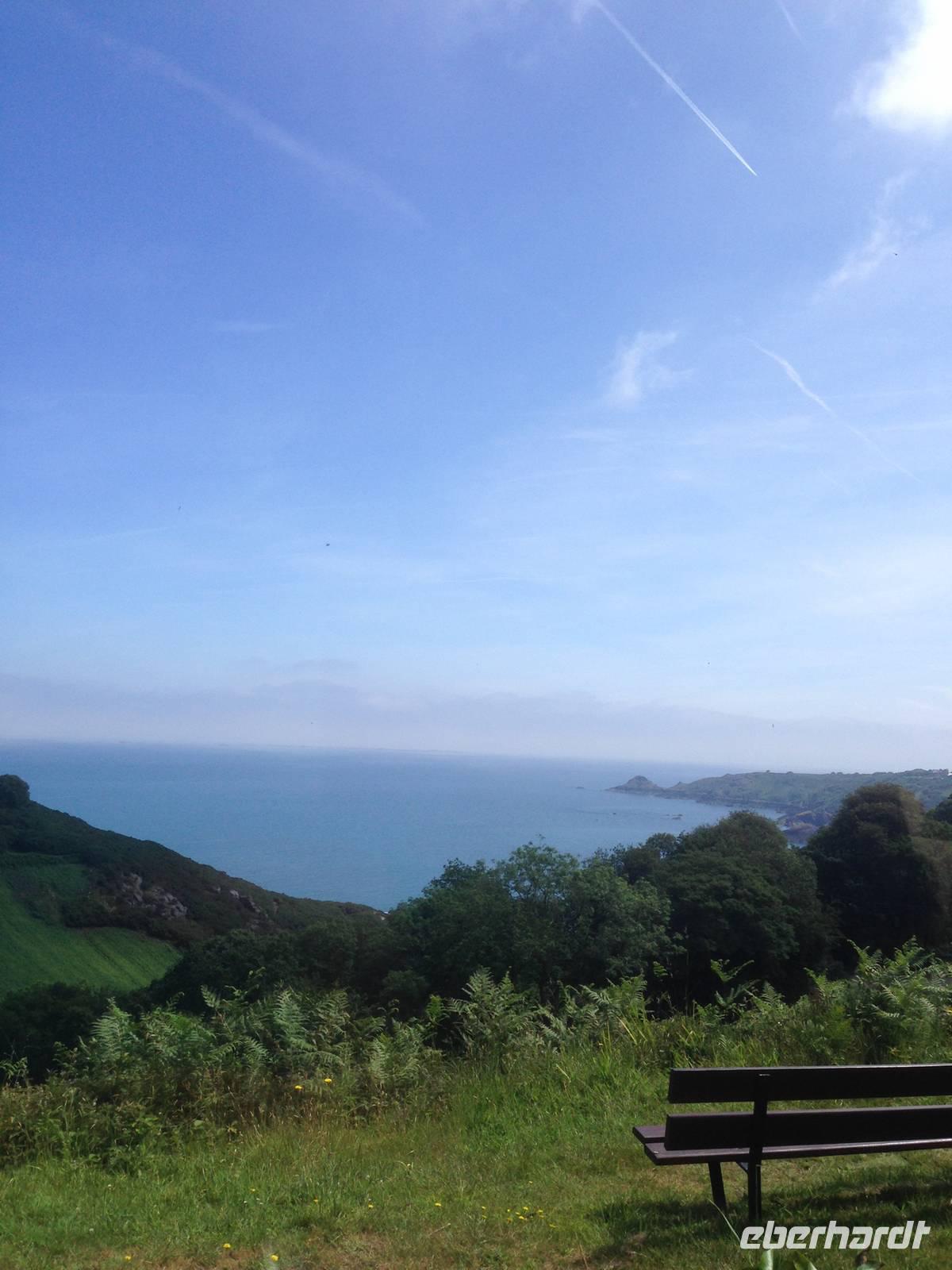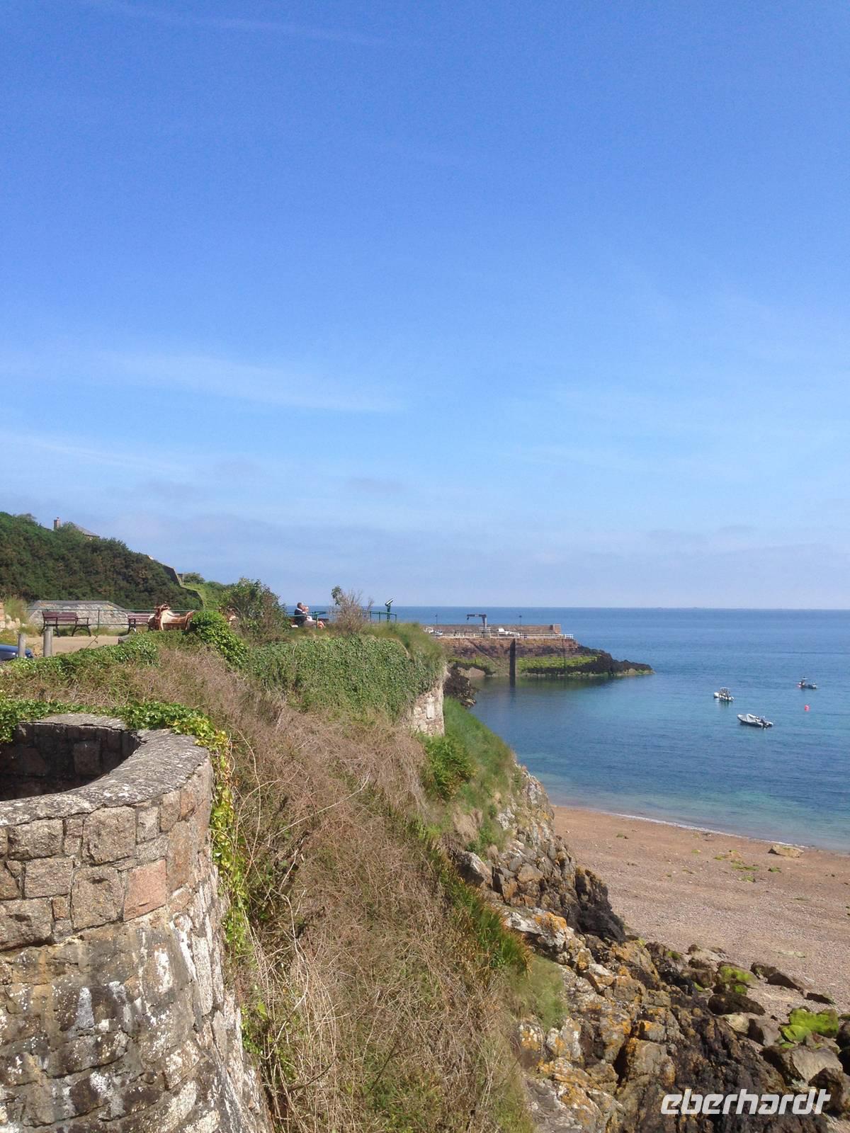 Auf unserer Weiterfahrt durch den Bezirk St. John, sehen wir die Bonne Nuit Bay (Gute-Nacht-Bucht) und den nördlichsten Punkt der Insel, den Sorrel Point. Uns bietet sich, dank tagelangen Königswetters, Blick auf die vorgelagerten Inseln Sark, Jethou, Guernsey und die Küste der Normandie. Ebenso der ideale Ort für ein erstes gemeinsames Gruppenfoto. Angekommen in der Bucht Grev de Lecq legen wir eine Mittagspause ein. Wir genießen ein leckeres Sandwich mit Garnelen oder begeben uns auf Souvenirsuche. Vor der Bucht erhebt sich ein Martello Turm, umgeben von feinem, leicht rötlichen Sand.