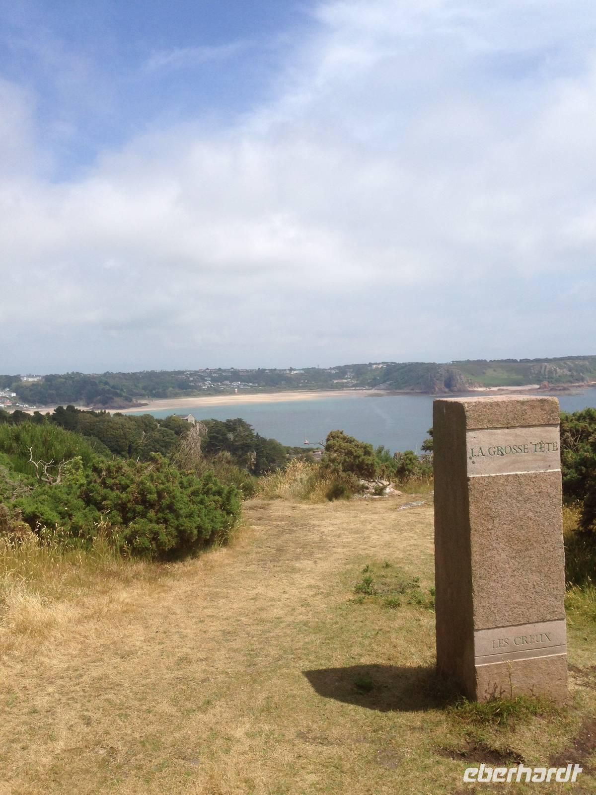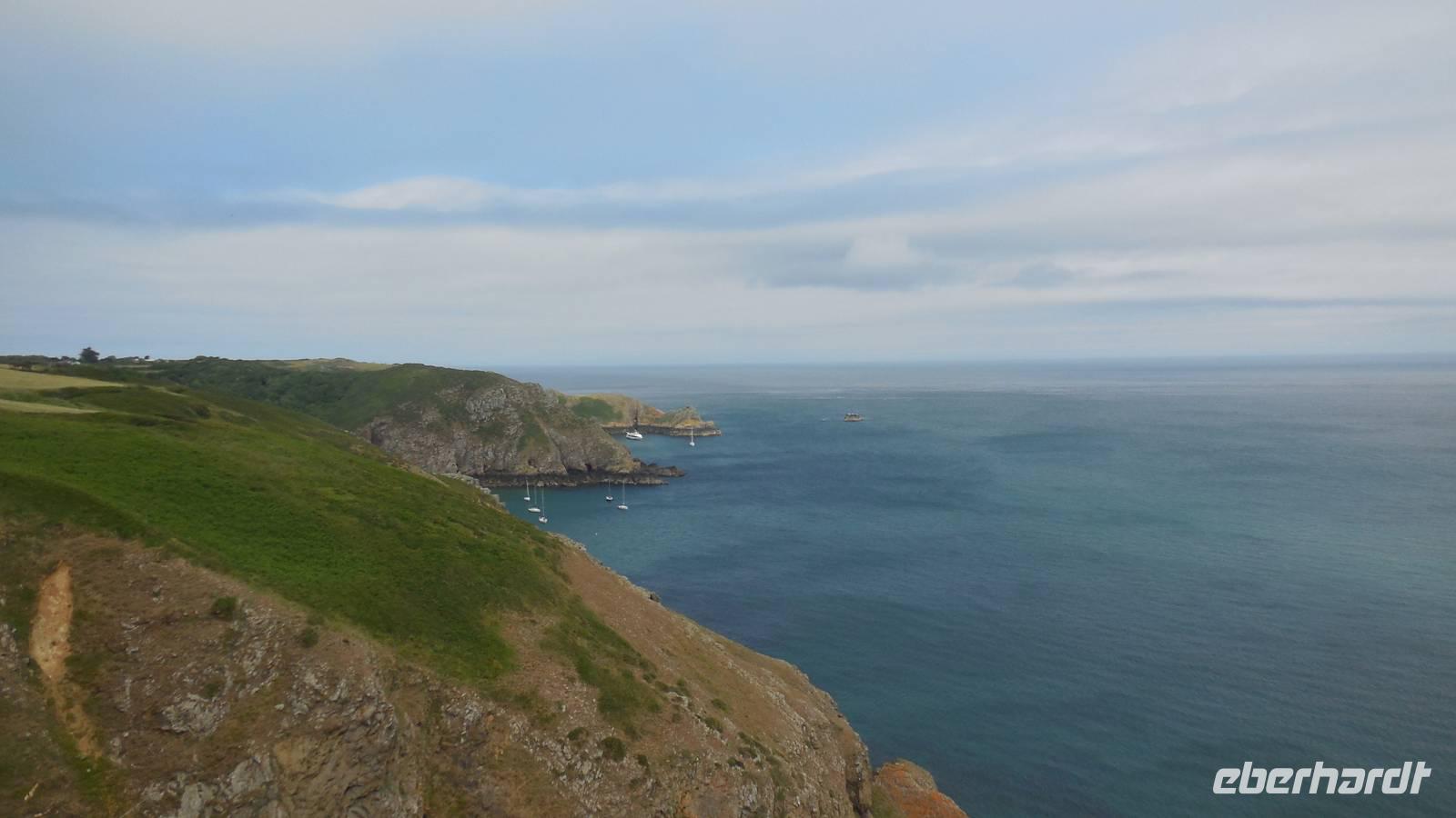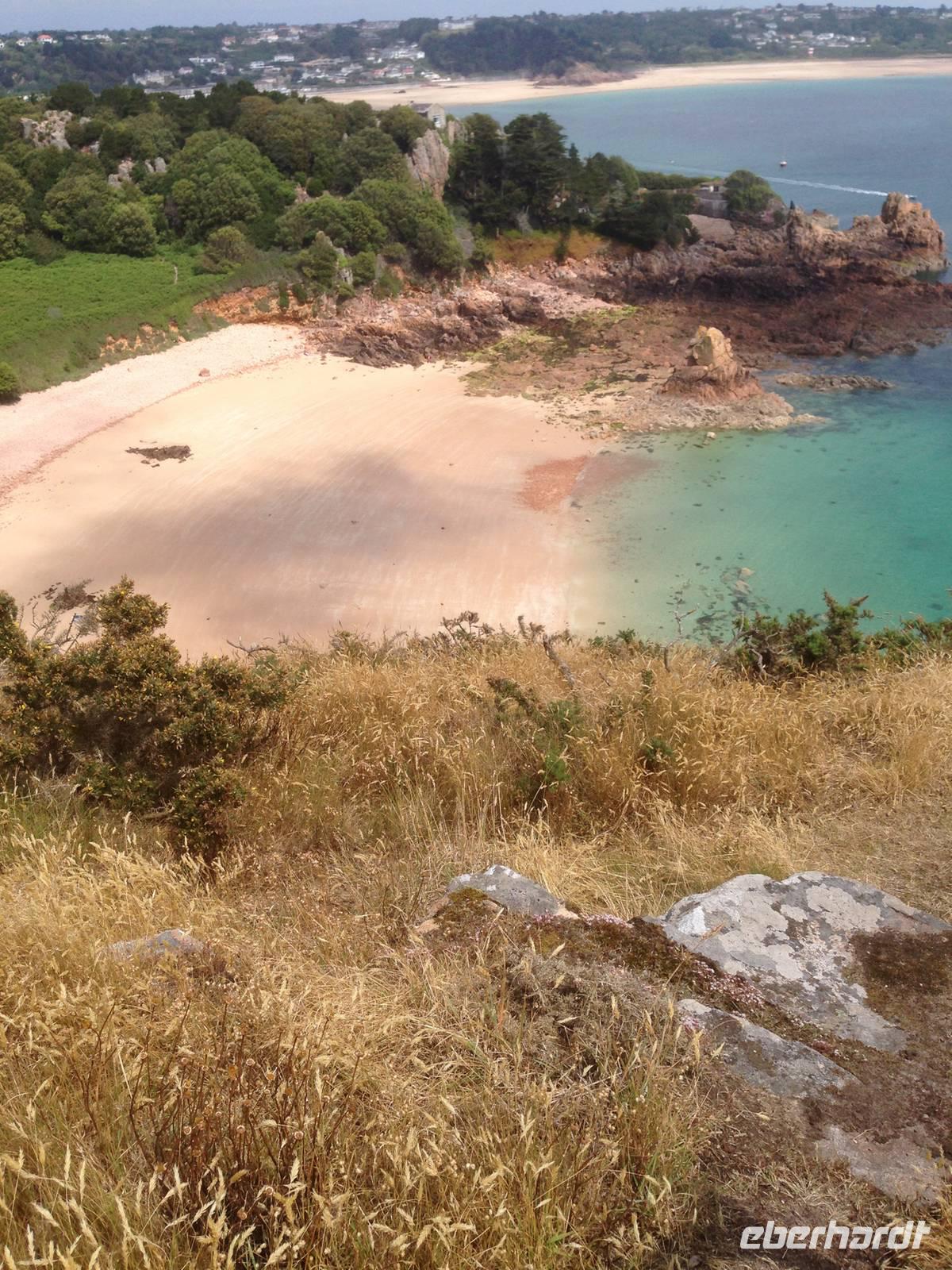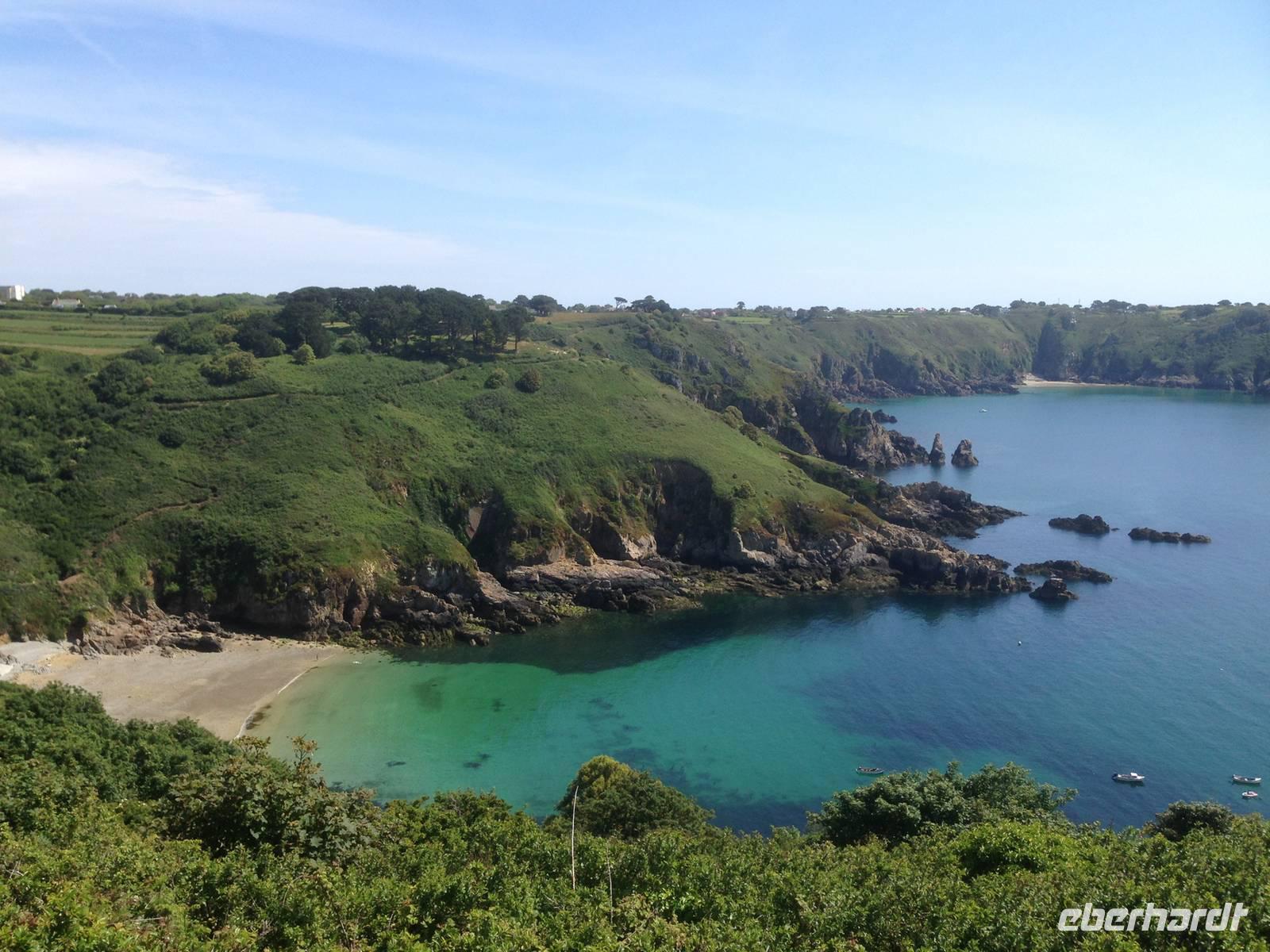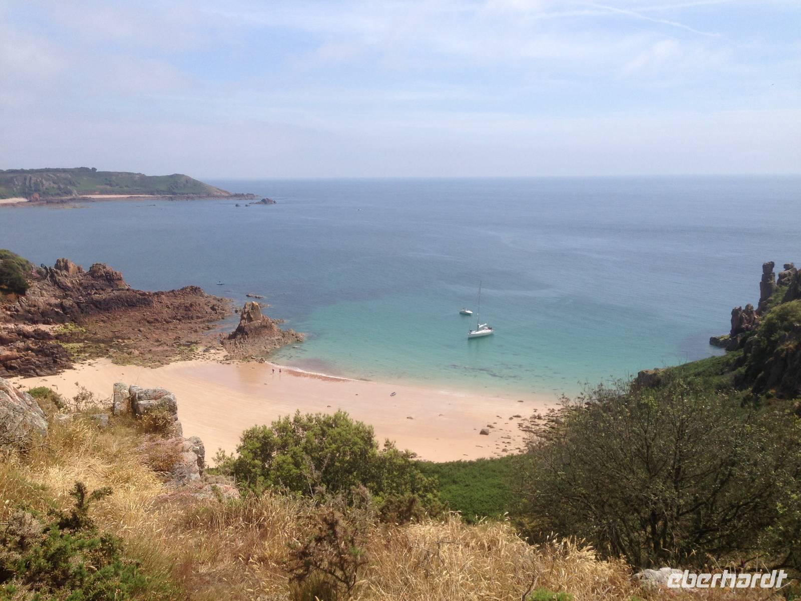 Auf unserer Weiterfahrt durch den Bezirk St. John, sehen wir die Bonne Nuit Bay (Gute-Nacht-Bucht) und den nördlichsten Punkt der Insel, den Sorrel Point. Uns bietet sich, dank tagelangen Königswetters, Blick auf die vorgelagerten Inseln Sark, Jethou, Guernsey und die Küste der Normandie. Ebenso der ideale Ort für ein erstes gemeinsames Gruppenfoto. Angekommen in der Bucht Grev de Lecq legen wir eine Mittagspause ein. Wir genießen ein leckeres Sandwich mit Garnelen oder begeben uns auf Souvenirsuche. Vor der Bucht erhebt sich ein Martello Turm, umgeben von feinem, leicht rötlichen Sand.