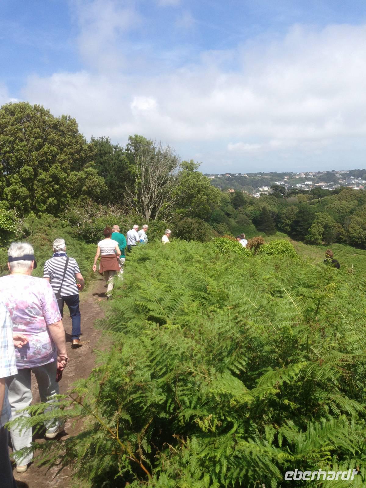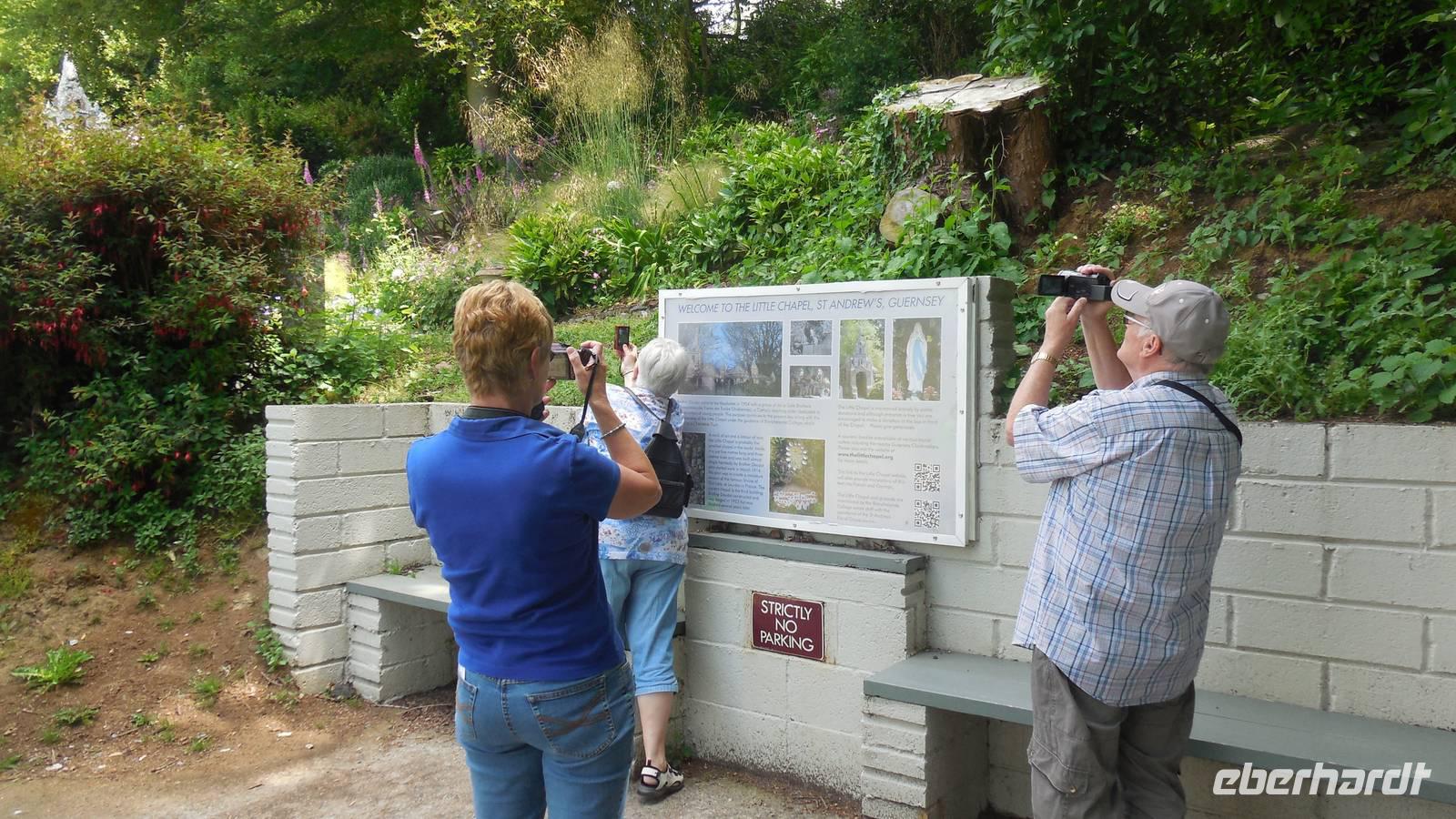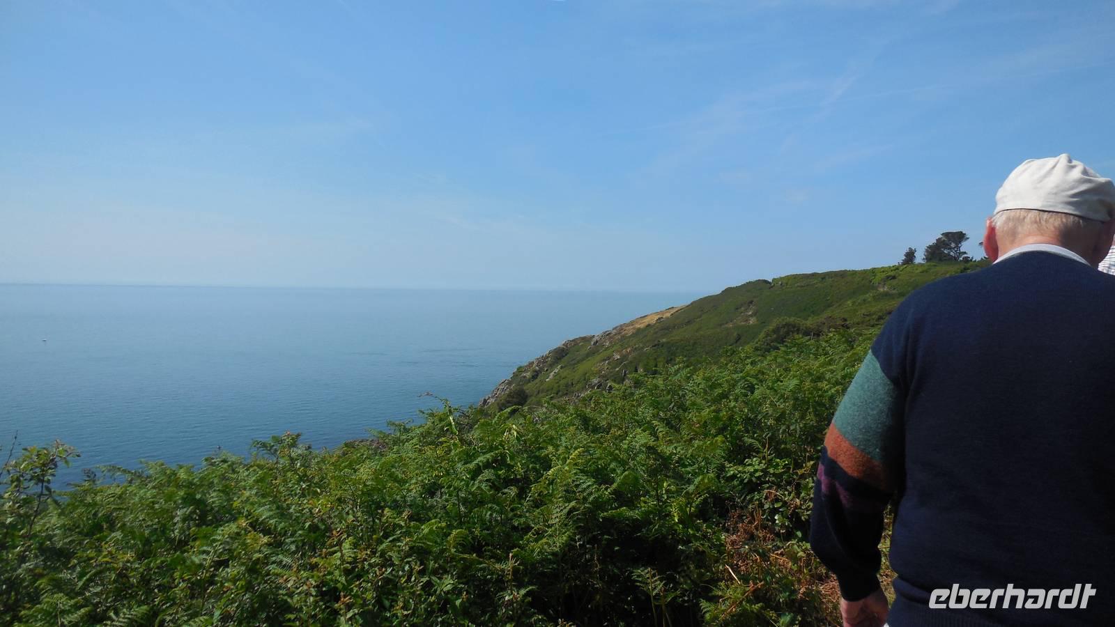 Nach dem Frühstück begeben sich alle Reisefreunde mit der Schnellfähre aus Frankreich auf die Schwesterinsel Jerseys, nach Guernsey. Heidi bringt uns bis zum Hafen und begleitet uns den ganzen Tag auf der Insel. Nach der Fährüberfahrt lernen wir schon mal das romantisch-verträumte Hafenstädtchen St. Peter Port kennen. Am Hafen angekommen steigen wir dann in unseren Bus ein, der uns an die Südwestküste bringt. Auf unserer Klippenwanderung hoch über der Saints Bay, kommen wir wieder in den Genuss von Sonnenstrahlen und einem Anblick von herrlichen Buchten! Herrlich sind diese Ausblicke, die sich bieten - wie sich das türkis-blaue Meer an den rauen Felsen bricht, die saftig-grünen Steilhänge der Insel, die kreischenden Möwen über den Felsenschluchten, der schmale Klippenpfad, der von fruchtig-frischen voll hängenden Brombeersträuchern umrahmt wird. Wunderbar! Wir sehen eine schmale, hochgewachsene Pflanze mit kleinen blauen Blüten, die uns am Vortag bereits aufgefallen ist. Wir erfahren, dass diese Pflanze Echium pininana oder Natternkopf heißt. Die Little Chapel - die kleinste Kirche der Welt ist unser nächstes Ziel und absoluter Höhepunkt des Tages. Aus vielen kleinen Keramikscherben wurde dieses kleine Schmuckstück errichtet bzw. damit liebevoll verziert. Tausende, dieser Scherben, bunt gemischt und zusammengestellt schmücken jeden Zentimeter dieser kleinen Kirche. Wirklich faszinierend. Auf unserer Fahrt über die Insel erzählt uns Heidi ein bisschen was über den kleinen Inselstaat. Guernsey ist ein Inselstaat, mit eigener Regierung und eigenen Reisepässen. Es gibt sogar eine eigene Währung, das Guernsey-Pfund. Beim Mittagessen am Fort Grey stärken wir uns mit Fish&Chips oder mit einer kräftig-herzhaften Suppe! Wir fahren weiter mit dem Bus in Richtung Norden und sehen noch einige schöne Buchten vom Bus aus. Eine der schönsten Buchten ist die von Cobo Bay. Am Nachmittag heißt es die Hauptstadt von Guernsey richtig erkunden. Am Hang gelegen zieren St. Peter Port hübsche Häuschen bis hinunter zum Hafen mit den weißen Yachten. Wir spazieren zunächst durch eine wunderschöne Parkanlage, in welcher die hier arbeitenden Banker Ihre Mittagspause genießen. Hier wachsen Kamelien, Magnolien, Azaleen und Hortensien mit prächtigen Palmen um die Wette. Es bietet sich uns ein atemberaubender Blick durch das kleine grüne Paradies bis hinunter zum Meer. Am Rande des Parks steht die windzerzauste Statue vom Schriftsteller Victor Hugo, der auf Guernsey im Exil lebte. Das bekannte Werk „Les Miserables" wurde hier auf Guernsey veröffentlicht. Unsere Reiseleiterin Heidi gibt noch etwas Inselklatsch zum Besten. So erfahren wir, das seine Gattin, wo auch immer sie lebten, die ständige Anwesenheit seiner Geliebten dulden musste.