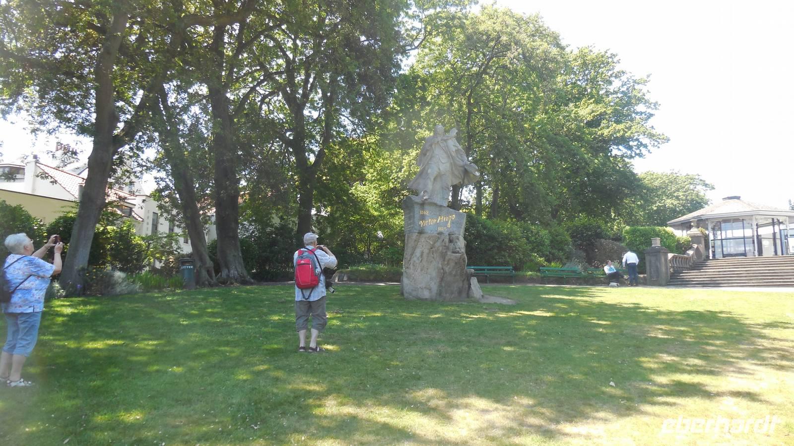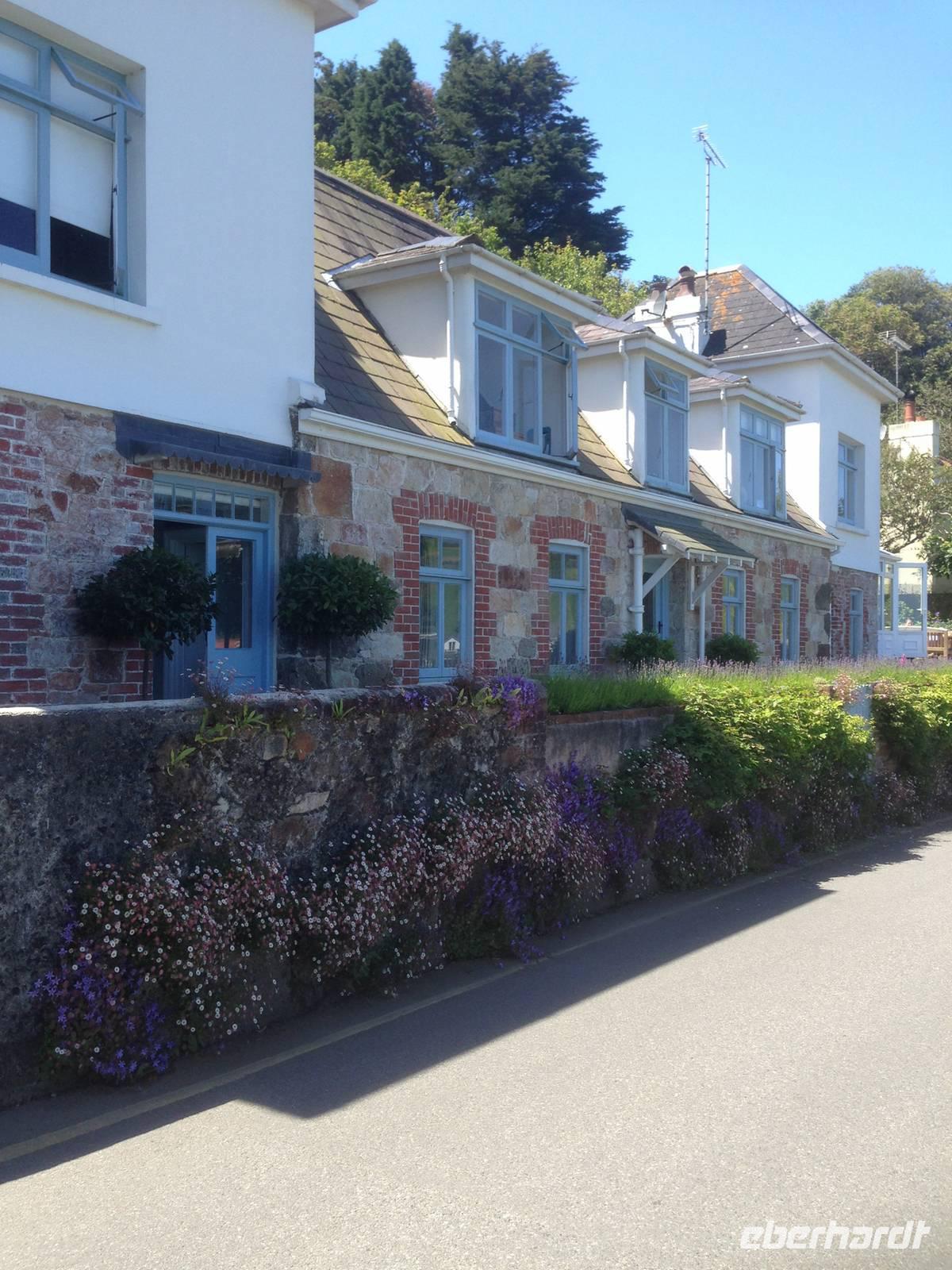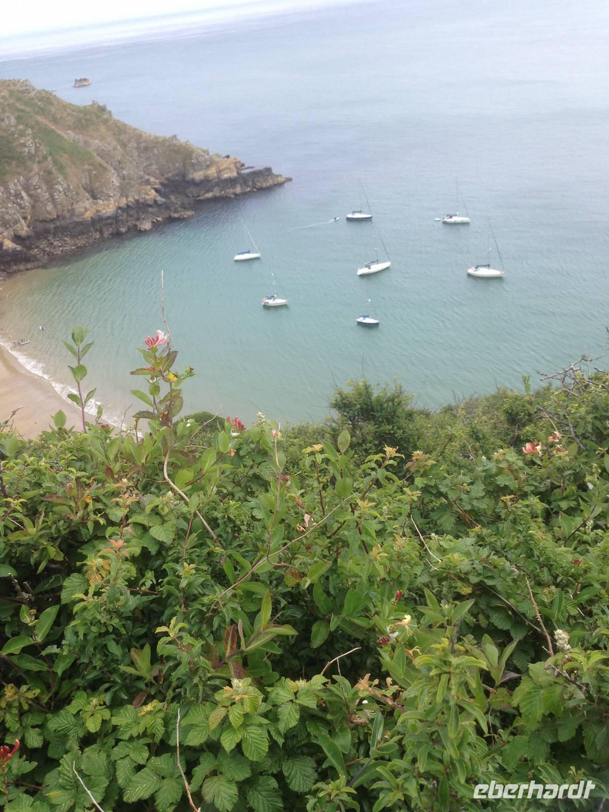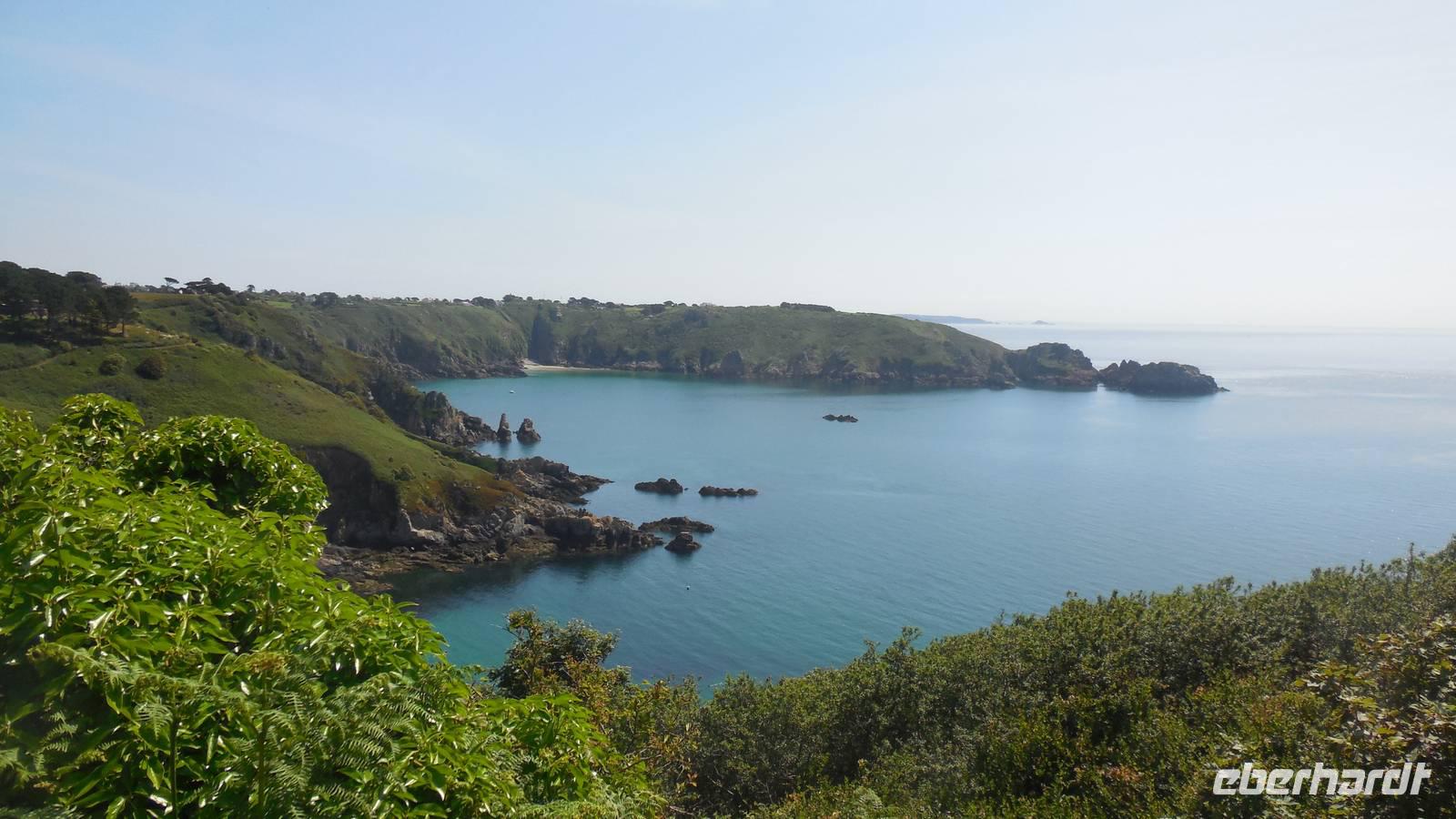 Nach dem Frühstück begeben sich alle Reisefreunde mit der Schnellfähre aus Frankreich auf die Schwesterinsel Jerseys, nach Guernsey. Heidi bringt uns bis zum Hafen und begleitet uns den ganzen Tag auf der Insel. Nach der Fährüberfahrt lernen wir schon mal das romantisch-verträumte Hafenstädtchen St. Peter Port kennen. Am Hafen angekommen steigen wir dann in unseren Bus ein, der uns an die Südwestküste bringt. Auf unserer Klippenwanderung hoch über der Saints Bay, kommen wir wieder in den Genuss von Sonnenstrahlen und einem Anblick von herrlichen Buchten! Herrlich sind diese Ausblicke, die sich bieten - wie sich das türkis-blaue Meer an den rauen Felsen bricht, die saftig-grünen Steilhänge der Insel, die kreischenden Möwen über den Felsenschluchten, der schmale Klippenpfad, der von fruchtig-frischen voll hängenden Brombeersträuchern umrahmt wird. Wunderbar! Wir sehen eine schmale, hochgewachsene Pflanze mit kleinen blauen Blüten, die uns am Vortag bereits aufgefallen ist. Wir erfahren, dass diese Pflanze Echium pininana oder Natternkopf heißt. Die Little Chapel - die kleinste Kirche der Welt ist unser nächstes Ziel und absoluter Höhepunkt des Tages. Aus vielen kleinen Keramikscherben wurde dieses kleine Schmuckstück errichtet bzw. damit liebevoll verziert. Tausende, dieser Scherben, bunt gemischt und zusammengestellt schmücken jeden Zentimeter dieser kleinen Kirche. Wirklich faszinierend. Auf unserer Fahrt über die Insel erzählt uns Heidi ein bisschen was über den kleinen Inselstaat. Guernsey ist ein Inselstaat, mit eigener Regierung und eigenen Reisepässen. Es gibt sogar eine eigene Währung, das Guernsey-Pfund. Beim Mittagessen am Fort Grey stärken wir uns mit Fish&Chips oder mit einer kräftig-herzhaften Suppe! Wir fahren weiter mit dem Bus in Richtung Norden und sehen noch einige schöne Buchten vom Bus aus. Eine der schönsten Buchten ist die von Cobo Bay. Am Nachmittag heißt es die Hauptstadt von Guernsey richtig erkunden. Am Hang gelegen zieren St. Peter Port hübsche Häuschen bis hinunter zum Hafen mit den weißen Yachten. Wir spazieren zunächst durch eine wunderschöne Parkanlage, in welcher die hier arbeitenden Banker Ihre Mittagspause genießen. Hier wachsen Kamelien, Magnolien, Azaleen und Hortensien mit prächtigen Palmen um die Wette. Es bietet sich uns ein atemberaubender Blick durch das kleine grüne Paradies bis hinunter zum Meer. Am Rande des Parks steht die windzerzauste Statue vom Schriftsteller Victor Hugo, der auf Guernsey im Exil lebte. Das bekannte Werk „Les Miserables" wurde hier auf Guernsey veröffentlicht. Unsere Reiseleiterin Heidi gibt noch etwas Inselklatsch zum Besten. So erfahren wir, das seine Gattin, wo auch immer sie lebten, die ständige Anwesenheit seiner Geliebten dulden musste.