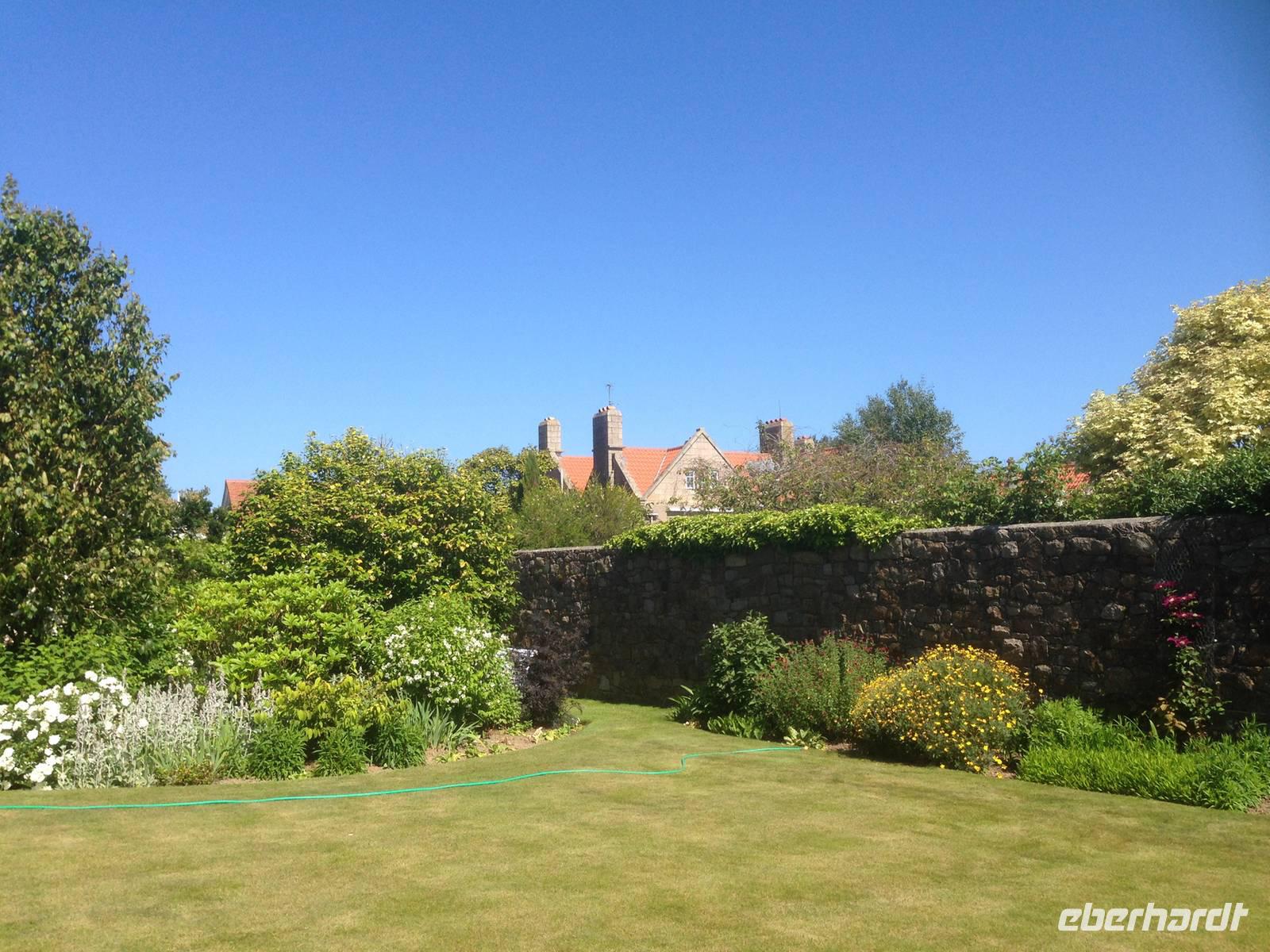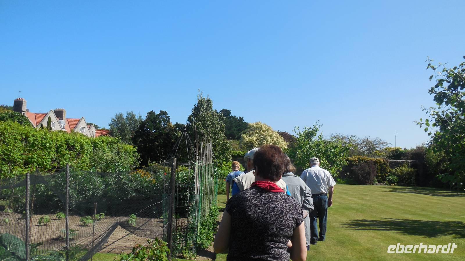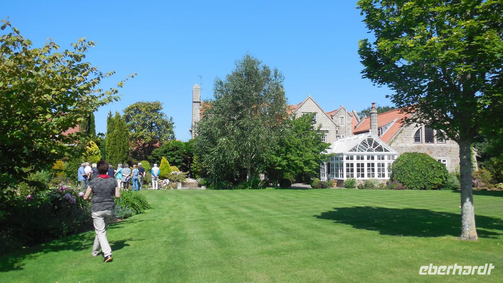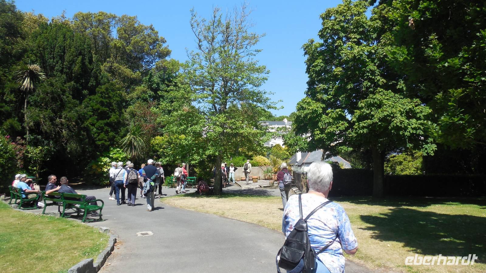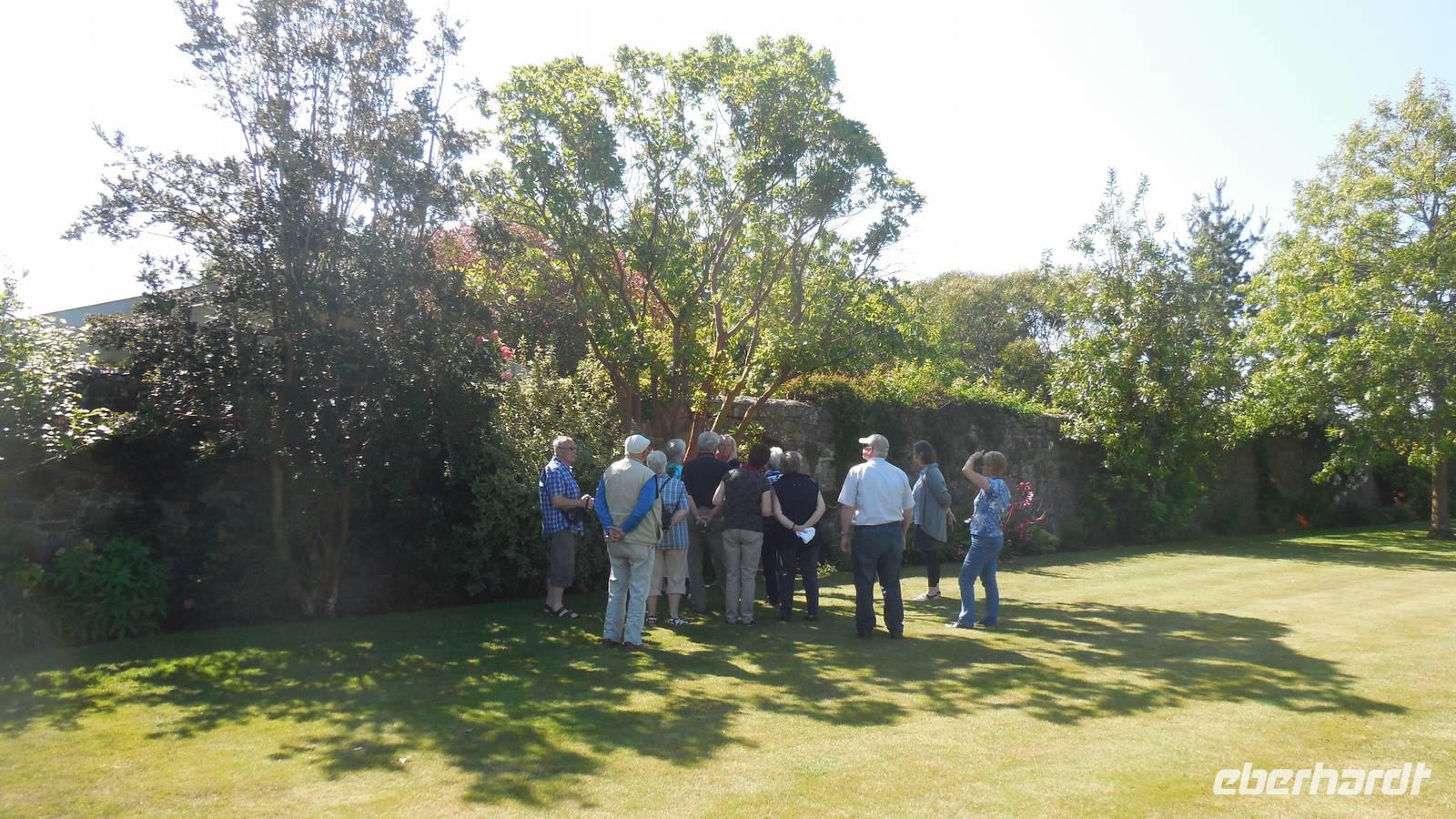 Heute zeigt uns Heidi einige Privatgärten von wohlhabenden Grundbesitzern. Als Erstes fahren wir zum Garten von Mrs. Lie. Voll beeindruckt laufen wir entlang des Cottages hinter in den Garten der Besitzerin. Der Anblick, der sich bietet, fasziniert. Das Anwesen beherbergt Rosen, seltene Baum- und Pflanzenarten. Wir haben noch etwas Zeit und fahren Nach St. Aubin zur Glaskirche St. Matthews Church. Als zweites begrüßt uns in St. Aubin das Anwesen von Mr. Miles. Dieser Herr, ein englischer Gentleman wie wir ihn aus dem Bilderbuch kennen, führt uns durch sein Gärtchen und erklärt uns stolz die seltenen Gewächse und die Geschichte des Hauses. Zwischen Riesenrharbarber, Hortensien, Bananenstauden und Palmen führt er uns auf sattgrünem Rasen zu einem Teich voller Zierfische, welche früher im Winter sogar einen beheizten Pool bekamen.