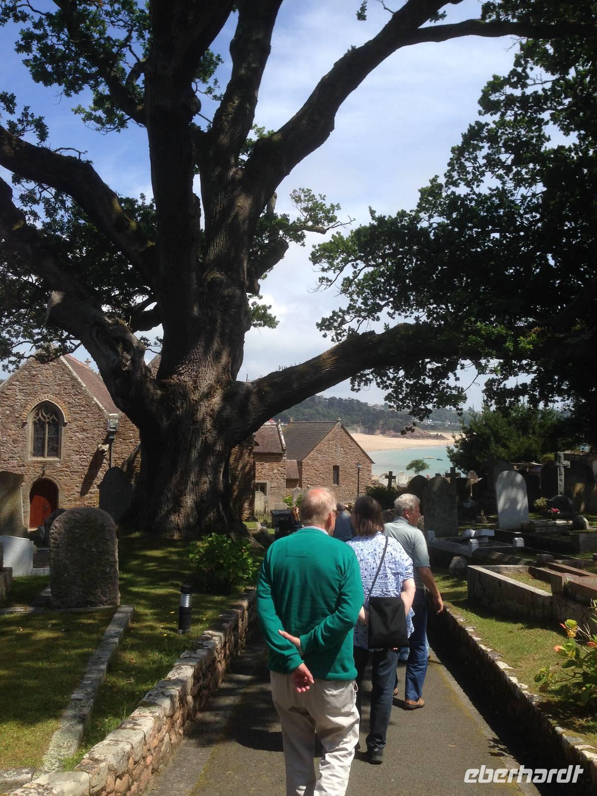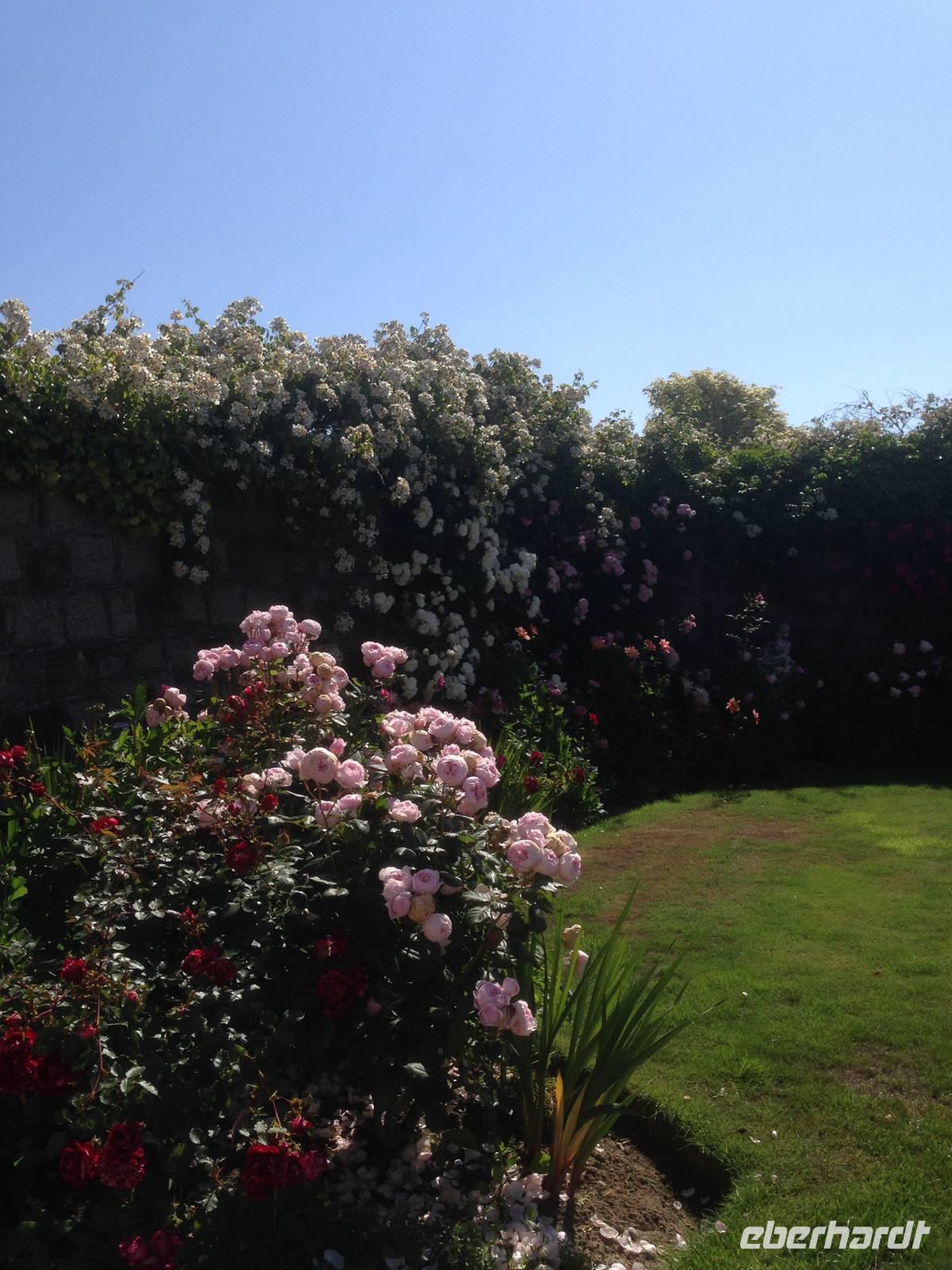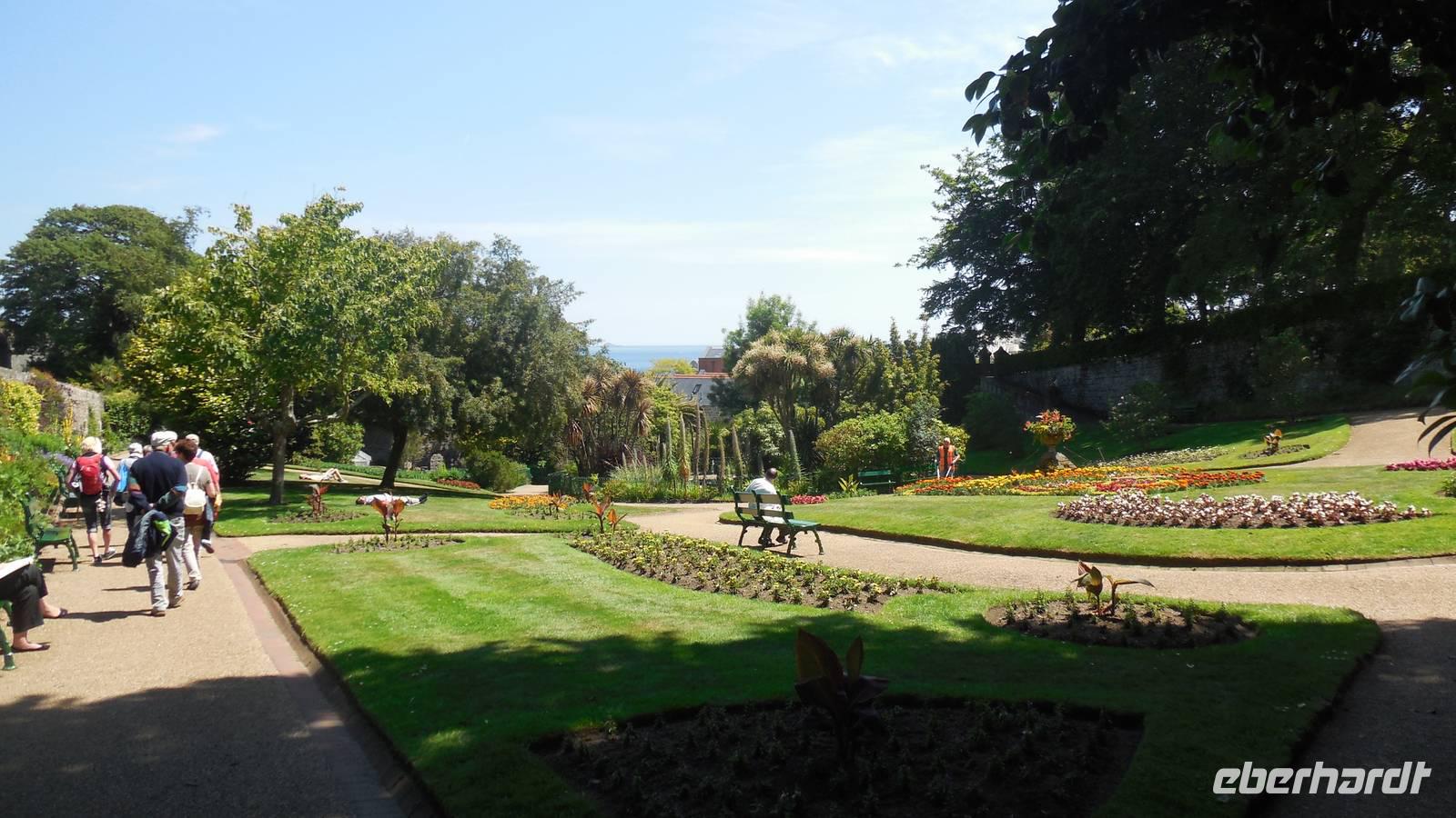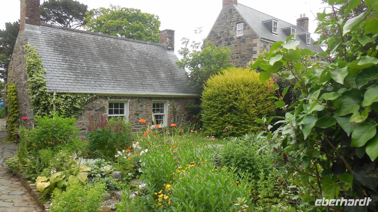 Heute zeigt uns Heidi einige Privatgärten von wohlhabenden Grundbesitzern. Als Erstes fahren wir zum Garten von Mrs. Lie. Voll beeindruckt laufen wir entlang des Cottages hinter in den Garten der Besitzerin. Der Anblick, der sich bietet, fasziniert. Das Anwesen beherbergt Rosen, seltene Baum- und Pflanzenarten. Wir haben noch etwas Zeit und fahren Nach St. Aubin zur Glaskirche St. Matthews Church. Als zweites begrüßt uns in St. Aubin das Anwesen von Mr. Miles. Dieser Herr, ein englischer Gentleman wie wir ihn aus dem Bilderbuch kennen, führt uns durch sein Gärtchen und erklärt uns stolz die seltenen Gewächse und die Geschichte des Hauses. Zwischen Riesenrharbarber, Hortensien, Bananenstauden und Palmen führt er uns auf sattgrünem Rasen zu einem Teich voller Zierfische, welche früher im Winter sogar einen beheizten Pool bekamen.
