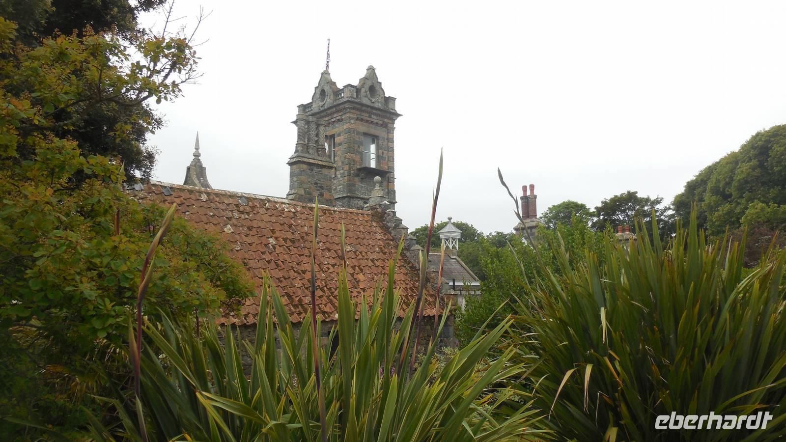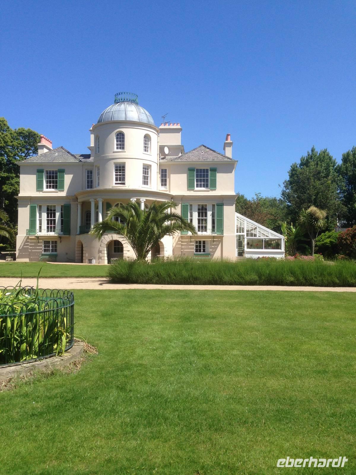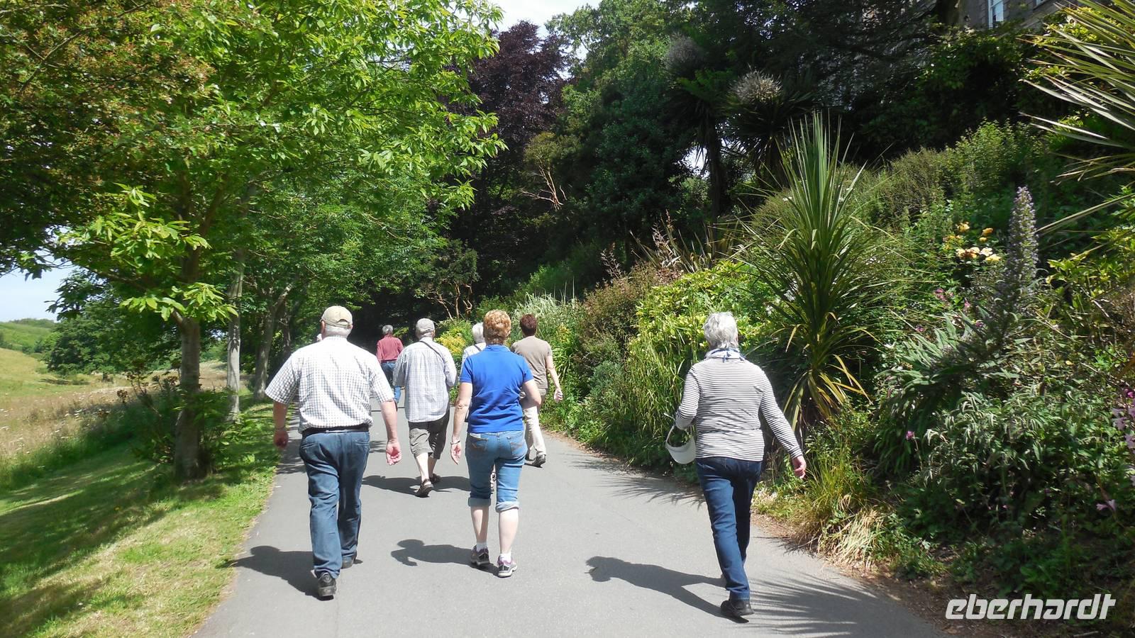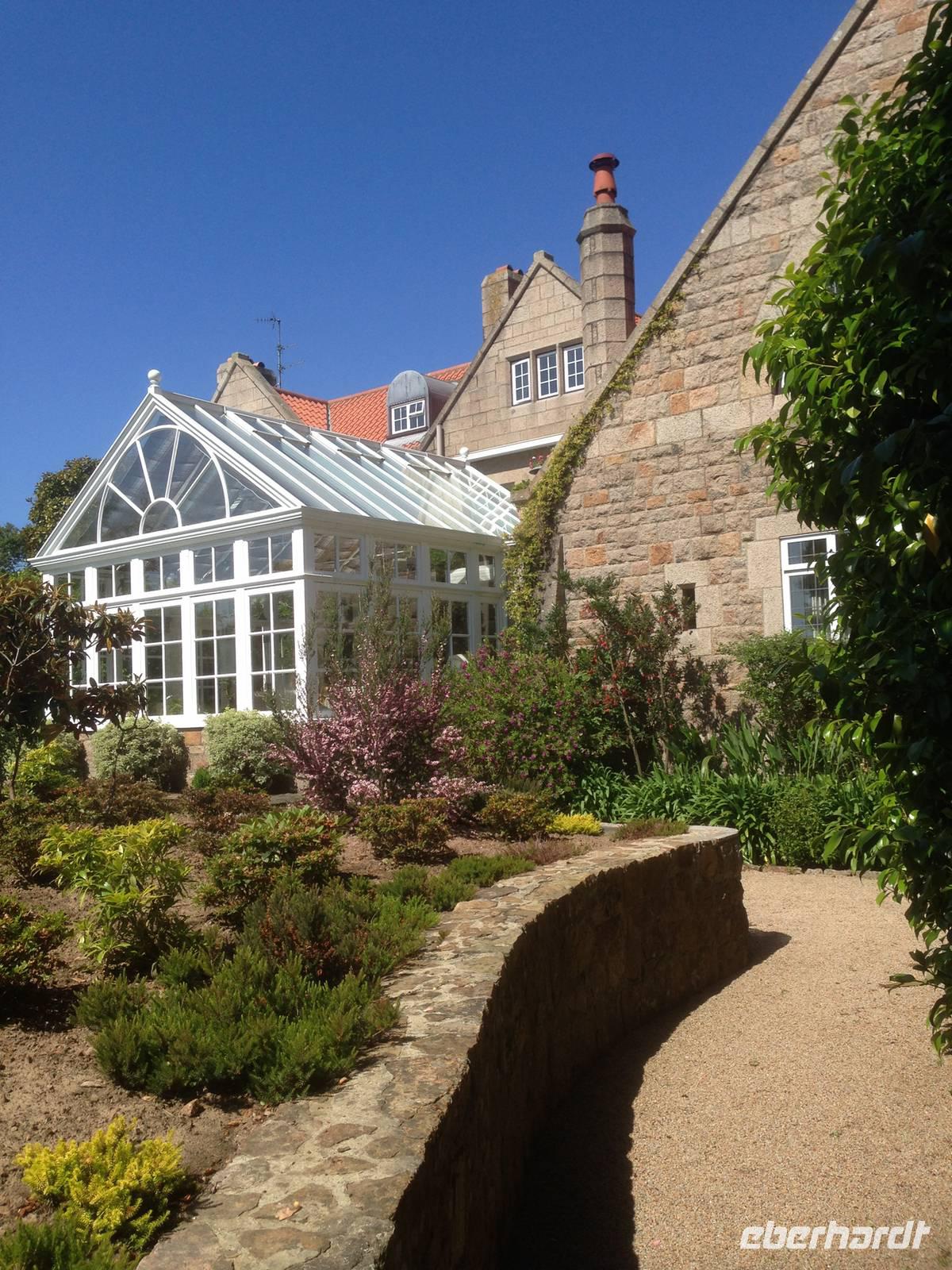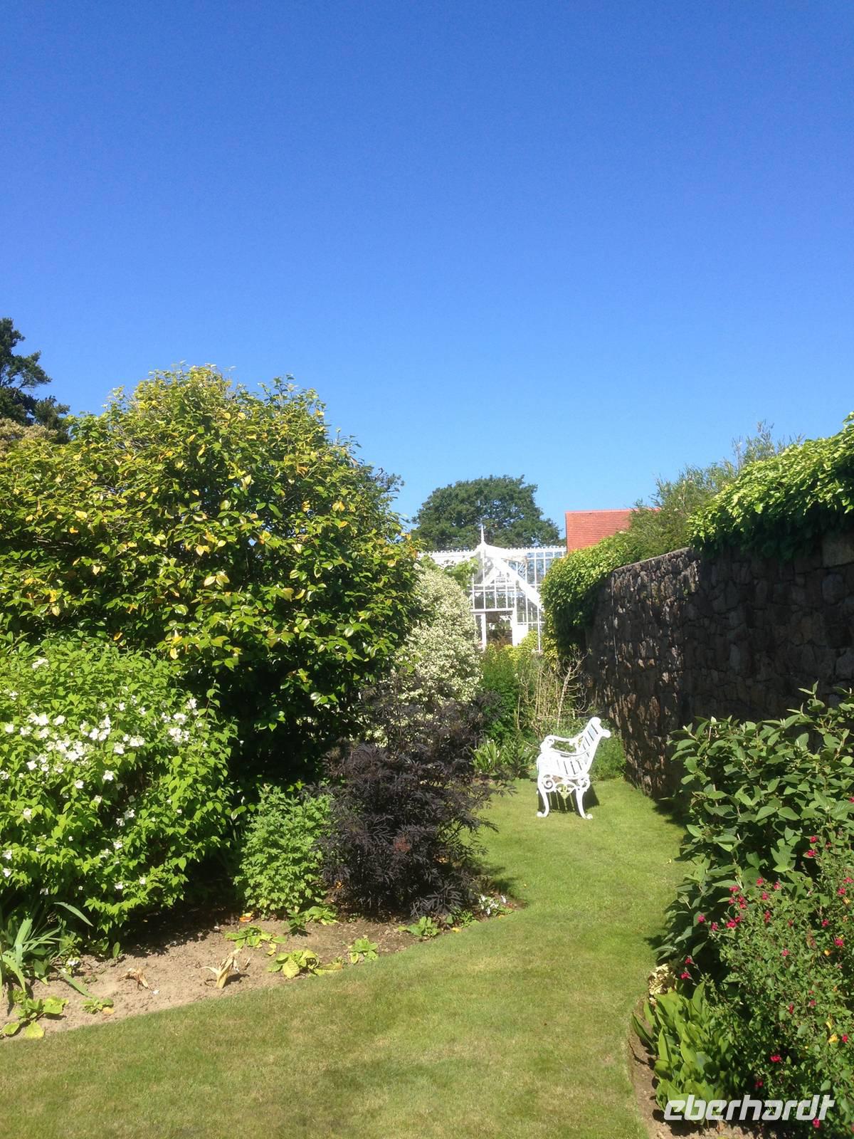 Heute zeigt uns Heidi einige Privatgärten von wohlhabenden Grundbesitzern. Als Erstes fahren wir zum Garten von Mrs. Lie. Voll beeindruckt laufen wir entlang des Cottages hinter in den Garten der Besitzerin. Der Anblick, der sich bietet, fasziniert. Das Anwesen beherbergt Rosen, seltene Baum- und Pflanzenarten. Wir haben noch etwas Zeit und fahren Nach St. Aubin zur Glaskirche St. Matthews Church. Als zweites begrüßt uns in St. Aubin das Anwesen von Mr. Miles. Dieser Herr, ein englischer Gentleman wie wir ihn aus dem Bilderbuch kennen, führt uns durch sein Gärtchen und erklärt uns stolz die seltenen Gewächse und die Geschichte des Hauses. Zwischen Riesenrharbarber, Hortensien, Bananenstauden und Palmen führt er uns auf sattgrünem Rasen zu einem Teich voller Zierfische, welche früher im Winter sogar einen beheizten Pool bekamen.