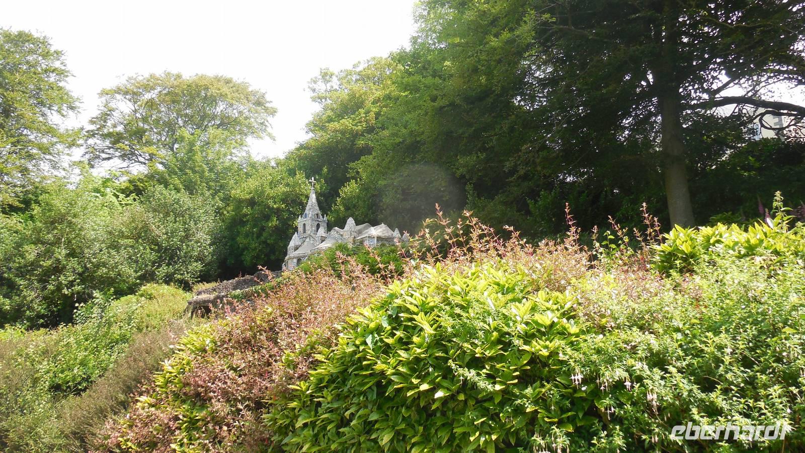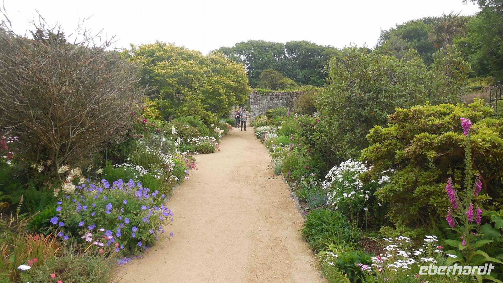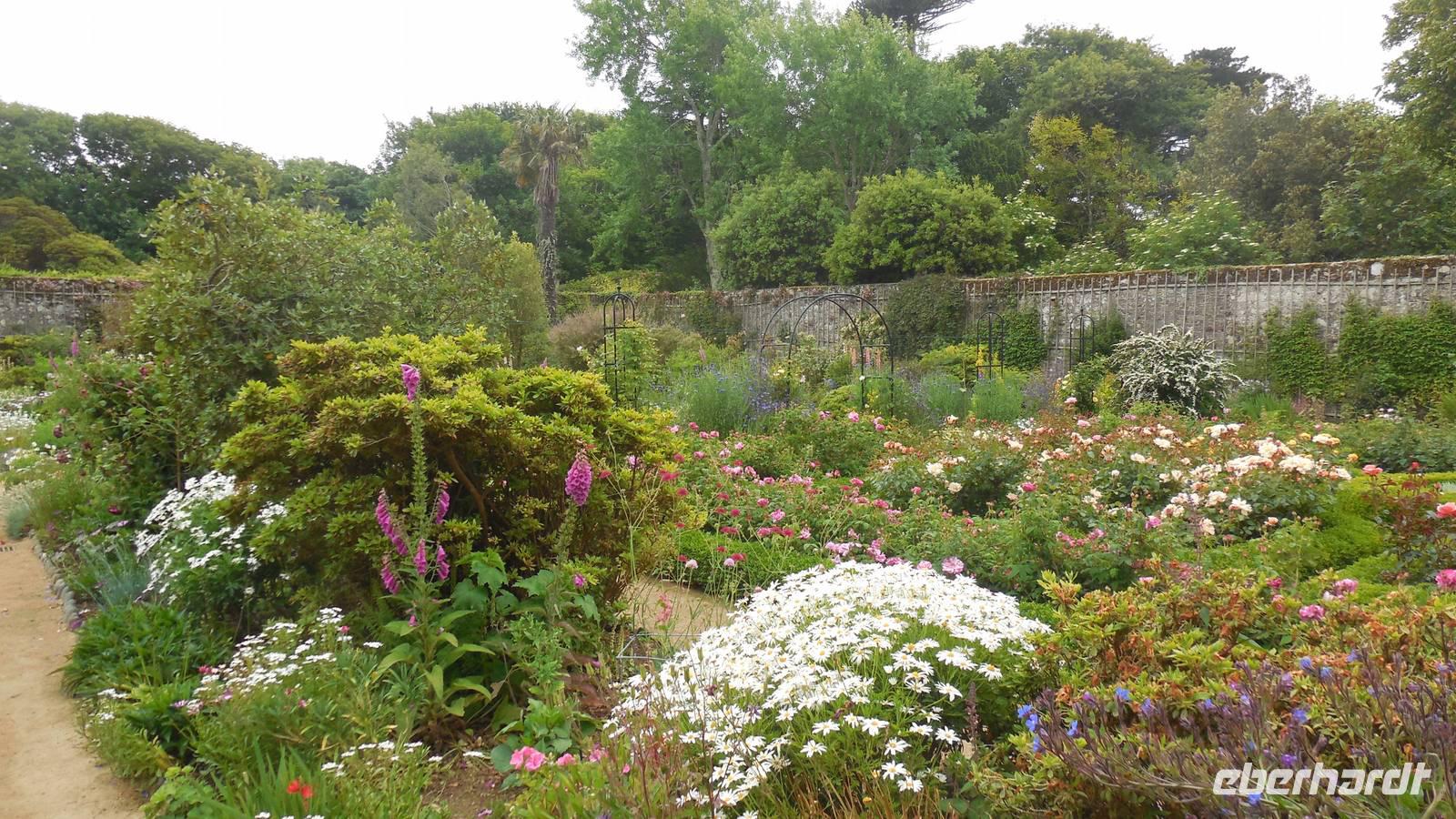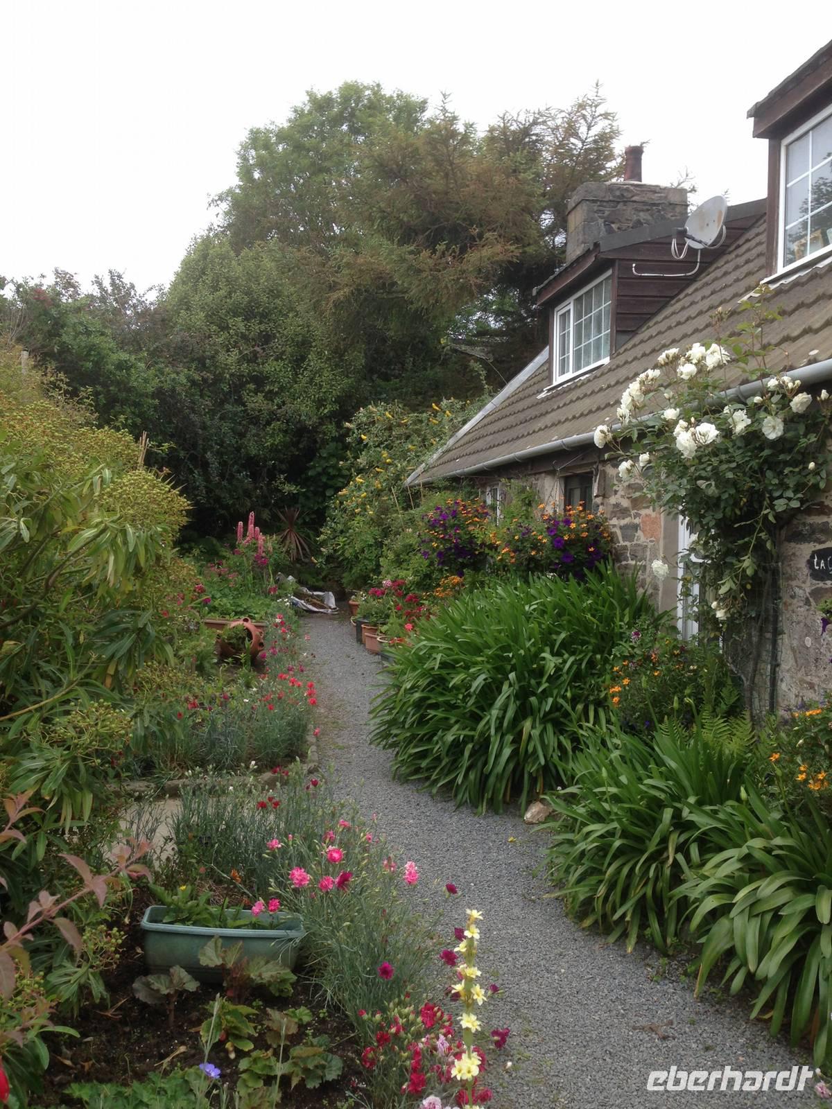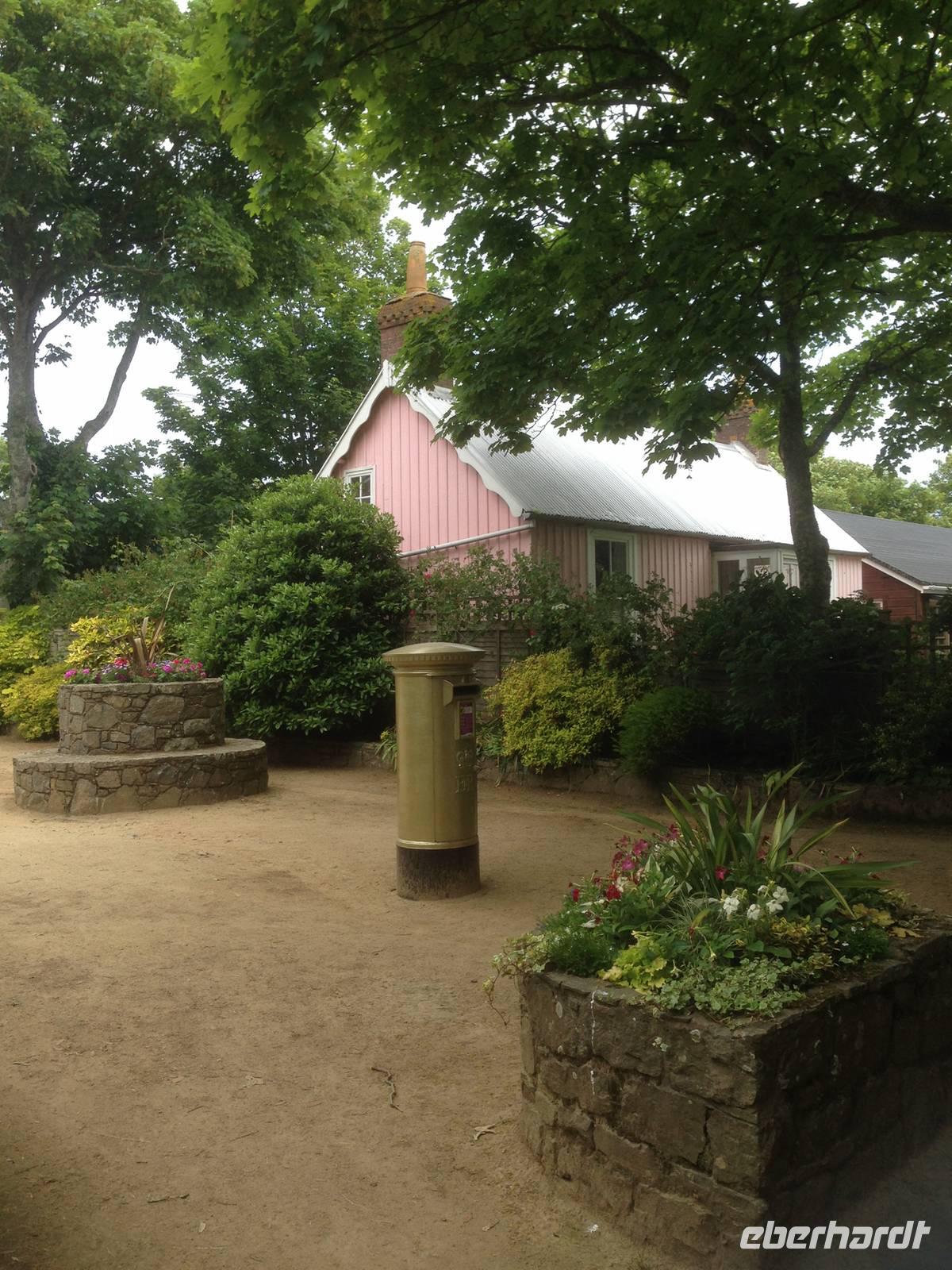 Heute zeigt uns Heidi einige Privatgärten von wohlhabenden Grundbesitzern. Als Erstes fahren wir zum Garten von Mrs. Lie. Voll beeindruckt laufen wir entlang des Cottages hinter in den Garten der Besitzerin. Der Anblick, der sich bietet, fasziniert. Das Anwesen beherbergt Rosen, seltene Baum- und Pflanzenarten. Wir haben noch etwas Zeit und fahren Nach St. Aubin zur Glaskirche St. Matthews Church. Als zweites begrüßt uns in St. Aubin das Anwesen von Mr. Miles. Dieser Herr, ein englischer Gentleman wie wir ihn aus dem Bilderbuch kennen, führt uns durch sein Gärtchen und erklärt uns stolz die seltenen Gewächse und die Geschichte des Hauses. Zwischen Riesenrharbarber, Hortensien, Bananenstauden und Palmen führt er uns auf sattgrünem Rasen zu einem Teich voller Zierfische, welche früher im Winter sogar einen beheizten Pool bekamen.