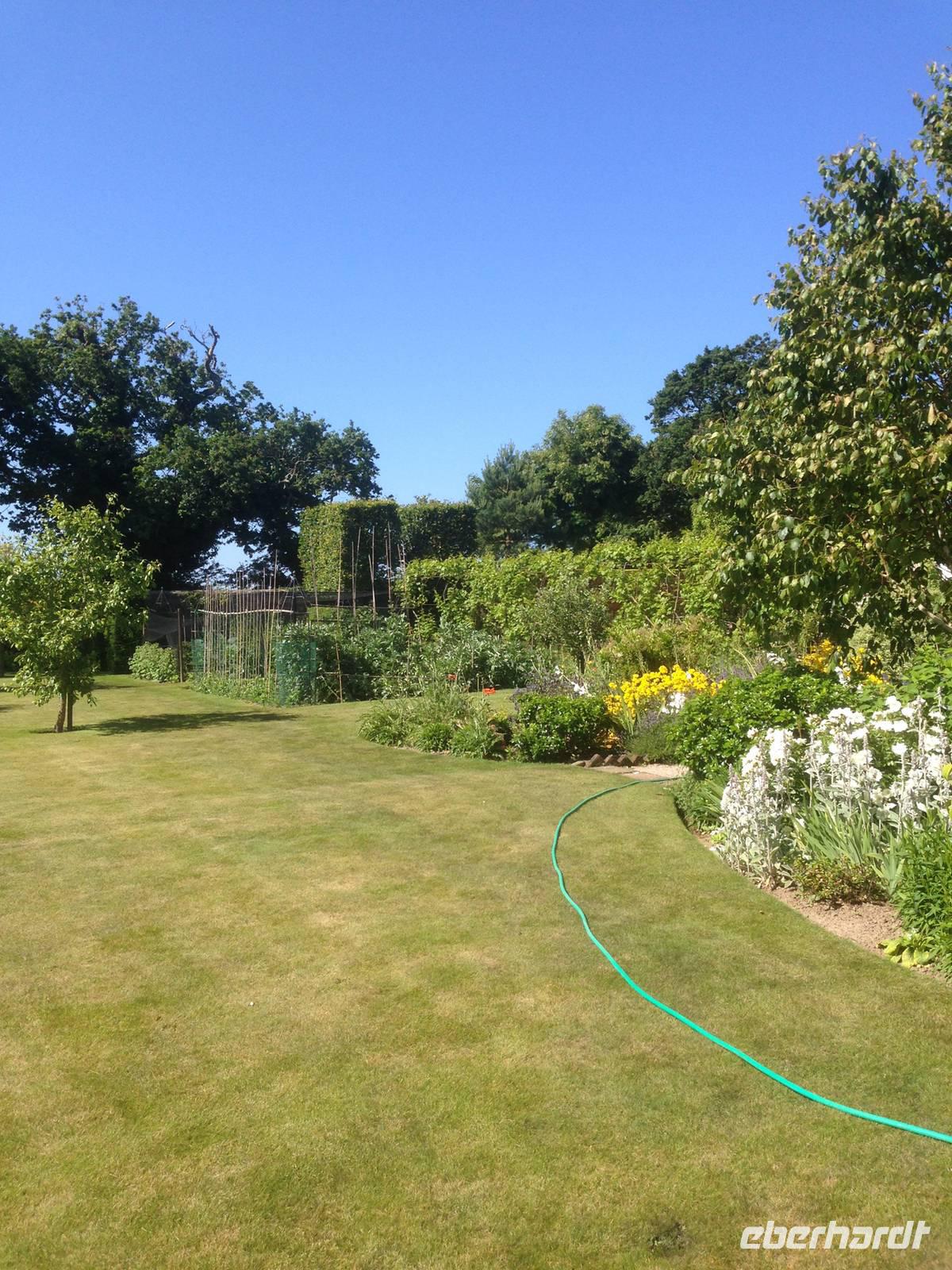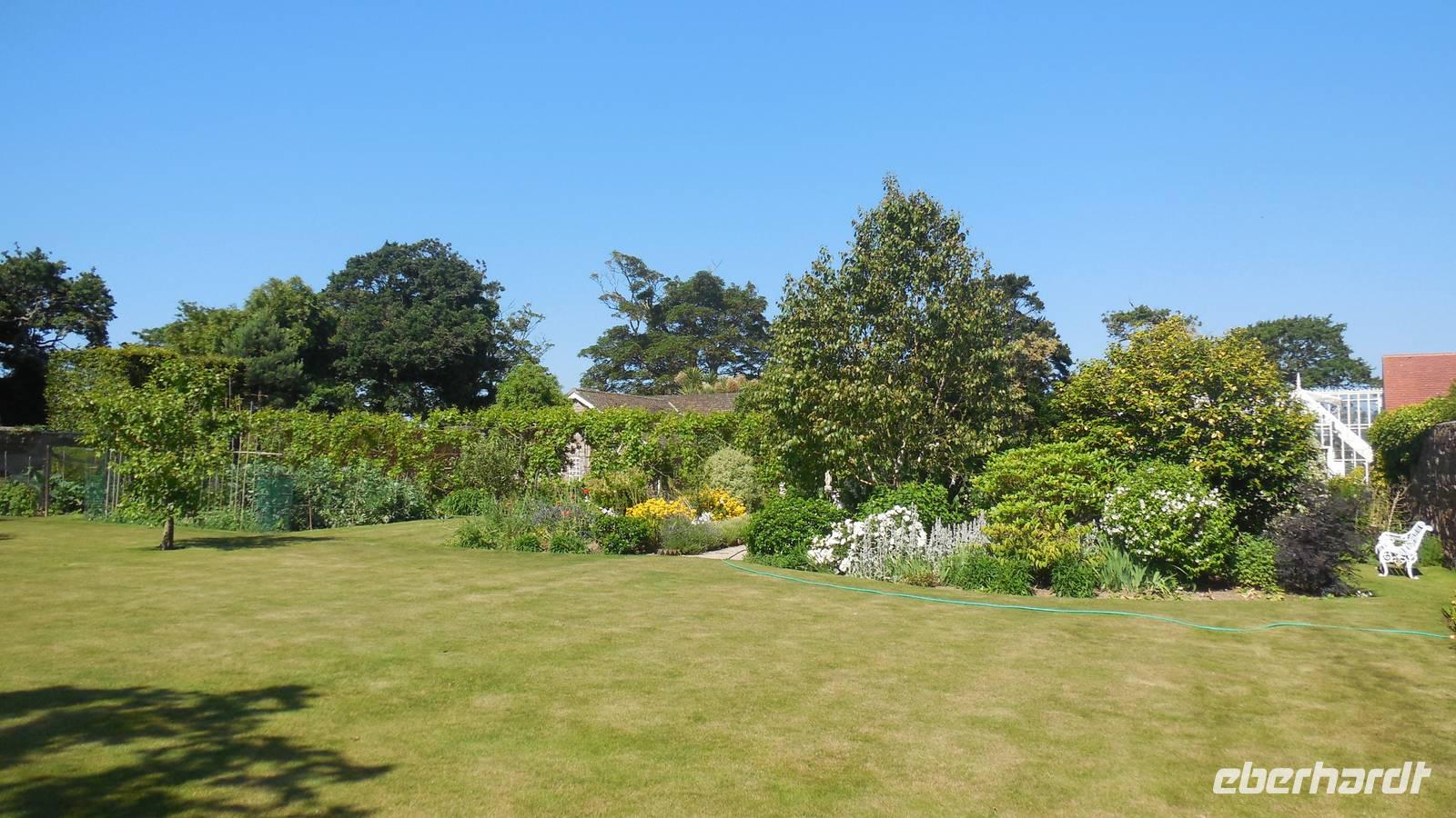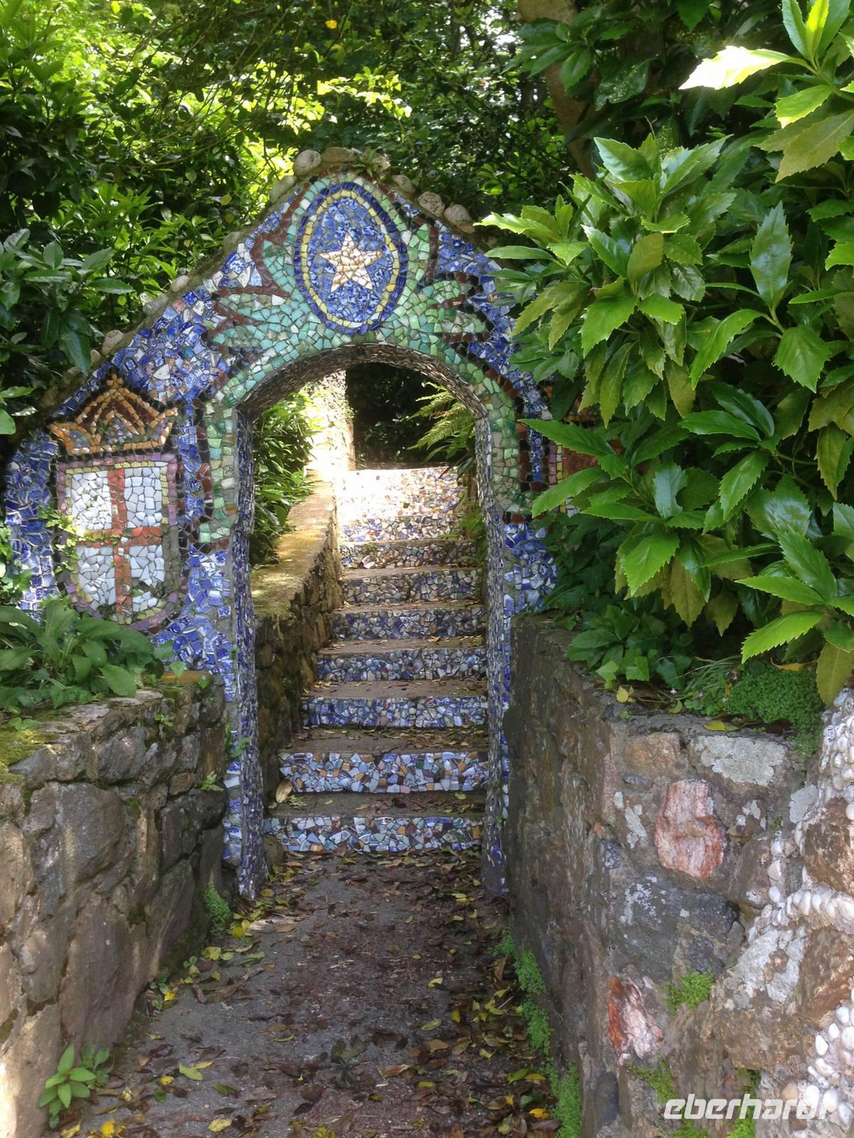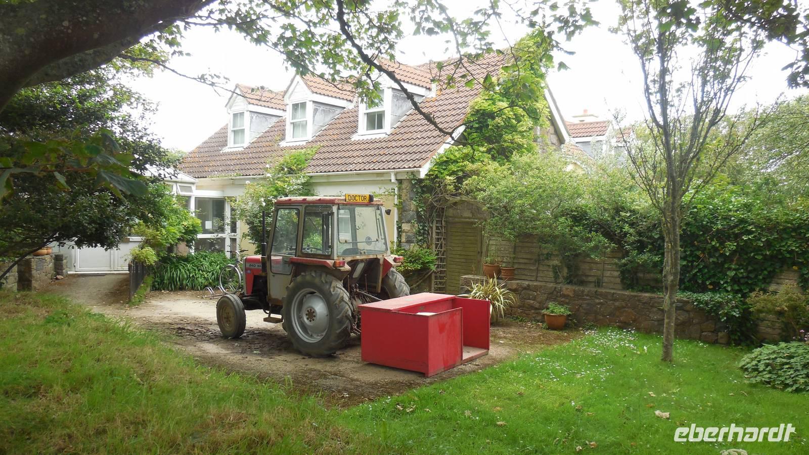 Heute zeigt uns Heidi einige Privatgärten von wohlhabenden Grundbesitzern. Als Erstes fahren wir zum Garten von Mrs. Lie. Voll beeindruckt laufen wir entlang des Cottages hinter in den Garten der Besitzerin. Der Anblick, der sich bietet, fasziniert. Das Anwesen beherbergt Rosen, seltene Baum- und Pflanzenarten. Wir haben noch etwas Zeit und fahren Nach St. Aubin zur Glaskirche St. Matthews Church. Als zweites begrüßt uns in St. Aubin das Anwesen von Mr. Miles. Dieser Herr, ein englischer Gentleman wie wir ihn aus dem Bilderbuch kennen, führt uns durch sein Gärtchen und erklärt uns stolz die seltenen Gewächse und die Geschichte des Hauses. Zwischen Riesenrharbarber, Hortensien, Bananenstauden und Palmen führt er uns auf sattgrünem Rasen zu einem Teich voller Zierfische, welche früher im Winter sogar einen beheizten Pool bekamen.