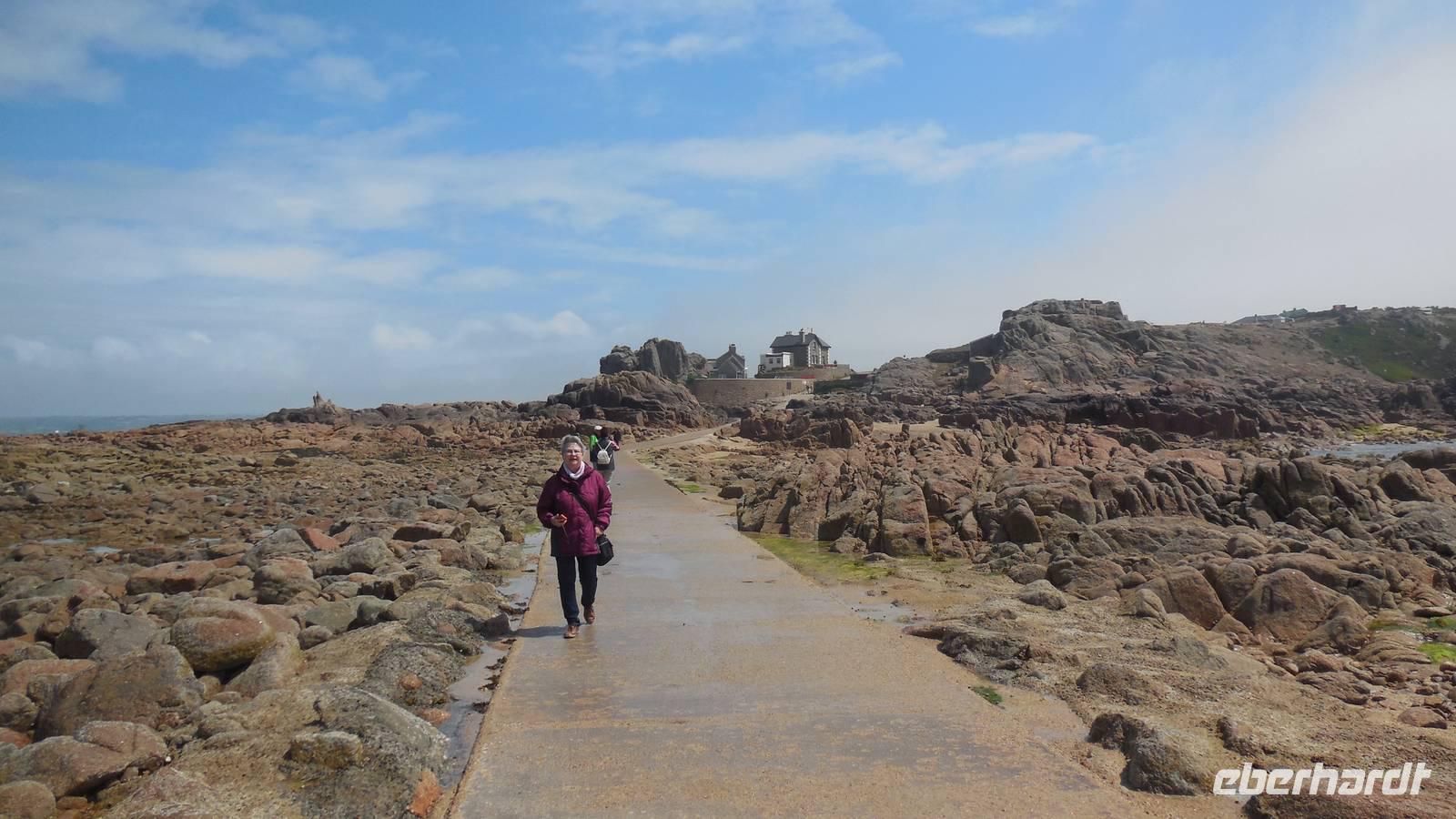 Von unserem Hotel in der Hauptstadt St. Helier geht es entlang der Royal Bay in Richtung Gorey. Hier thront Jerseys älteste Burg, das Mont Orgeuil Castle. Umgeben von einer schroffen Felsküste, die einer Mondlandschaft nahe kommt, einem hübschen kleinen Hafen und dem kleinen Örtchen mit den urigen Pubs, diente diese Burg der Abwehr von Angriffen der Franzosen. Nach einem Fotostopp schlängeln wir die Küstenstraße hinauf und lassen uns von Reiseleiterin Heidi Geschichtchen über die eigenartigen Jerseyaner erzählen. So stammen von Jersey die berühmten Jerseypullover. Früher sollen hier die Männer und Frauen gleichermaßen gestrickt haben und dabei sogar oft die Felder vernachlässigt haben. Wer nicht strickte, der galt als faul. Wir gelangen zur Bouley Bay, einer wunderschönen Bucht an der Nordküste, wo wir eine Pause einlegen. Am Kieselstrand findet man viele Muscheln, einzigartige Steinchen und mit etwas Glück auf mal eine große Jakobsmuschel.