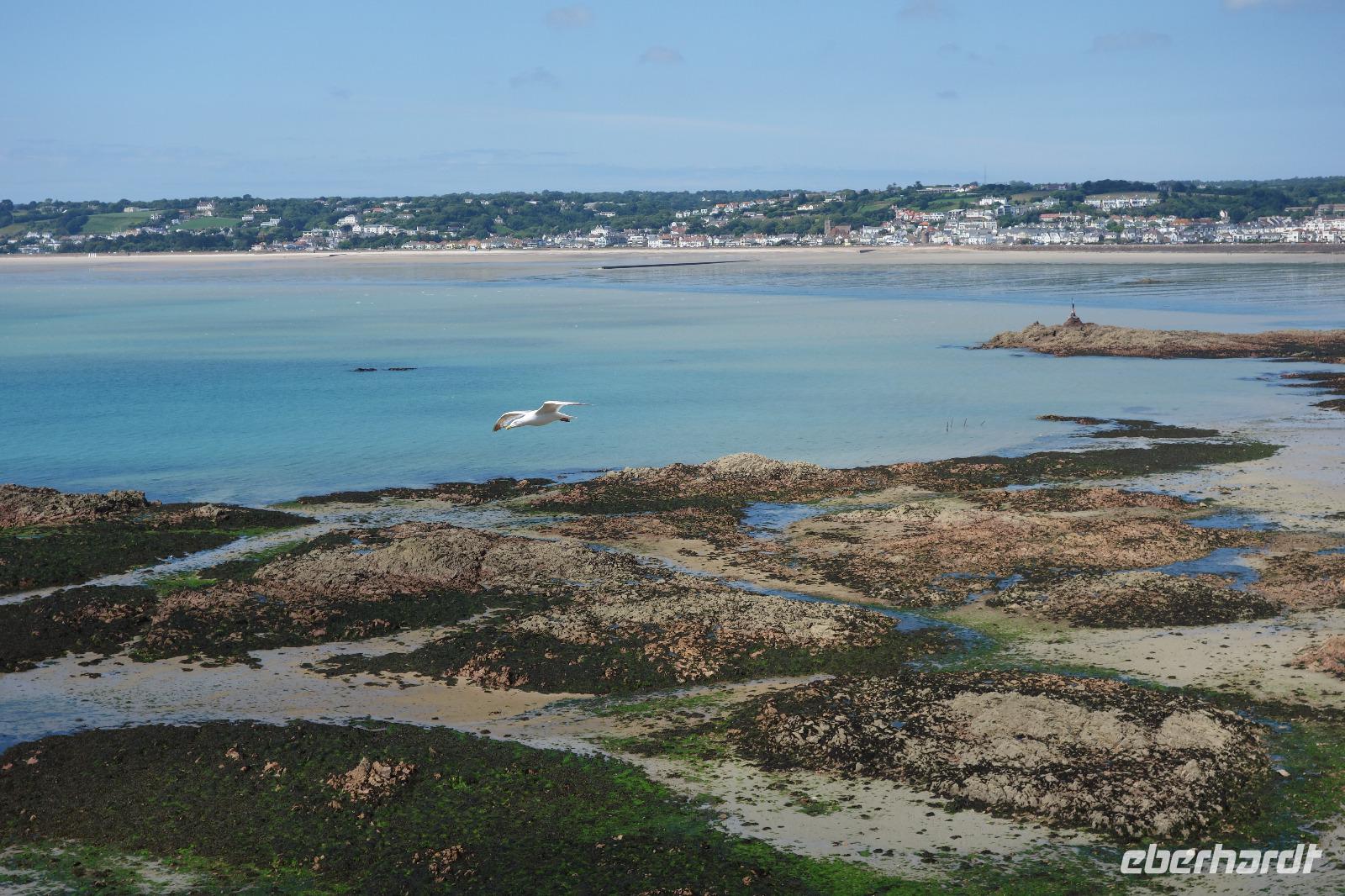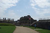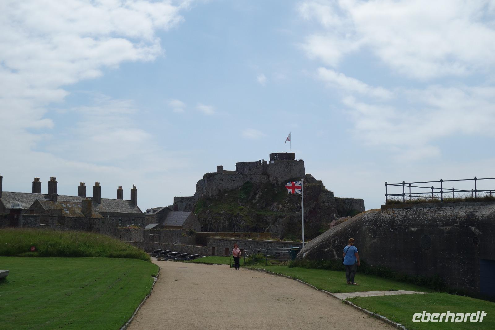 Die Green Lanes, wo Fahrräder und Fußgänger absoluten Vorrang haben, standen heute auf dem Programm. Zusammen mit Ebi liefen wir entlang der Wasserwerke von Jersey, vorbei an den 5 Mühlen, oder deren Reste zum Elendshügel hinauf. Vorbei an der St. Clements Church und den Jersey War Tunnels durchquerten wir die Insel. Unsere Mittagessen nahmen wir dann am Strand zwischen St. Helier und St. Aubin ein. Von hier aus konnten wir unser nächstes Ziel schon sehen: das Elisabeth Castle, was zu der Zeit noch zum Teil im schillernden Atlantik lag. Wir hatten aber noch ein Stück Weg vor uns, sodass der schmale Pfad, der zum Castle führte fast völlig frei lag als wir ankamen. Im Schloss erklärte uns Ebi viel Wissenswertes über die Geschichte Jerseys und der ehemaligen Verteidigungsanlage.