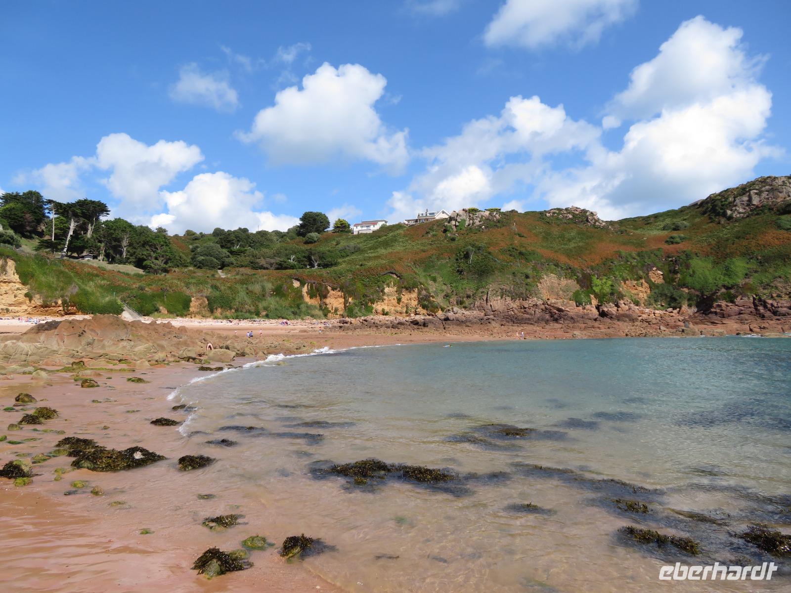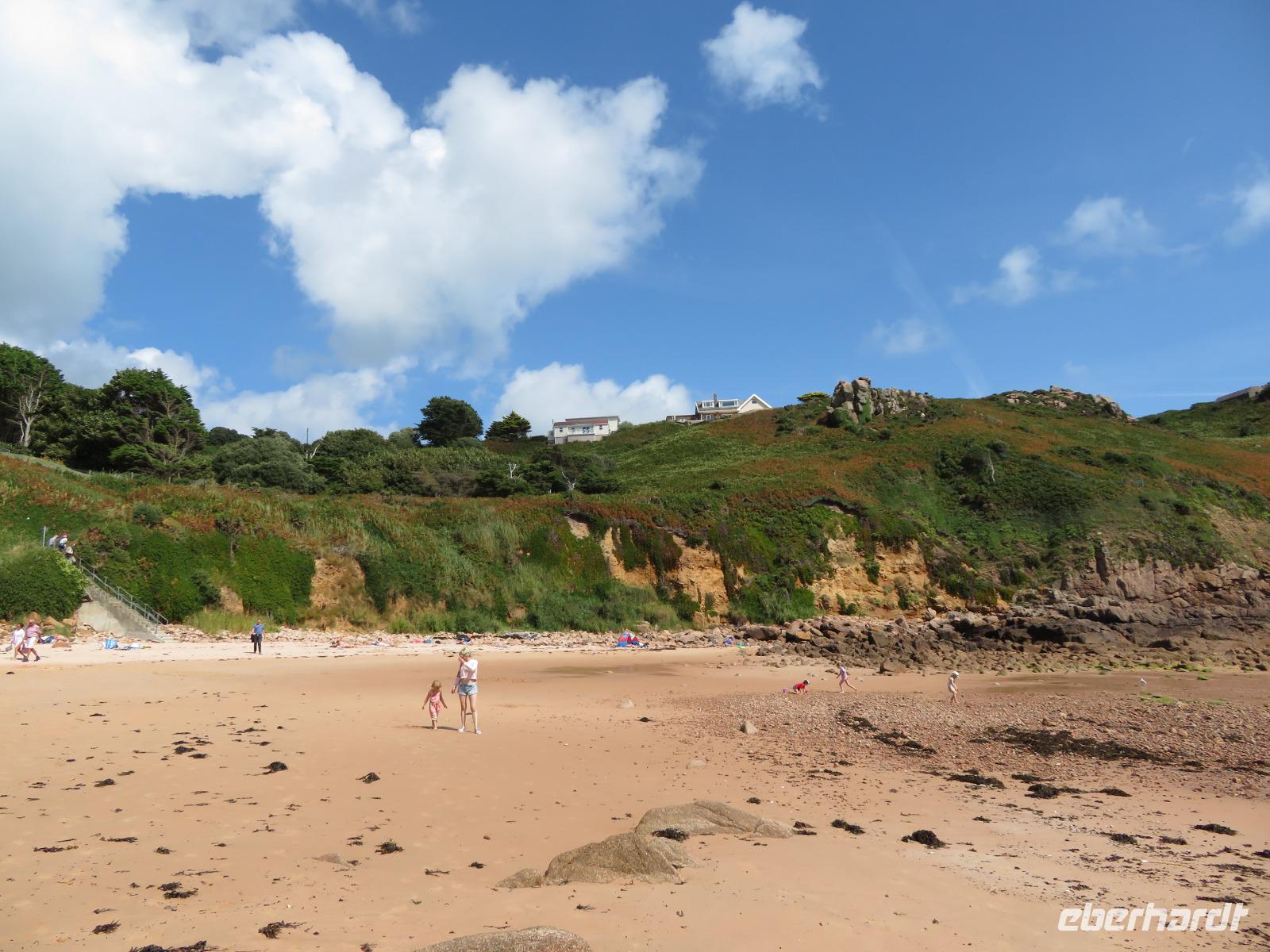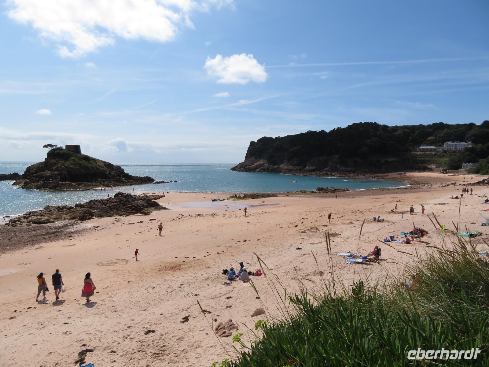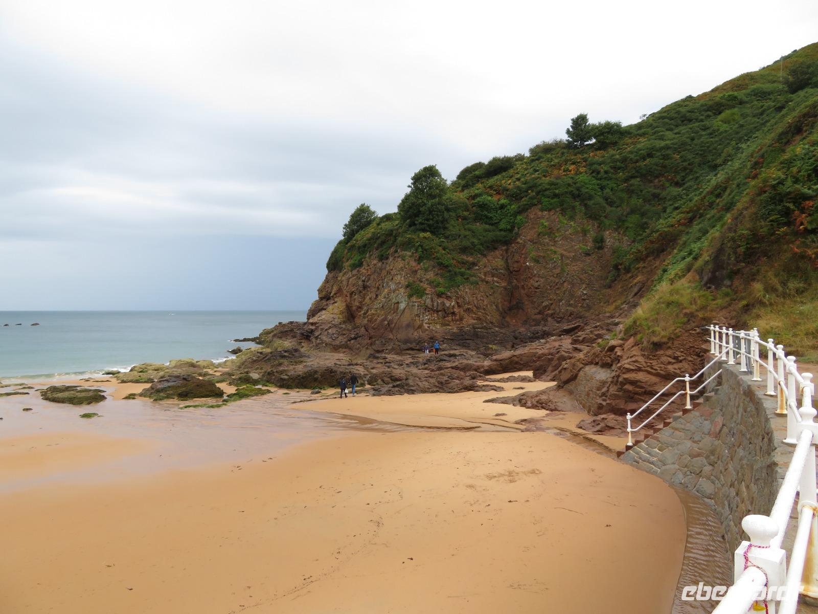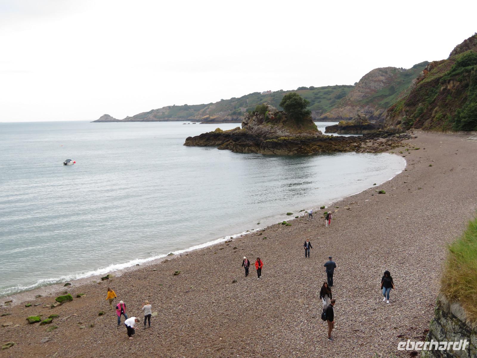 Unsere Fahrt ging über die Rozel zur Bouley Bay. Hier hatten wir einen kurzen Fotostopp und sammelten die bunte Steine als Andenken für zu Hause. Über die Inselrennstrecke fuhren wir aus der Bucht hinaus nach Greve de Lecq. Am schönen goldgelben Sandstrand hatten wir unsere Mittagspause.