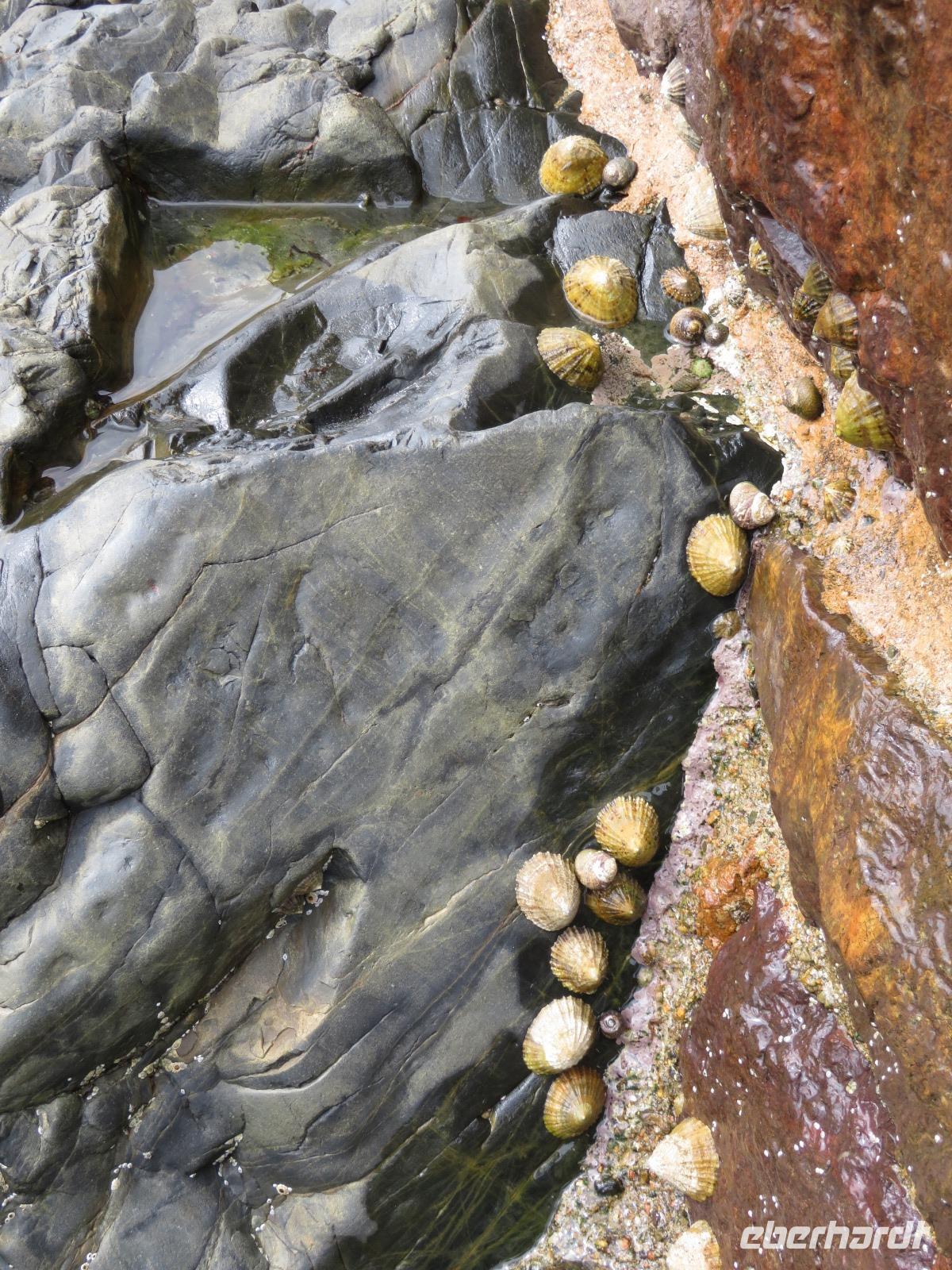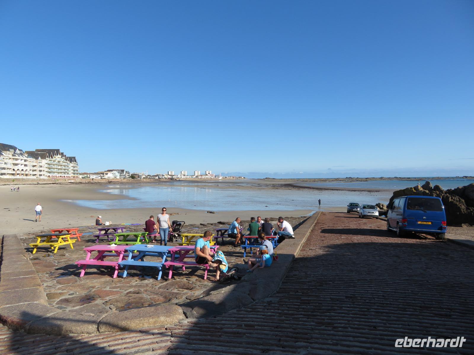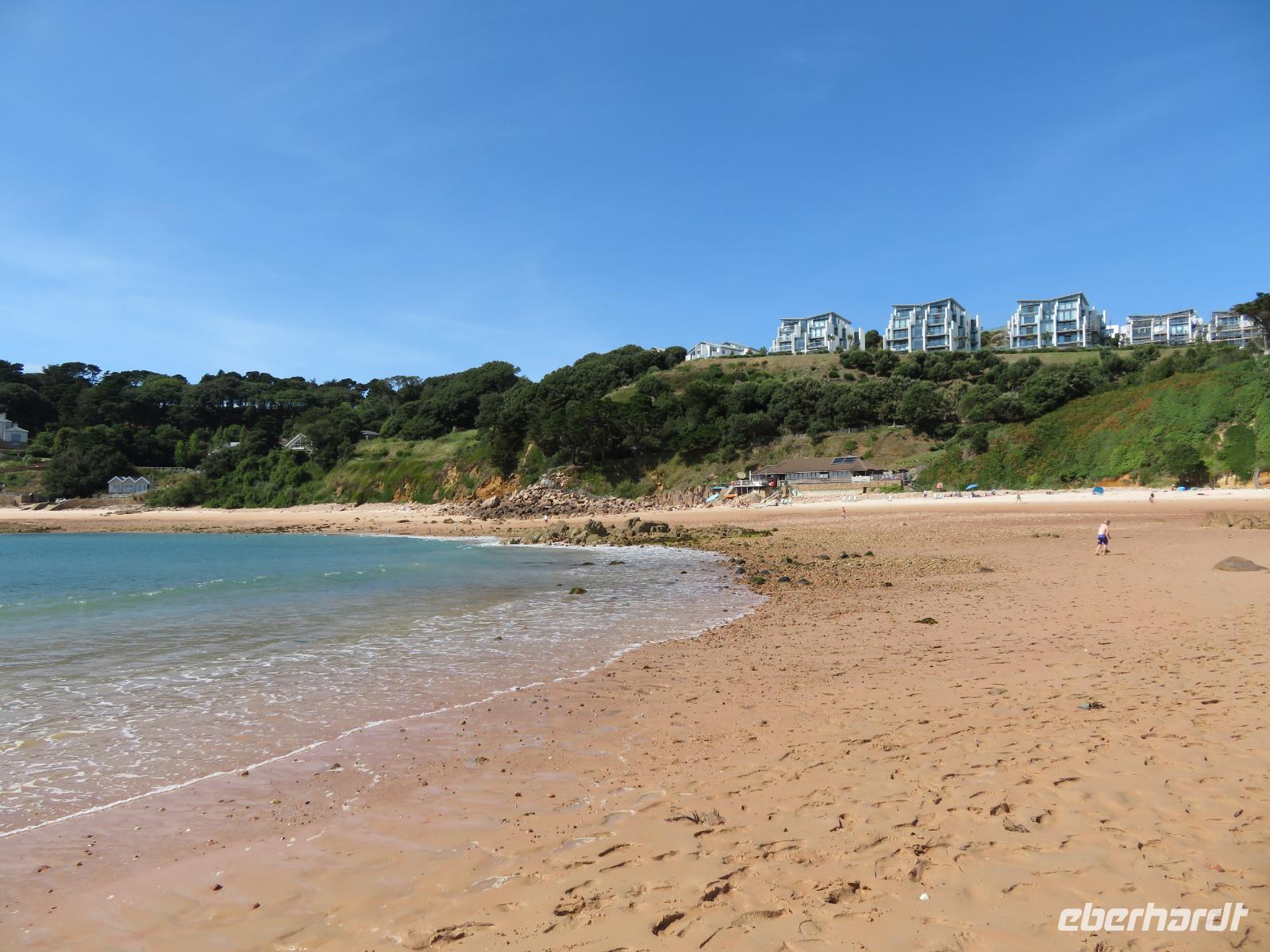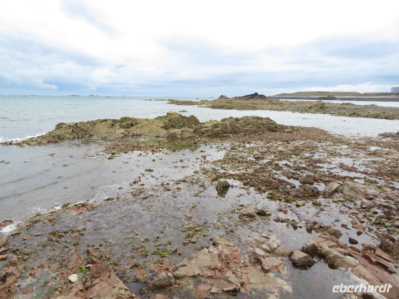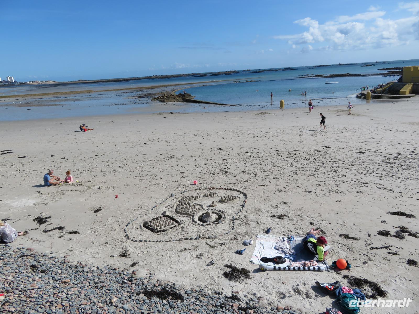 Unsere Fahrt ging über die Rozel zur Bouley Bay. Hier hatten wir einen kurzen Fotostopp und sammelten die bunte Steine als Andenken für zu Hause. Über die Inselrennstrecke fuhren wir aus der Bucht hinaus nach Greve de Lecq. Am schönen goldgelben Sandstrand hatten wir unsere Mittagspause.
