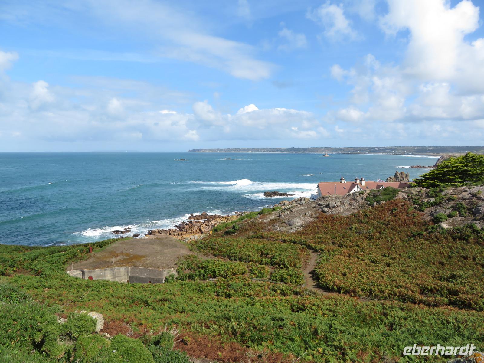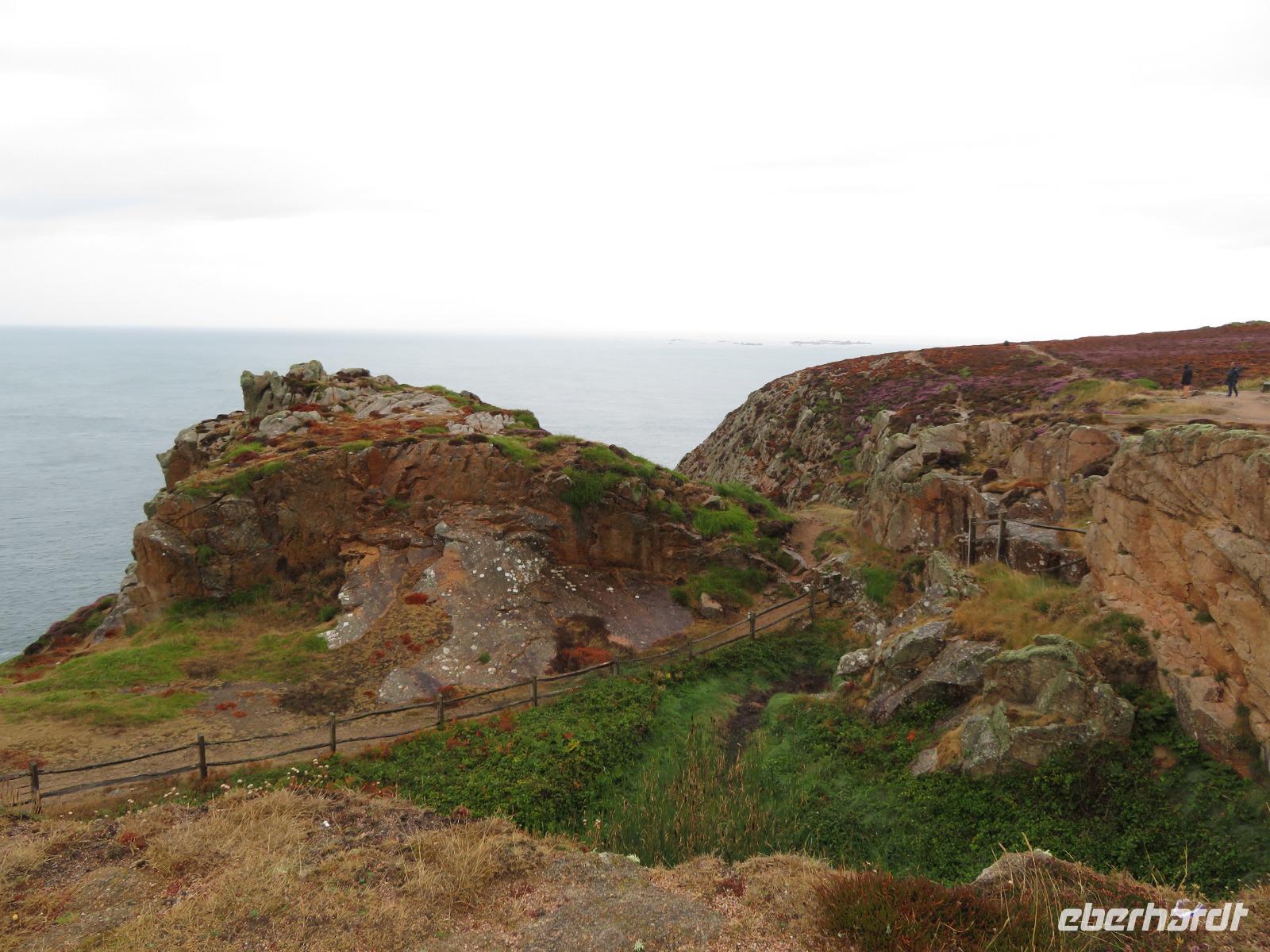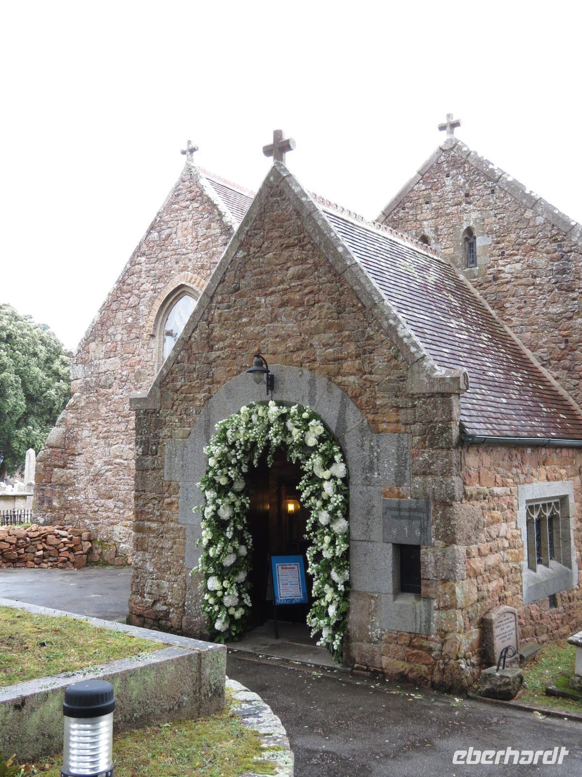 Am Grosnez Castle im Nordwesten der Insel hielt der Minibus für den nächsten Fotostopp. Leider fing es kräftig an zu regnen, sodass wir die Nachbarinseln leider nicht sehen konnten. Entlang der St. Ouen's Bay mit kurzen Stopp zum Kartoffelkauf fuhren wir über den Cobiere Leuchtturm zur Fisherman's Chapel in der St. Brelades Bay. Der Eingang war von einer Hochzeit schön mit weißen Rosen geschmückt und auch der Friedhof mit seinen alten Grabsteinen war interessant anzuschauen.