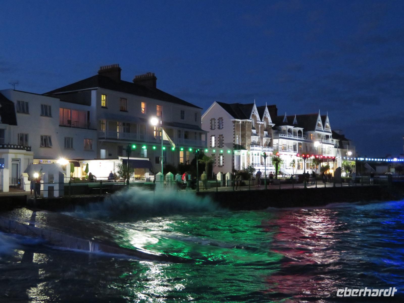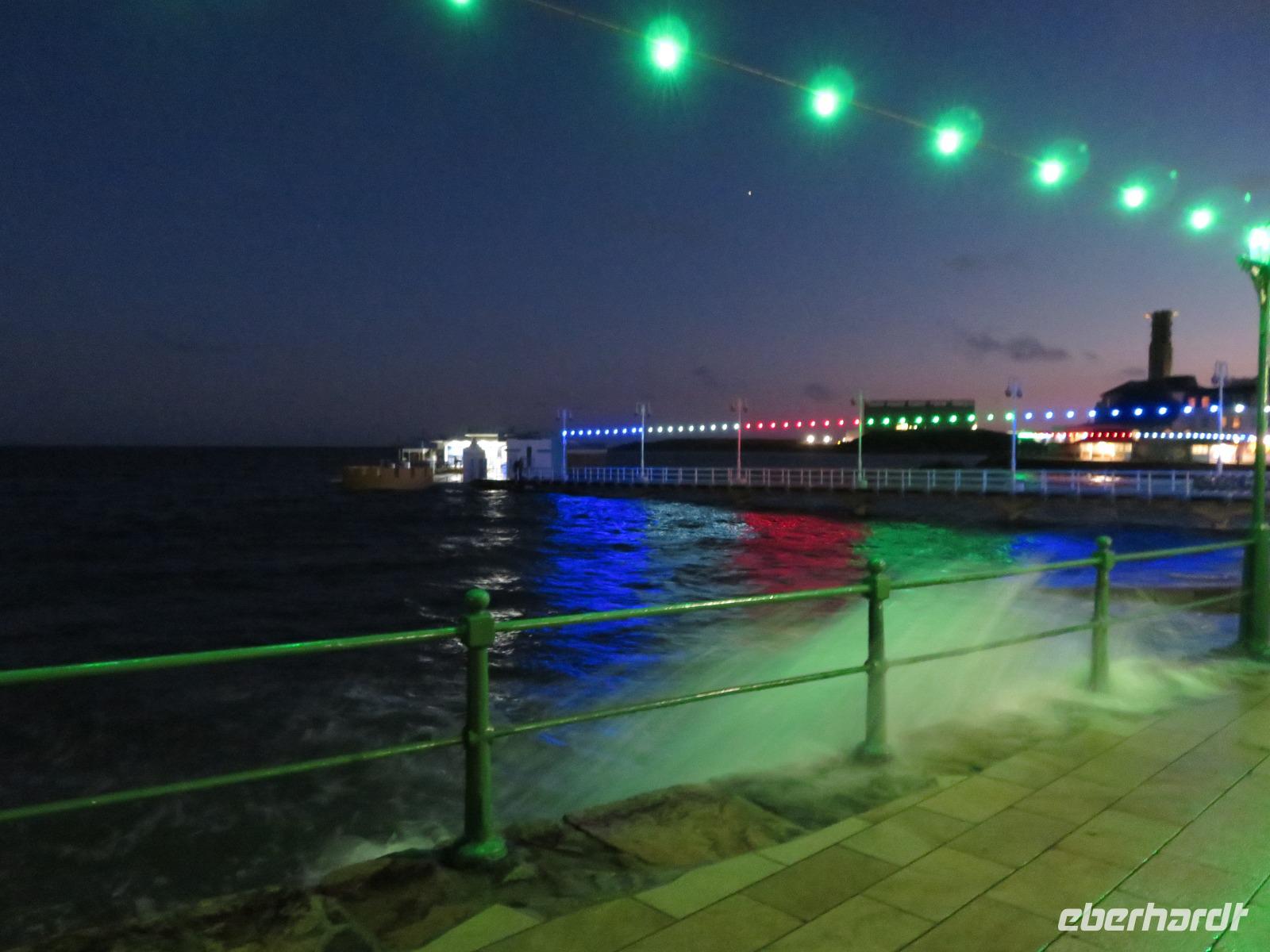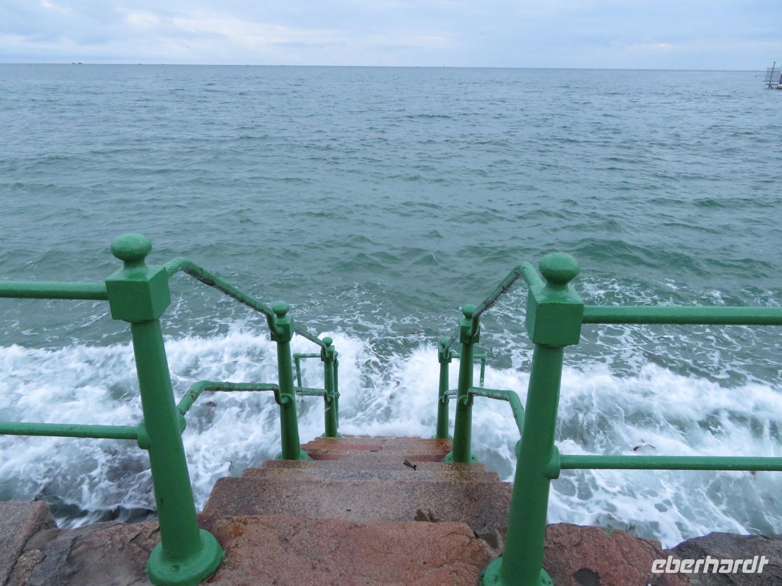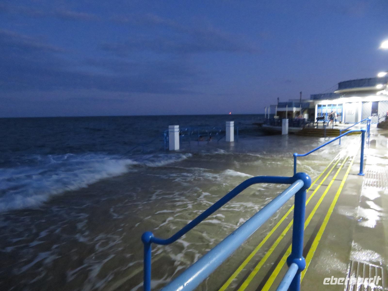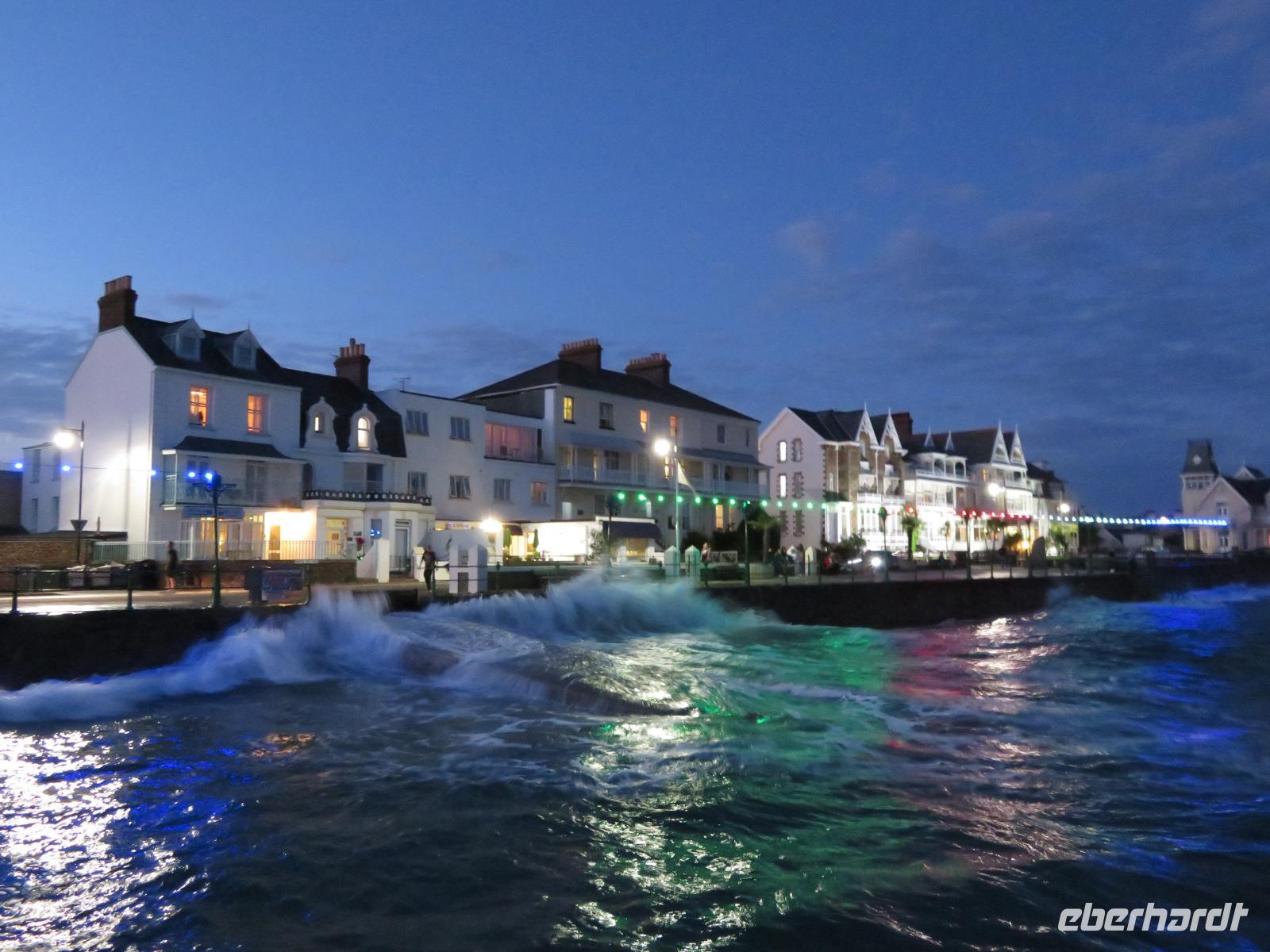 Am Abend ergab sich vor unserem Hotel ein weiteres Schauspiel, da genau an unseren Urlaubstagen die höchsten Wasserstände bei Flut erreicht wurden. Daher war das Ufer mit zusätzlichen Holzbohlen gesichert und immer wieder spritzte das Wasser auf die Küstenstraße.