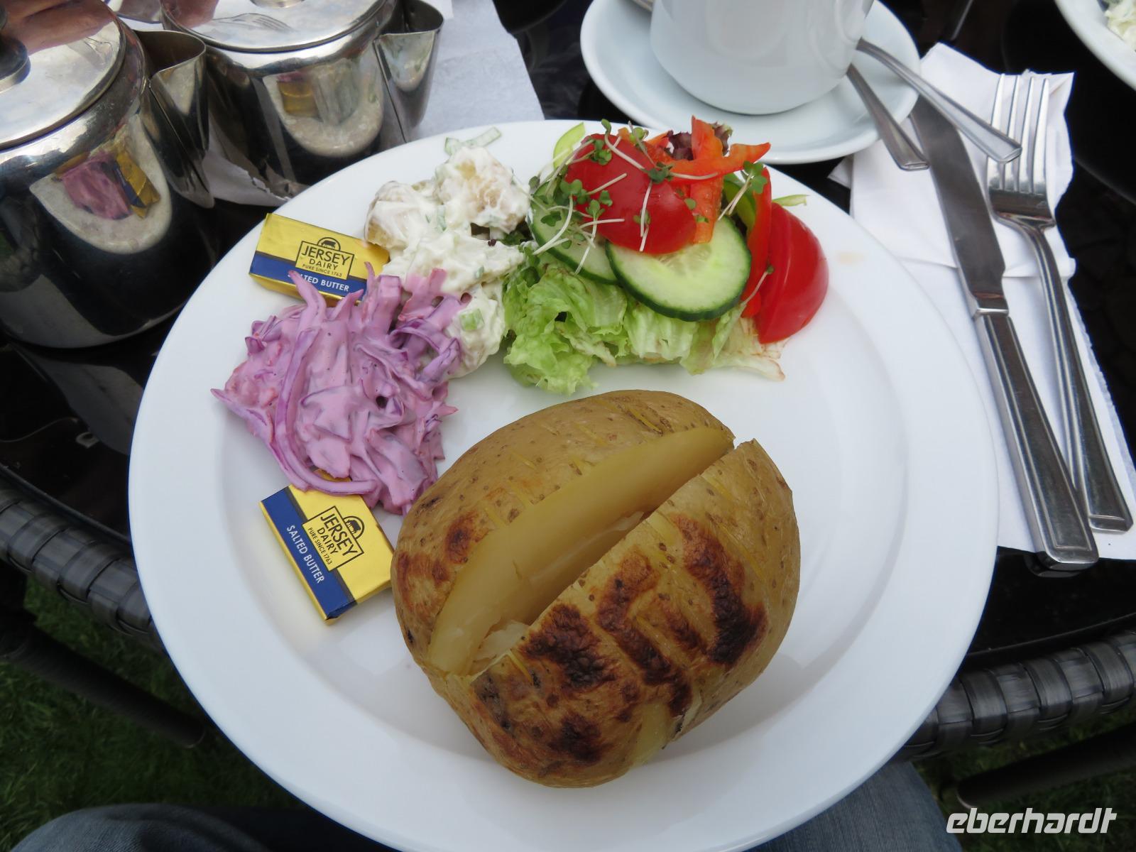 Mittags aßen wir Fish and Chips in einem typisch englischen Pub. Danach fuhren wir zur Eric Young Orchid Foundation und schauten viele seltene Orchideenzüchtungen an. Auf dem Weg zur „Überraschung" gingen wir noch auf Fotojagd der Jersey-Kühe. Nachdem dies geschafft war, gab es Cream Tea zur Stärkung. Neben Tee wurden Scones, Clotted cream und Erdbeerkonfitüre gereicht.