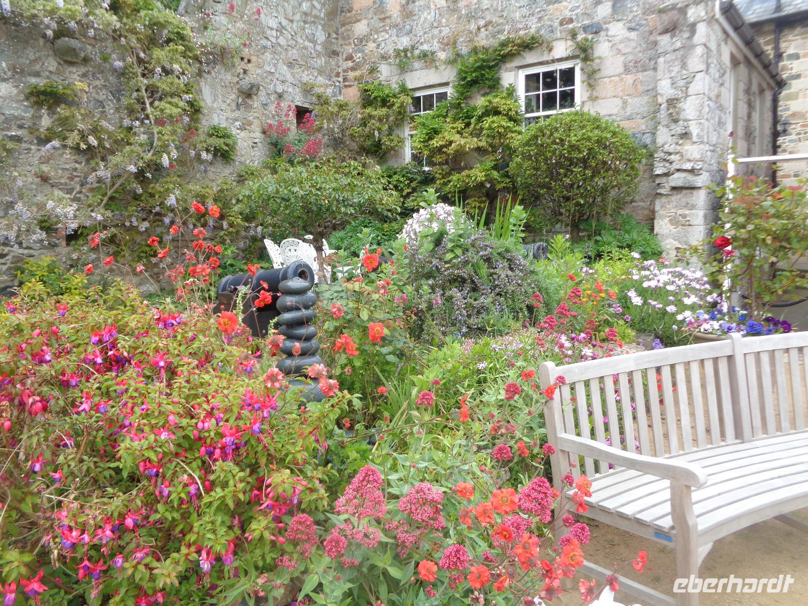 Die alte Kanone, ein Geschenk der Königin Elizabeth I., steht jetzt inmitten einer Blumenrabatte und Tische und Stühle laden zum Verweilen ein.