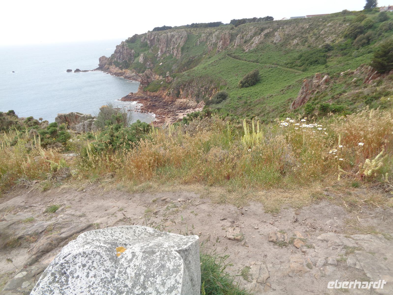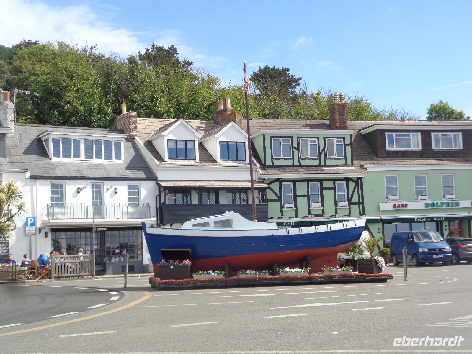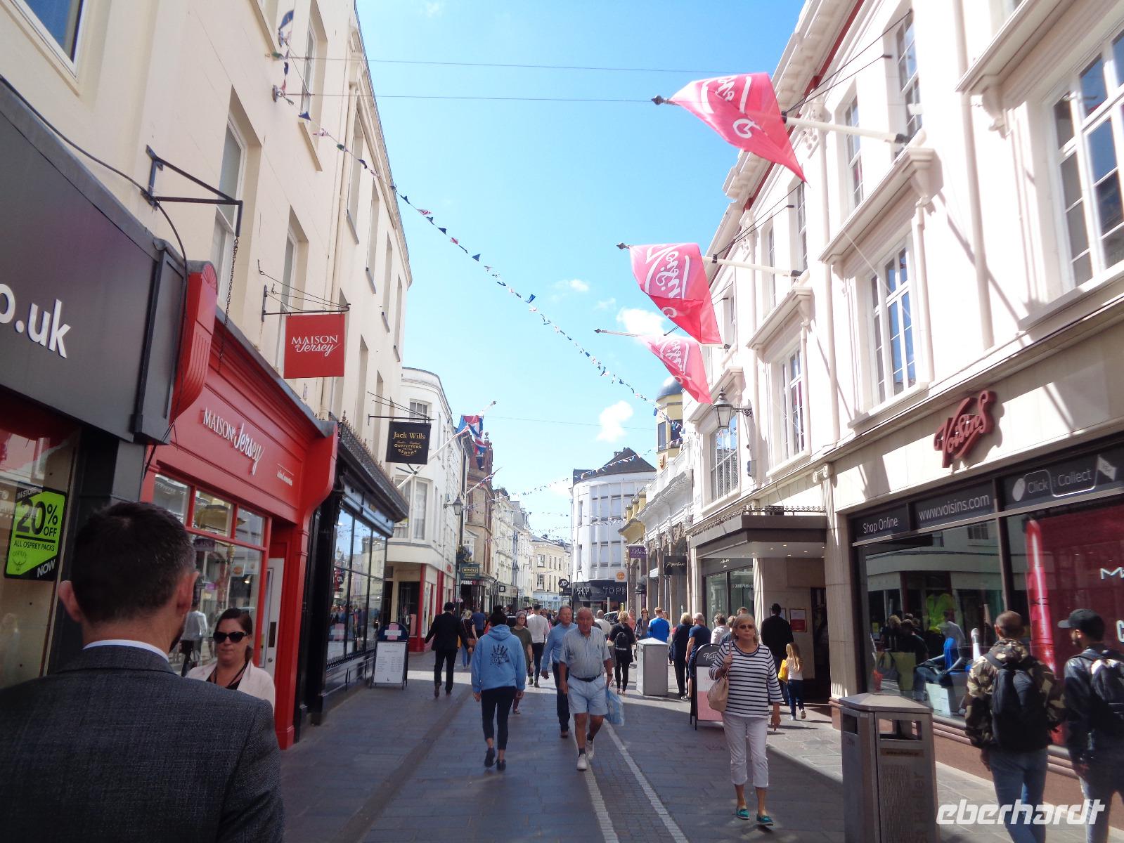 Heute freuen wir uns auf einen selbst gewählten Ausflug. Wir beginnen unseren Stadtrundgang in der Rooseville street und begutachten schon mal das Runnymede Court Hotel, in dem wir heute Abend speisen werden. Dann geht es vorbei an der Polizeistation zur Grenville street, Snow Hill bis zur Halkett street. Hier treffen wir auf die Markthalle von 1881 und gegenüber auch auf die kleine Fischmarkthalle von 1854. Wir merken uns nur, wo alles steht, und spazieren weiter zum Royal Place mit der Statue von König George II., der Jersey durch die Finanzierung des Hafens zur wirtschaftlichen Blüte verhalf. Benannt ist der Königliche Platz allerdings nach König Charles II., der mit Unterstützung der Carteret-Familie im Bürgerkrieg 1640 im Fort Elizabeth Unterschlupf fand.
