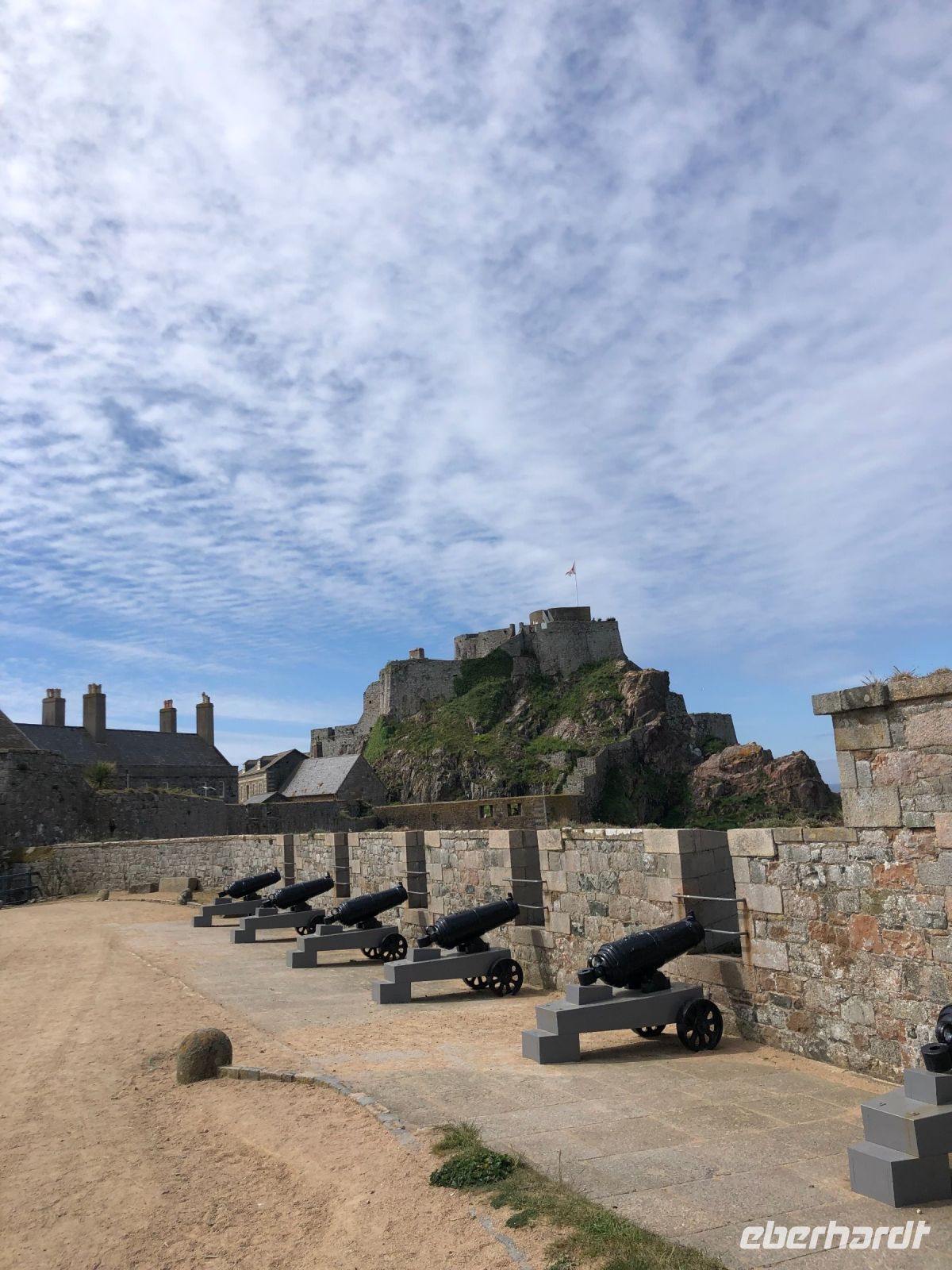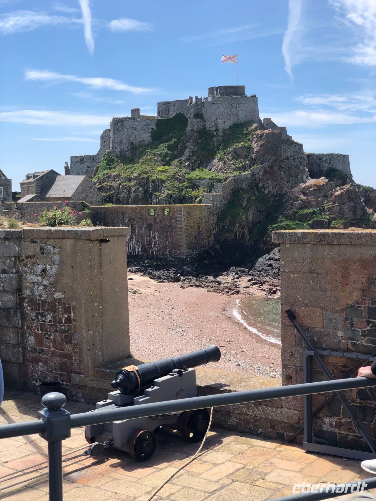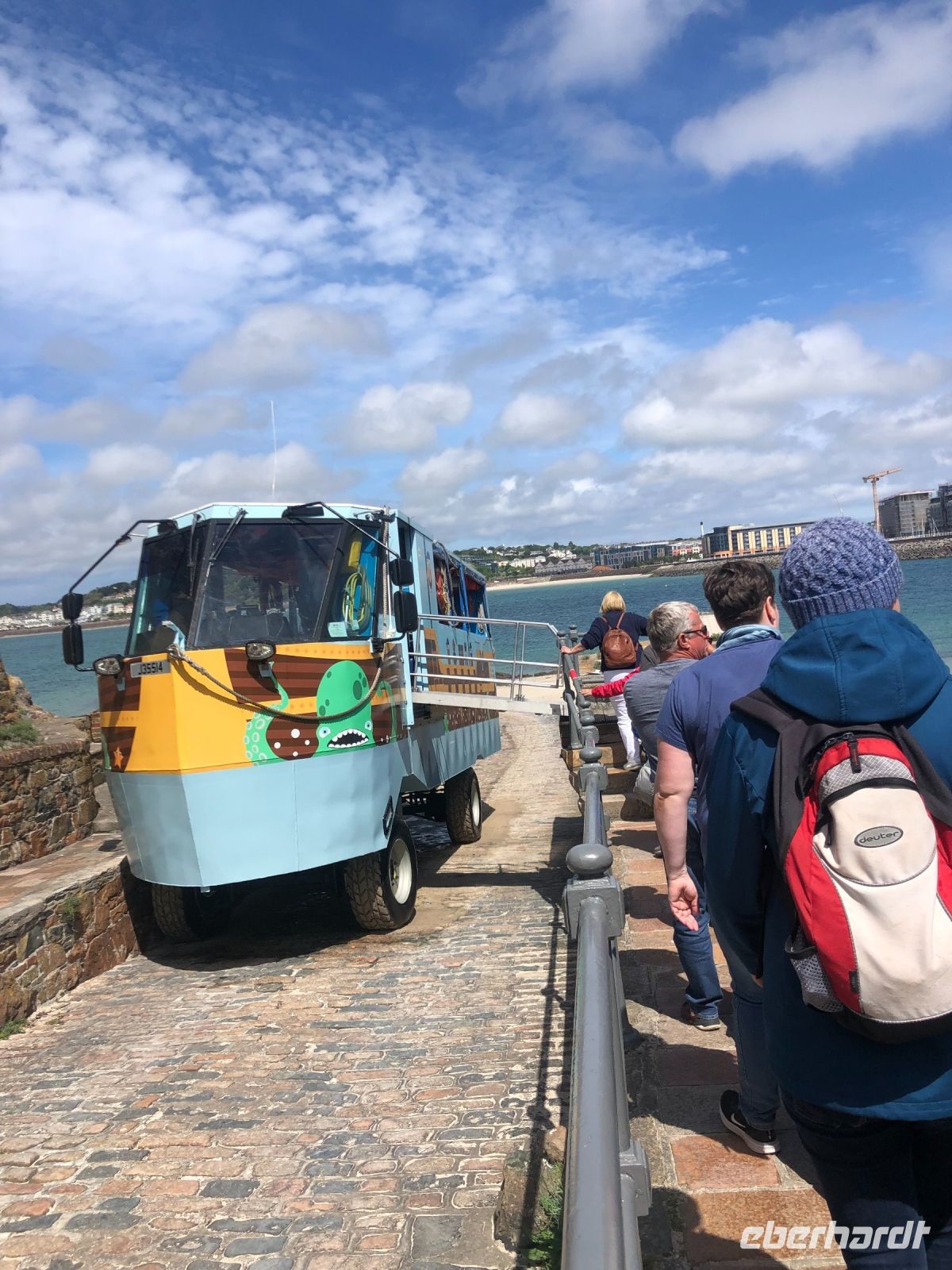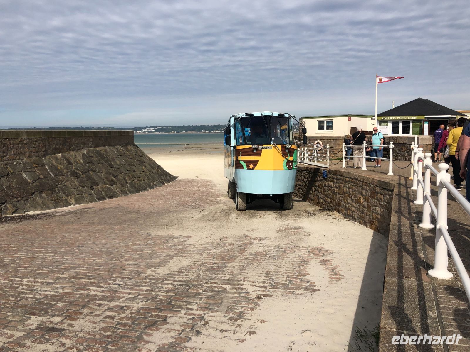 An unserem zweiten freien Tag besuchten wir mit dem Großteil der Gäste die Festung Elizabeth Castle, welche sich auf der vorgelagerten Gezeiteninsel Jerseys befindet. Der Weg dahin führte uns zunächst entlang der Küste und im Anschluss am Hafen vorbei. Ein sogenanntes Amphibienfahrzeug, also eine Kombination aus Schiff und Auto, beförderte uns auf die 24 Hektar große Festungsinsel. Alle Reisenden liefen selbstständig durch die Burganlage und entdeckten die vielen historischen Räumlichkeiten und Ausstellungen des Castles. Gegen Mittag fand eine Parade aus freiwilligen Teilnehmern auf dem großen Paradeplatz statt. Einer unserer Gäste nahm trotz fehlender Englischkenntnisse erfolgreich an der Parade teil und marschierte auf den davor liegenden Platz, wo abschließend ein lauter Böllerschuss aus einer zum Meer gerichteten Kanone gefeuert wurde. Das Amphibienfahrzeug fuhr uns auf dem Rückweg bei Flut zurück nach St. Helier. Von hier aus starteten wir unseren Spaziergang zu der viktorianischen Markthalle im Zentrum der Stadt. Neben dem Shoppen von Souvenirs, genehmigten sich einige Reisenden auch einen kleinen Snack an einem der zahlreichen kulinarischen Stände. Ein typisches Souvenir ist hier auf Jersey vor allem die sogenannte Black Butter, diese hat mit der herkömmlichen Butter allerdings nicht viel zutun, sondern ist viel mehr ein Aufstrich aus Äpfeln, Cider und Gewürzen. Der andere Teil der Gruppe genoss einen weiteren Tag, der Ihnen zur freien Verfügung stand und unternahm zum Beispiel Erkundungen per Inselbus oder Spaziergänge entlang der weitläufigen Sandbuchten. Am Abend saßen wir noch mit einigen Reisenden im White Horse Pub um die Ecke zusammen und haben uns bei ein paar Getränken noch etwas unterhalten und besser kennengelernt.