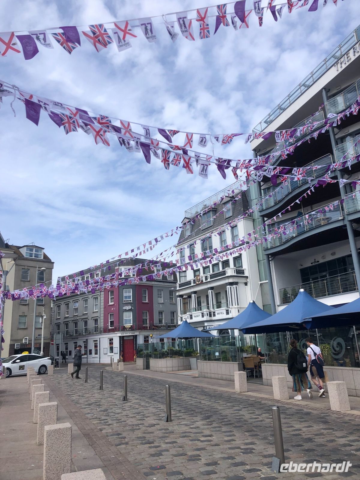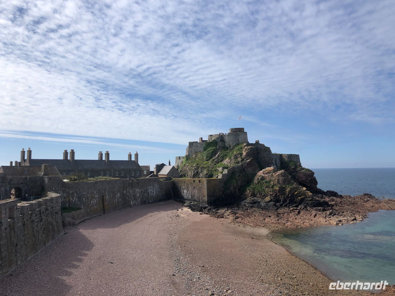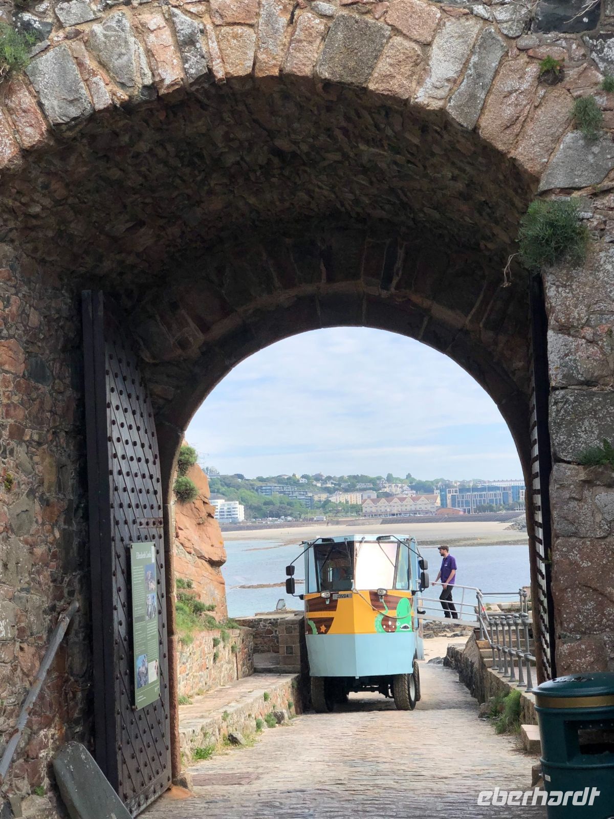 An unserem zweiten freien Tag besuchten wir mit dem Großteil der Gäste die Festung Elizabeth Castle, welche sich auf der vorgelagerten Gezeiteninsel Jerseys befindet. Der Weg dahin führte uns zunächst entlang der Küste und im Anschluss am Hafen vorbei. Ein sogenanntes Amphibienfahrzeug, also eine Kombination aus Schiff und Auto, beförderte uns auf die 24 Hektar große Festungsinsel. Alle Reisenden liefen selbstständig durch die Burganlage und entdeckten die vielen historischen Räumlichkeiten und Ausstellungen des Castles. Gegen Mittag fand eine Parade aus freiwilligen Teilnehmern auf dem großen Paradeplatz statt. Einer unserer Gäste nahm trotz fehlender Englischkenntnisse erfolgreich an der Parade teil und marschierte auf den davor liegenden Platz, wo abschließend ein lauter Böllerschuss aus einer zum Meer gerichteten Kanone gefeuert wurde. Das Amphibienfahrzeug fuhr uns auf dem Rückweg bei Flut zurück nach St. Helier. Von hier aus starteten wir unseren Spaziergang zu der viktorianischen Markthalle im Zentrum der Stadt. Neben dem Shoppen von Souvenirs, genehmigten sich einige Reisenden auch einen kleinen Snack an einem der zahlreichen kulinarischen Stände. Ein typisches Souvenir ist hier auf Jersey vor allem die sogenannte Black Butter, diese hat mit der herkömmlichen Butter allerdings nicht viel zutun, sondern ist viel mehr ein Aufstrich aus Äpfeln, Cider und Gewürzen. Der andere Teil der Gruppe genoss einen weiteren Tag, der Ihnen zur freien Verfügung stand und unternahm zum Beispiel Erkundungen per Inselbus oder Spaziergänge entlang der weitläufigen Sandbuchten. Am Abend saßen wir noch mit einigen Reisenden im White Horse Pub um die Ecke zusammen und haben uns bei ein paar Getränken noch etwas unterhalten und besser kennengelernt.
