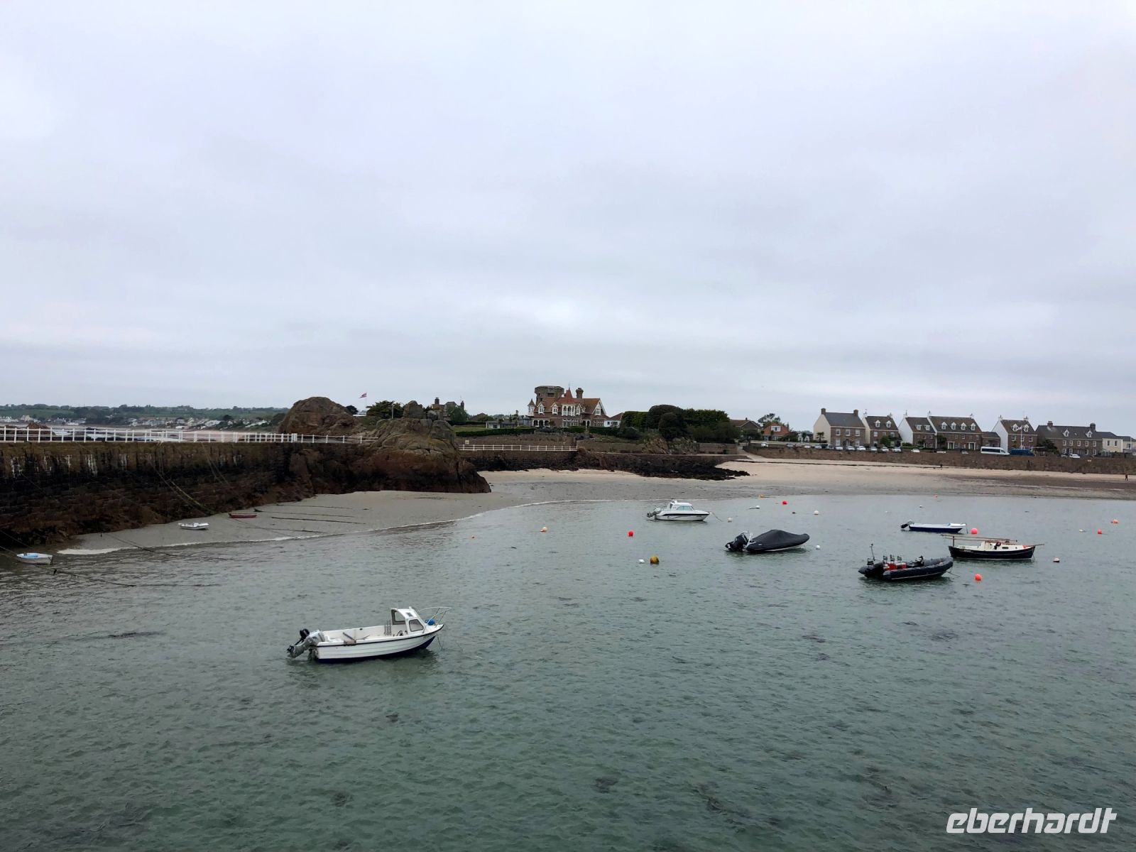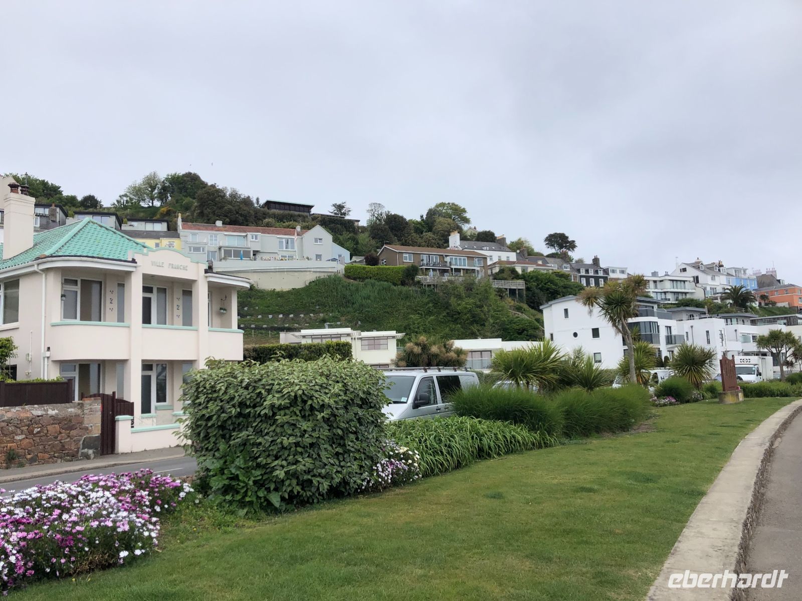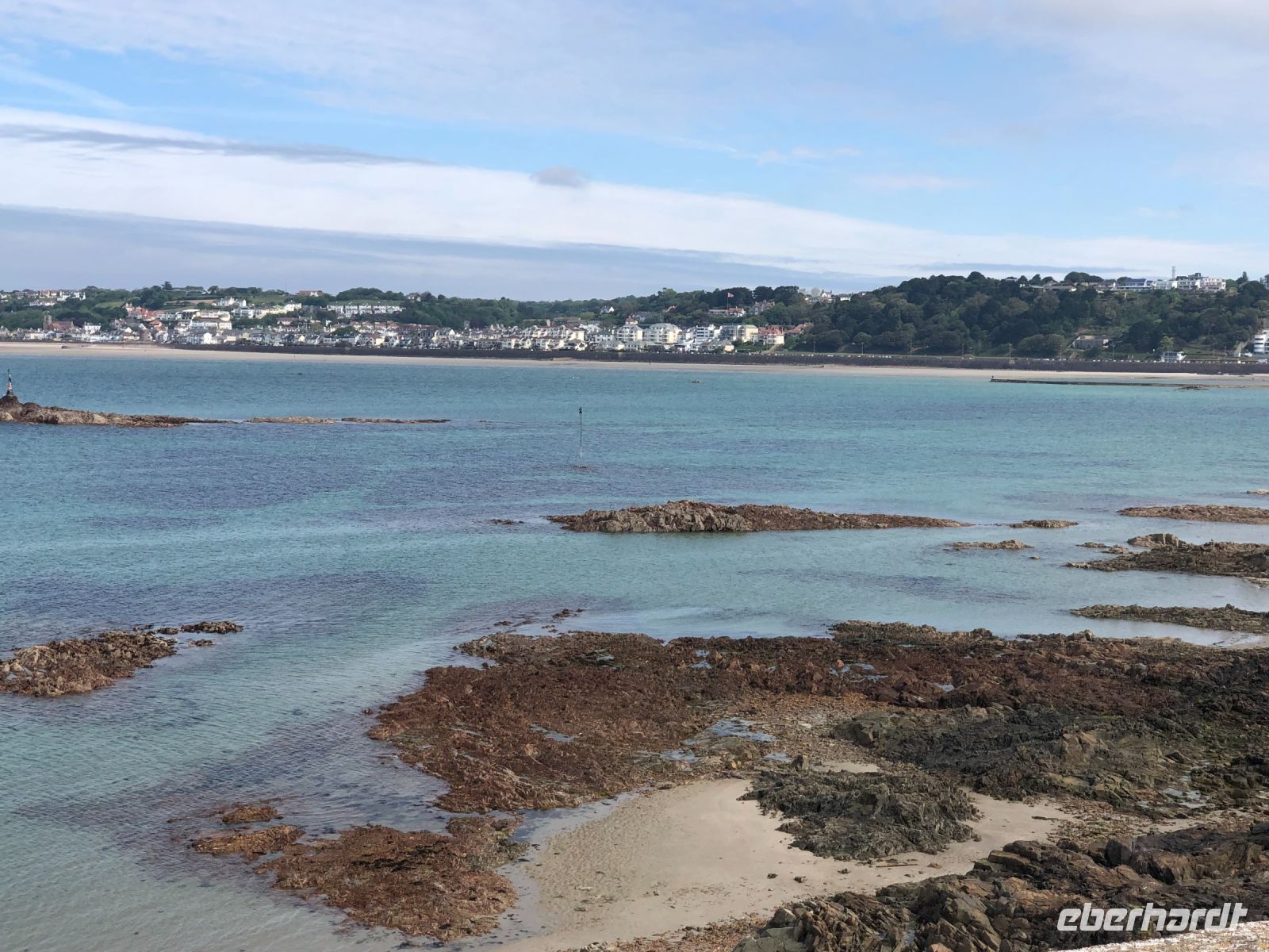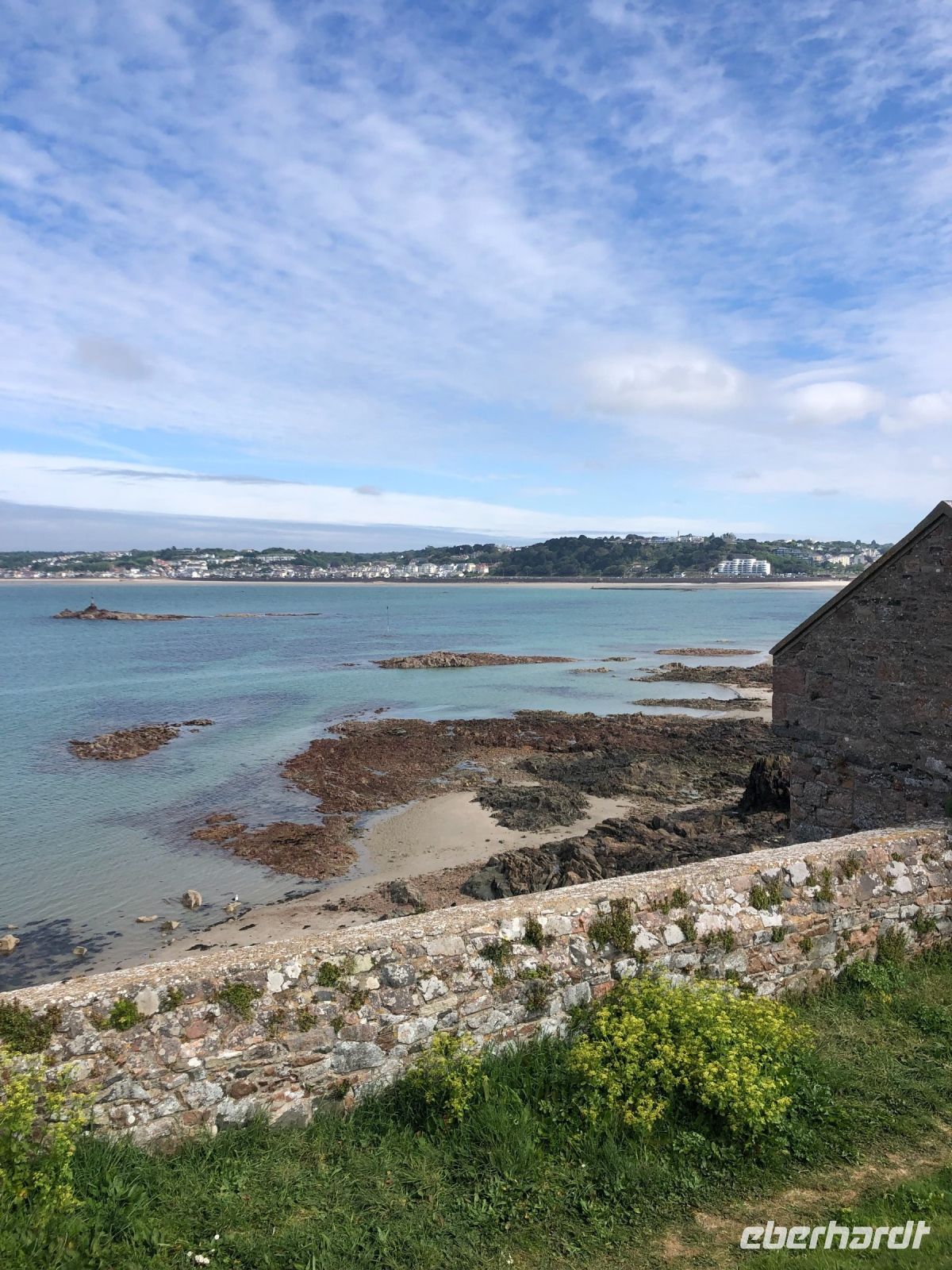 Unser Tag startete heute bereits um 08.00 Uhr. Nach dem Check-In am Fährterminal in St. Helier, betraten wir die große Condor Fähre nach Guernsey. Nach einer schaukeligen Fahrt erreichten wir dann den Hafen der zweitgrößten Kanalinsel und wurden schon von unserem örtlichen Busfahrer in Empfang genommen. Auf dem Weg nach hinauf entstand eine herrliche Kulisse mit den Kanalinseln Sark, Herm & Jethou im Hintergrund und der Burg Castle Cornet im Vordergrund. Stopp Nr. 1 der Inselrundfahrt machten wir bei der wohl kleinste Kirche der Welt, der Little Chapel- Eine von innen & außen mit Muscheln und bemalten Porzellanscherben verkleidete Kirche in Miniaturform. Nächster Halt war am Fort Grey- Ein Matelloturm, der wegen seiner Form auch Tasse und Unterasse genannt wird. Gegenüber machten wir eine kleine Kaffeepause mit Blick auf den Turm. Entlang der vielen kleinen Granithäusern mit gepflegten und blühenden Gärten im Landesinneren, erreichten wir dann Pleinmont und machten einen Spaziergang an den bunt blühenden Steilküsten. Hier trafen wir auf den sogenannten Pleinmont Observation Tower, ein fünfstöckiger Turm, welcher der deutschen Marine zwischen 1942 und 1945 als Beobachtungsturm zur Seeverteidigung diente. Wir fuhren weiter an den verschiedenen Sandstränden der Westküste vorbei und konnten einige Wellenreiter und Strandspaziergänger beobachten. Unser Busfahrer fuhr diesmal eine andere Route und zeigte uns den Guernsey Zoo. Allerdings handelt es sich hierbei nicht um einen echten Zoo, sondern um Felsformationen, die mit viel Vorstellungskraft wie Tiere aussehen. Die Rundfahrt endete in der Inselhauptstadt St. Peters Port, wo wir noch Zeit zum Bummeln durch die gemütliche Einkaufsstraße und zum Spazieren entlang der Hafenstraße hatten. Gerade als es anfing zu regnen erreichten wir glücklicherweise das Fährterminal zurück nach Jersey- Was ein Timing! In Jersey angekommen, hatte es bereits aufgehört zu regnen, so dass wir unser Hotel am Nachmittag wieder trocken erreichten.