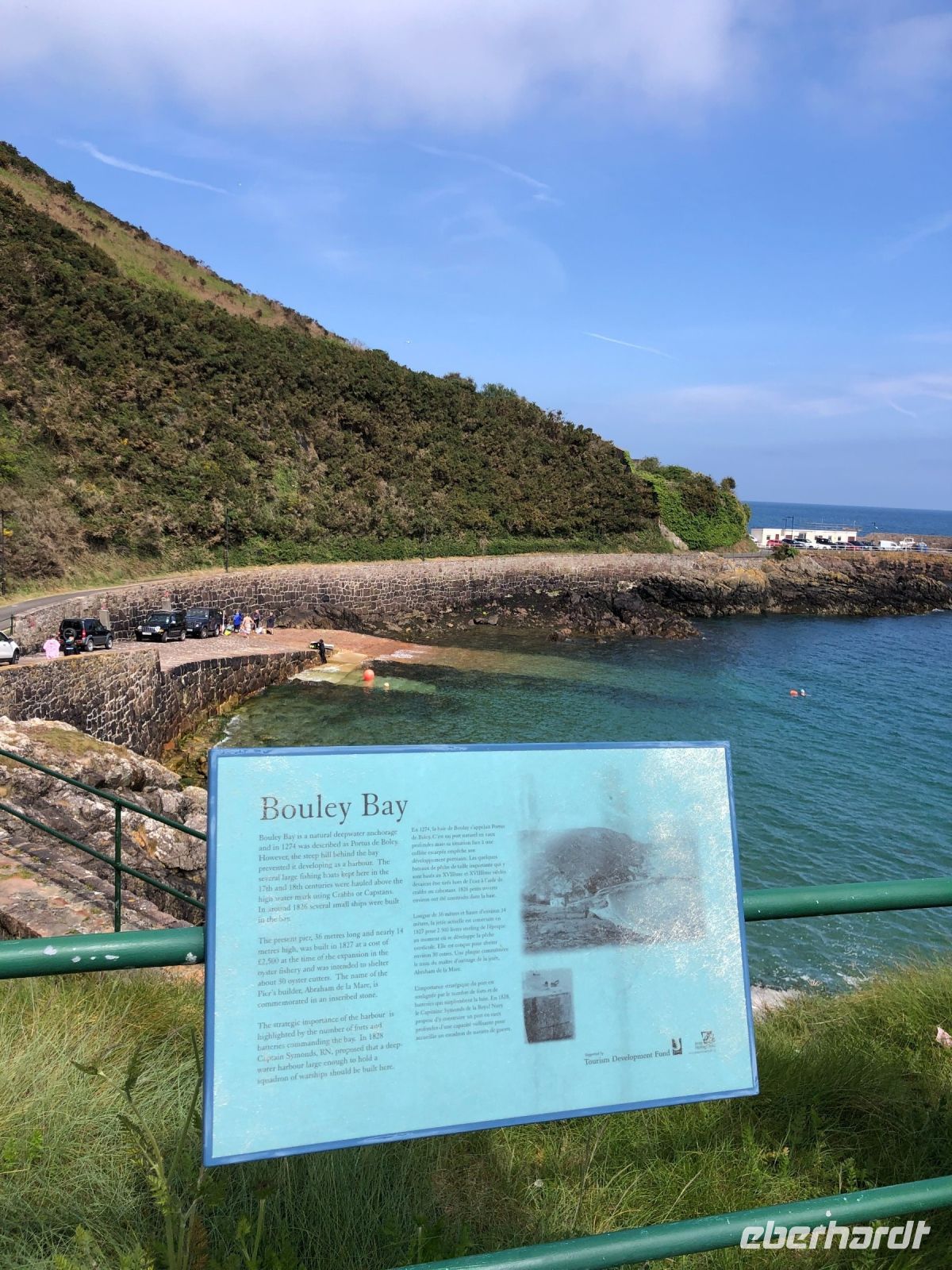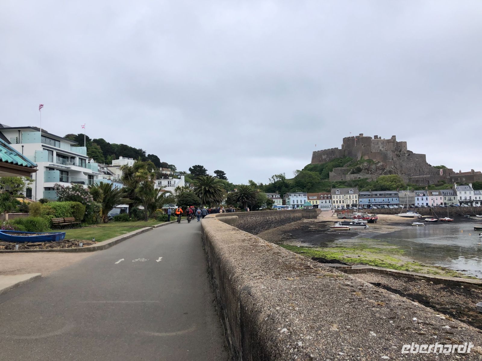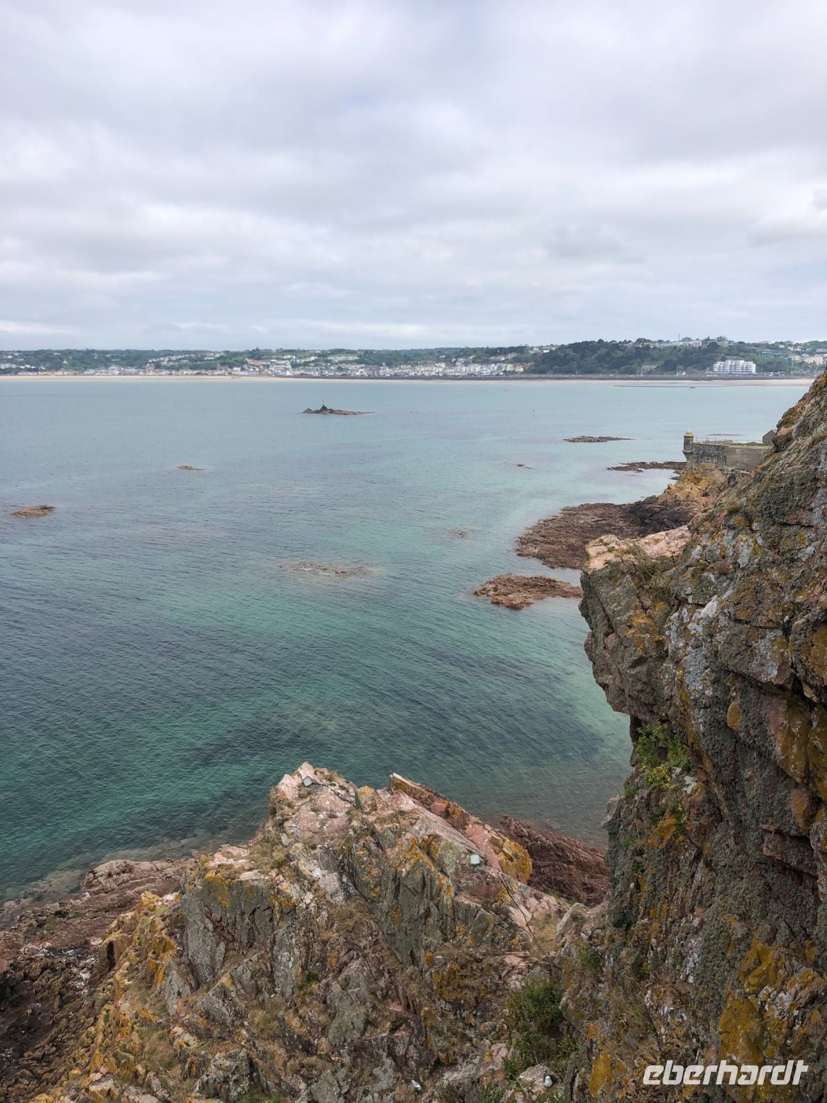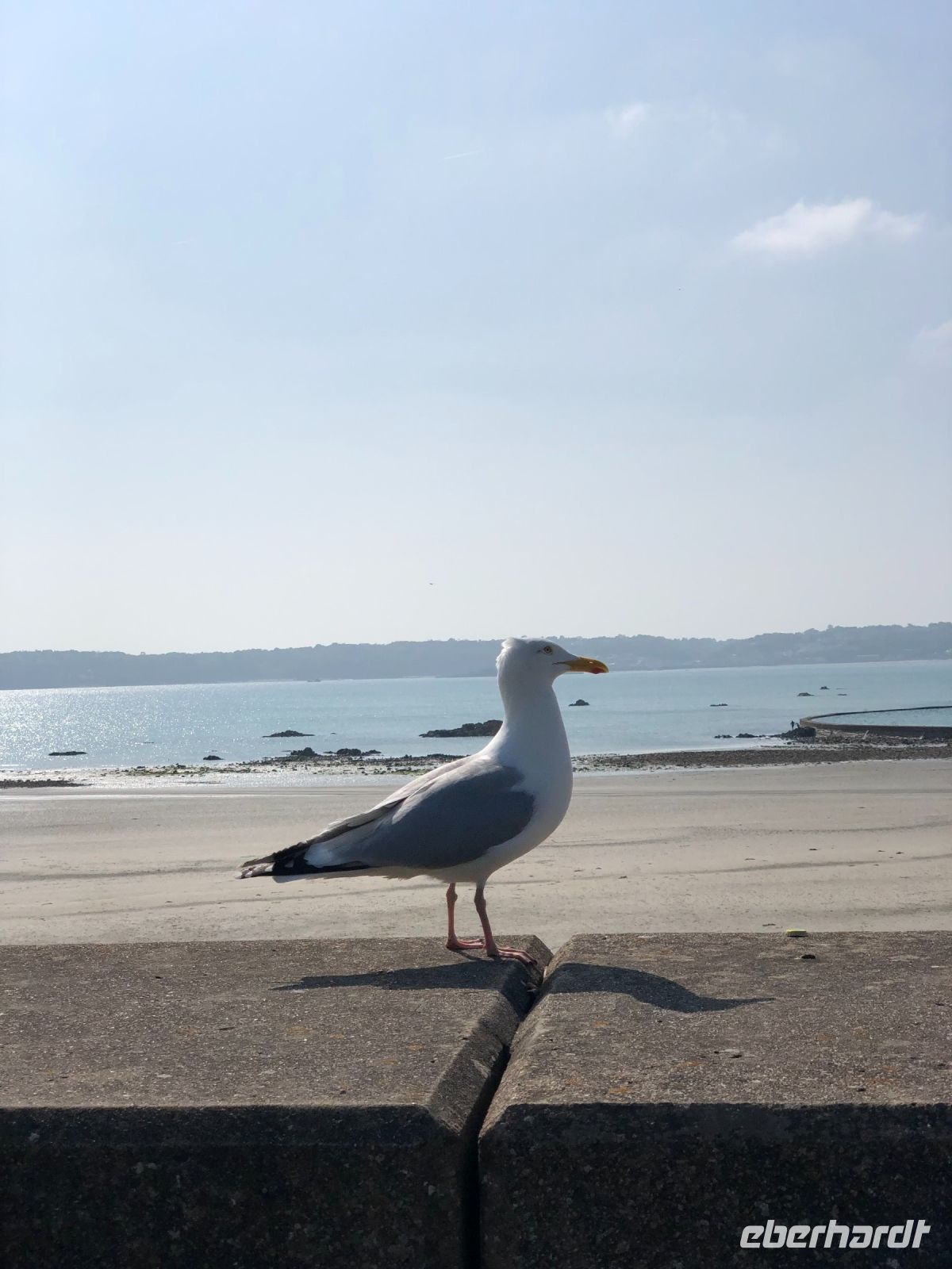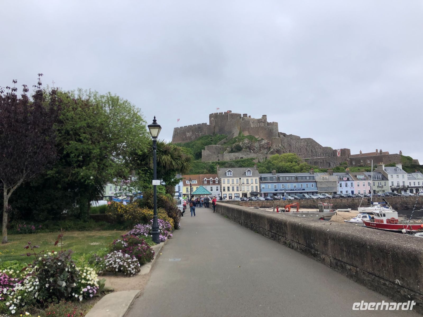 Unser Tag startete heute bereits um 08.00 Uhr. Nach dem Check-In am Fährterminal in St. Helier, betraten wir die große Condor Fähre nach Guernsey. Nach einer schaukeligen Fahrt erreichten wir dann den Hafen der zweitgrößten Kanalinsel und wurden schon von unserem örtlichen Busfahrer in Empfang genommen. Auf dem Weg nach hinauf entstand eine herrliche Kulisse mit den Kanalinseln Sark, Herm & Jethou im Hintergrund und der Burg Castle Cornet im Vordergrund. Stopp Nr. 1 der Inselrundfahrt machten wir bei der wohl kleinste Kirche der Welt, der Little Chapel- Eine von innen & außen mit Muscheln und bemalten Porzellanscherben verkleidete Kirche in Miniaturform. Nächster Halt war am Fort Grey- Ein Matelloturm, der wegen seiner Form auch Tasse und Unterasse genannt wird. Gegenüber machten wir eine kleine Kaffeepause mit Blick auf den Turm. Entlang der vielen kleinen Granithäusern mit gepflegten und blühenden Gärten im Landesinneren, erreichten wir dann Pleinmont und machten einen Spaziergang an den bunt blühenden Steilküsten. Hier trafen wir auf den sogenannten Pleinmont Observation Tower, ein fünfstöckiger Turm, welcher der deutschen Marine zwischen 1942 und 1945 als Beobachtungsturm zur Seeverteidigung diente. Wir fuhren weiter an den verschiedenen Sandstränden der Westküste vorbei und konnten einige Wellenreiter und Strandspaziergänger beobachten. Unser Busfahrer fuhr diesmal eine andere Route und zeigte uns den Guernsey Zoo. Allerdings handelt es sich hierbei nicht um einen echten Zoo, sondern um Felsformationen, die mit viel Vorstellungskraft wie Tiere aussehen. Die Rundfahrt endete in der Inselhauptstadt St. Peters Port, wo wir noch Zeit zum Bummeln durch die gemütliche Einkaufsstraße und zum Spazieren entlang der Hafenstraße hatten. Gerade als es anfing zu regnen erreichten wir glücklicherweise das Fährterminal zurück nach Jersey- Was ein Timing! In Jersey angekommen, hatte es bereits aufgehört zu regnen, so dass wir unser Hotel am Nachmittag wieder trocken erreichten.
