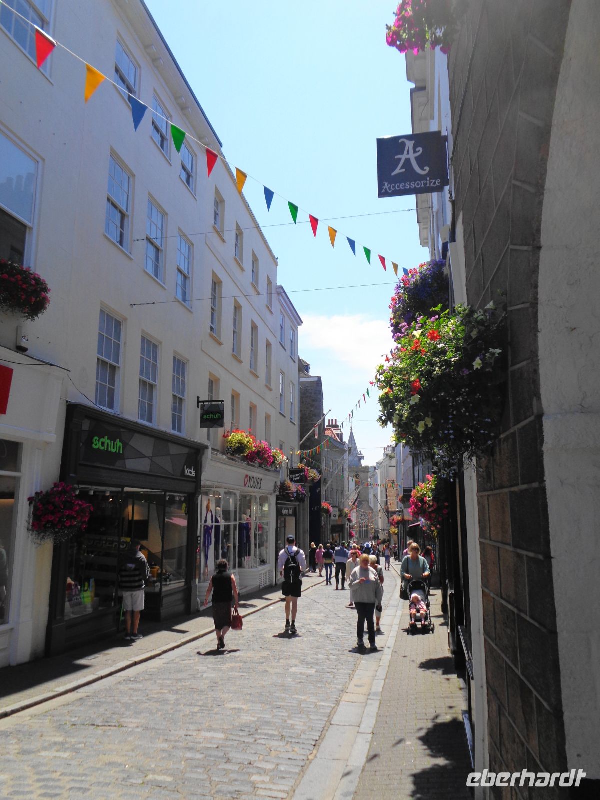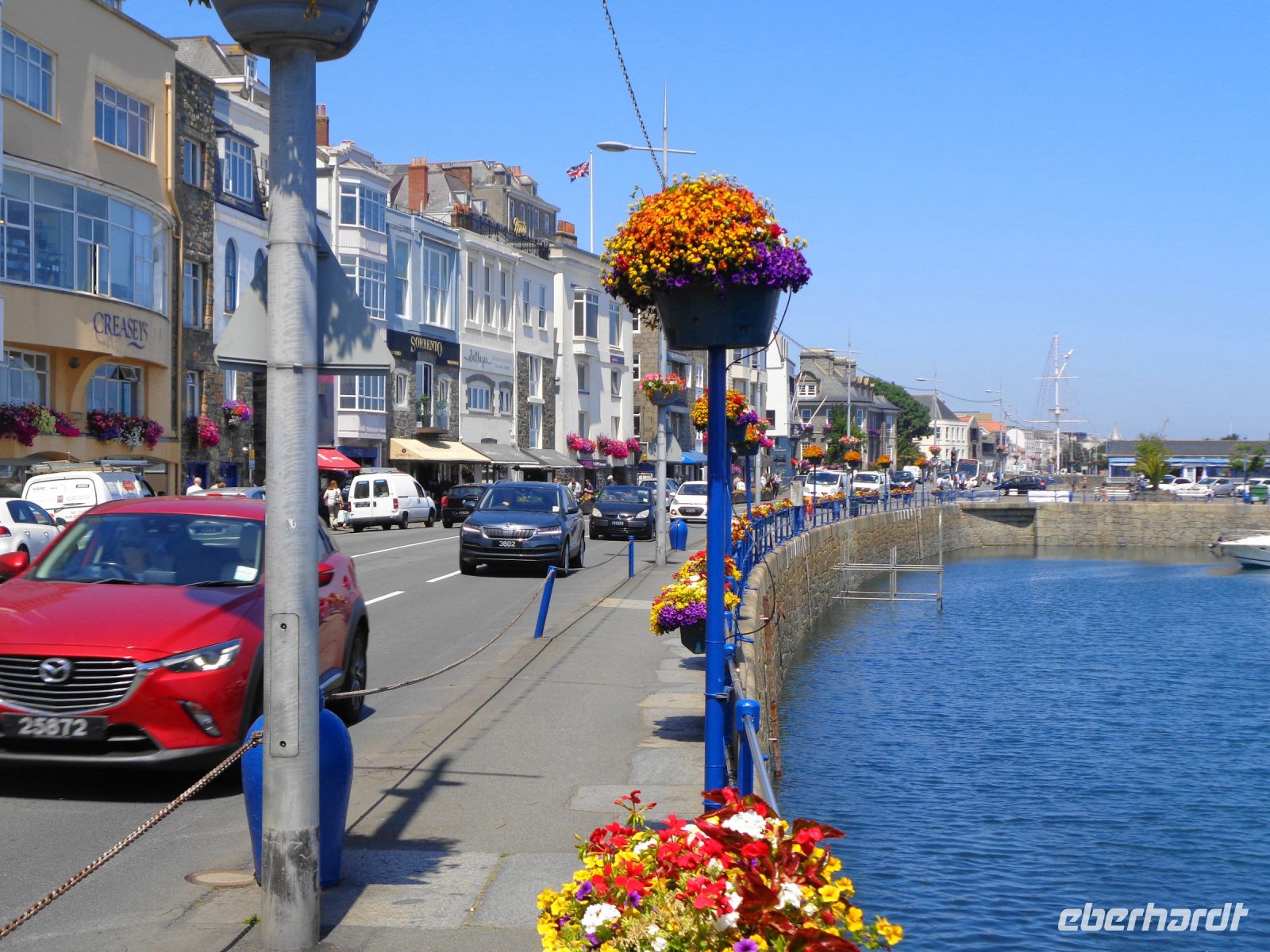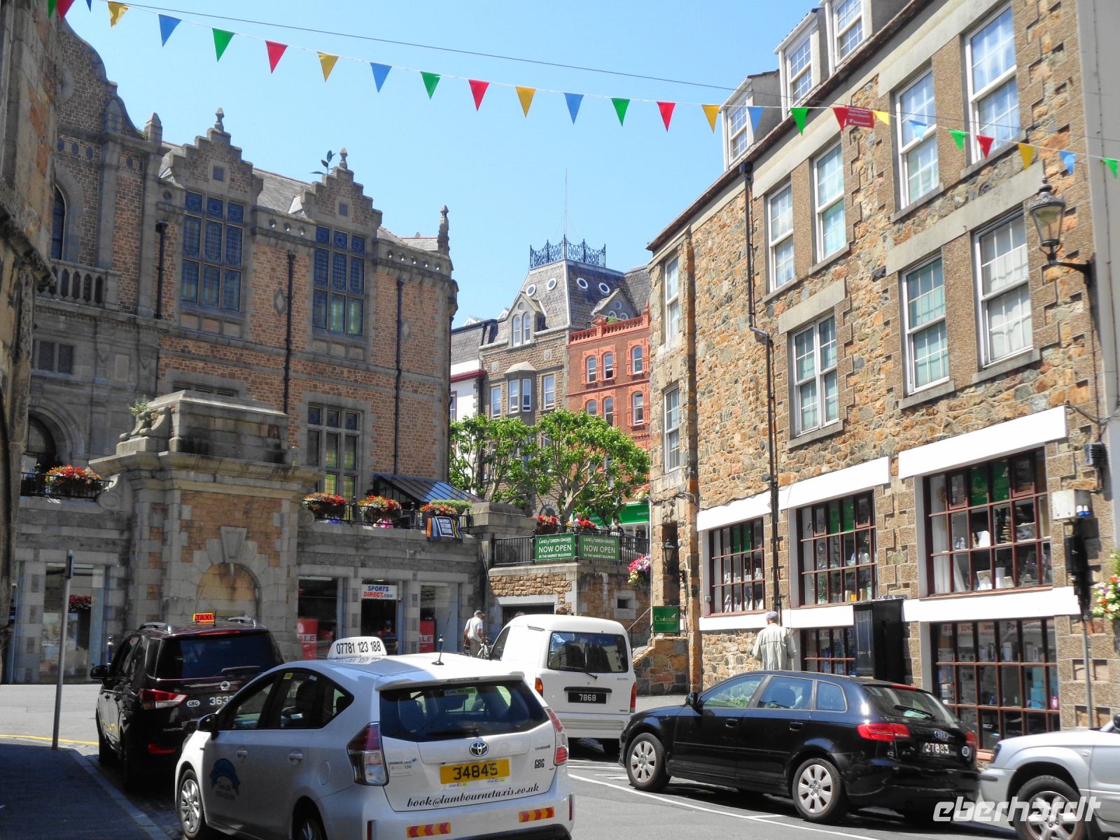 Entlang der schönen viktorianischen Häuserzeilen in Havre des Pas gelangt man über die Anhöhe ins Stadtzentrum. Hier empfiehlt sich natürlich ein Besuch der Markthalle mit ihren bunten Obst-, Gemüse- und Blumenständen. Im kleinen, aber feinen Fischmarkt kann man die fangfrischen Seefische und Meeresfrüchte bewundern, die wir in so exzellenter Weise im Hotel serviert bekommen sollten. Durch die geschäftige Fußgängerzone mit ihren einladenden Cafés und Ladengeschäften gelangt man zum historisch bedeutenden Royal Square und zur gotischen Parish Church, die einst direkt am Meer gelegen war.