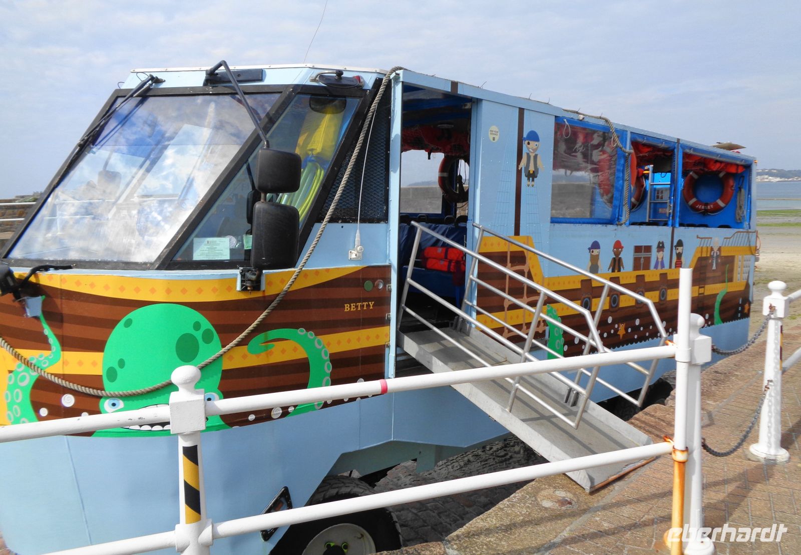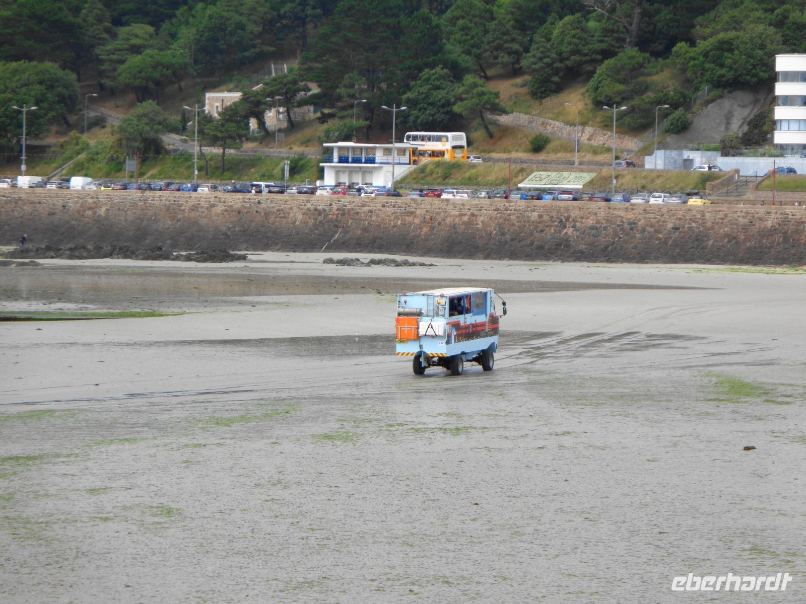 Mit dem Bus fuhren wir vom Hotel zum Anlegeplatz des Amphibienfahrzeugs, das uns bei Flut zum Castle bringen sollte, welches man nur bei Ebbe zu Fuß erreichen kann. Das Amphibienfahrzeug fährt zunächst auf Rädern über den Strand, bevor es langsam ins Wasser eintaucht und schwimmend sein Ziel erreicht.