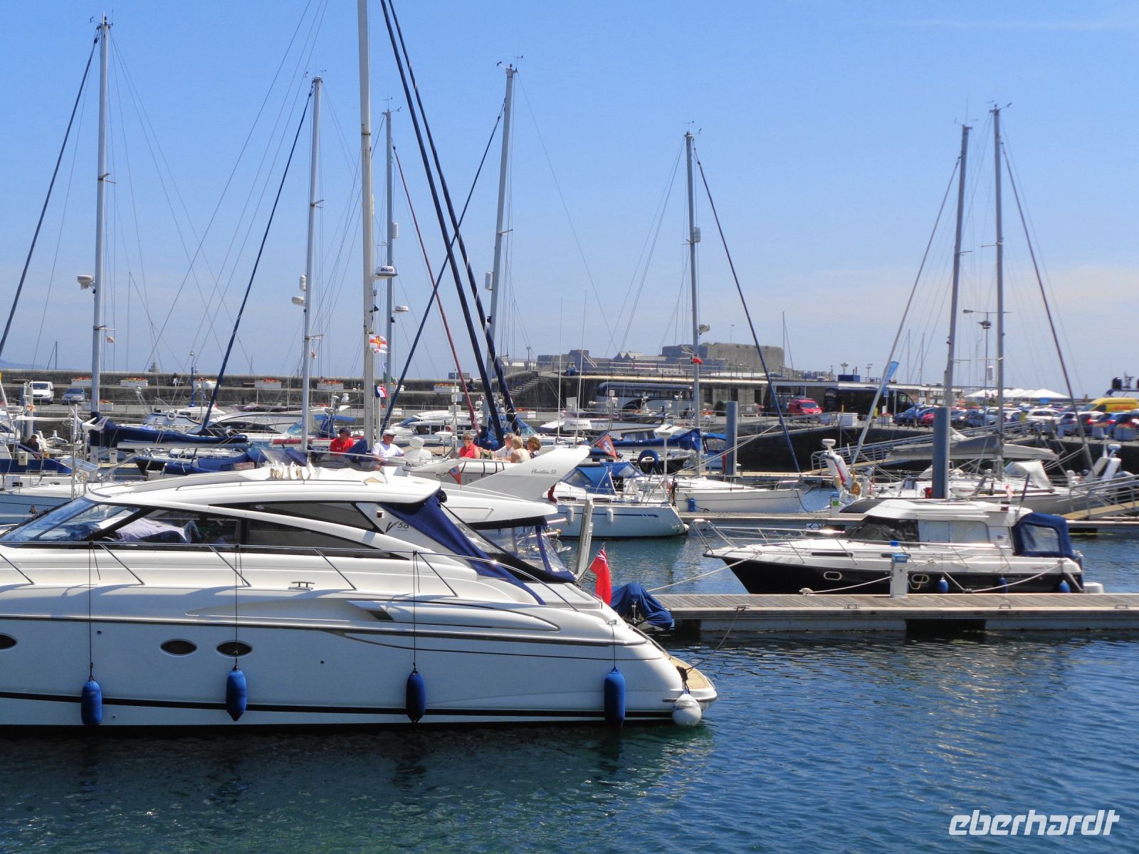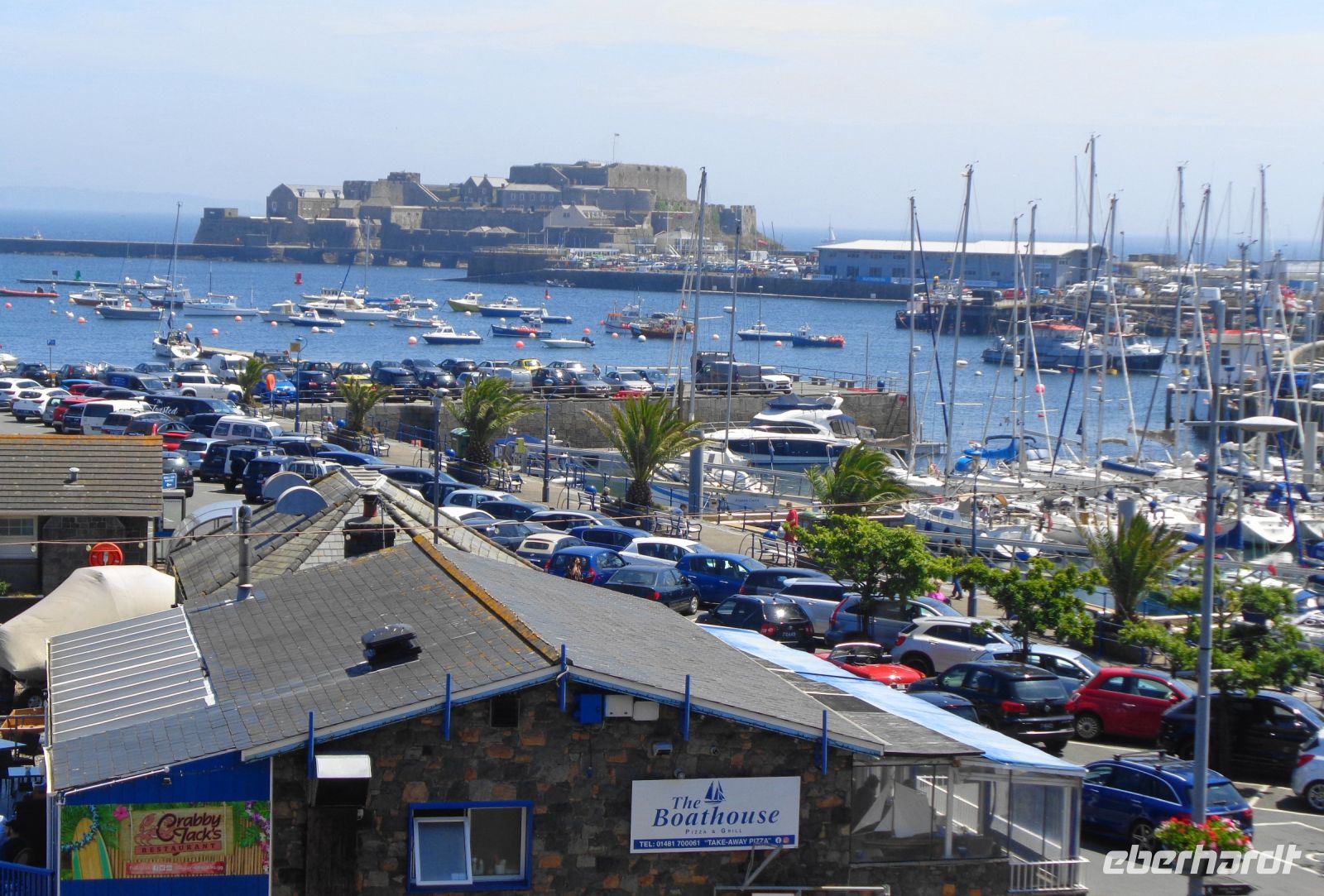 Der kleine Hafenort Gorey wird dominiert von Mont Orgueil Castle, einer malerisch auf der Anhöhe gelegenen mittelalterlichen Burg, die einst Sitz des Gouverneurs war. Im Fischerhafen laden Cafés, Pubs und Souvenirgeschäfte zum Verweilen ein. Die Palmen an der schönen Strandpromenade wurden stark vom Wind gebeutelt und die zahlreichen Schiffe in dem kleinen Hafen lagen bei Ebbe alle im Trockenen.
