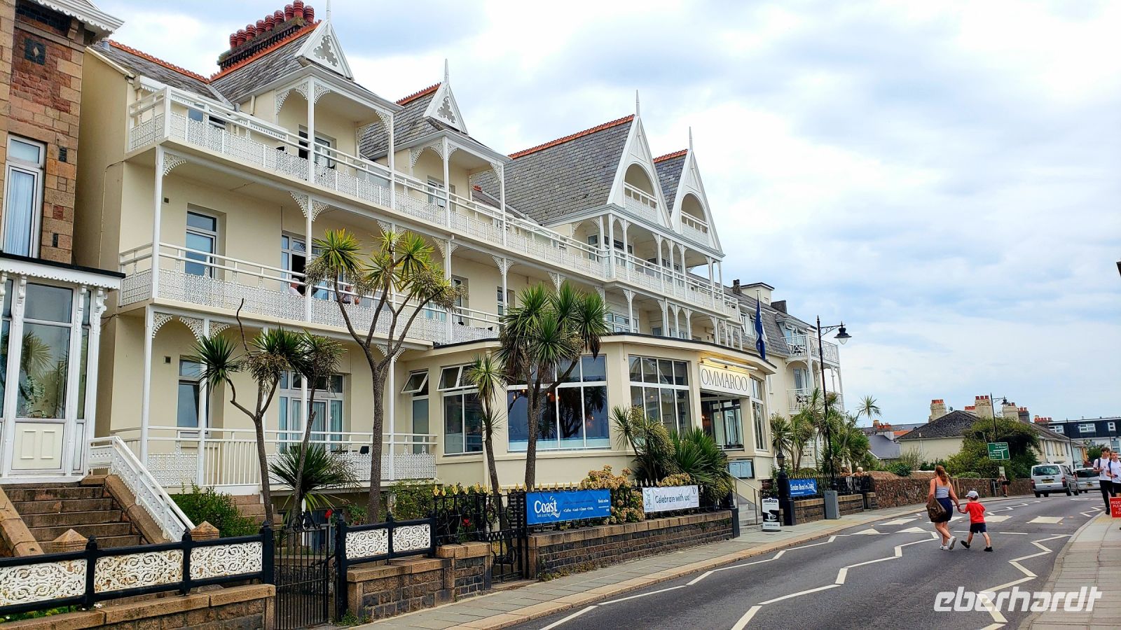 Ich treffe einen Teil der Gruppe in Berlin auf dem Flughafen, gemeinsam geht es nach München, wo weitere Gäste zur Gruppe stoßen und dann fliegen wir direkt nach Jersey. Alle Flüge sind pünktlich und in Saint Helier werden wir von Eddy abgeholt und mit dem Kleinbus ins Hotel Ommaroo gebracht. Unterwegs sehen wir schon Elisabeth Castle und die malerische Bucht, an der auch unser Hotel liegt. Das Hotel ist ein imposanter Bau aus dem 19. Jahrhundert, die Zimmer sind modern, hell und freundlich eingerichtet.
