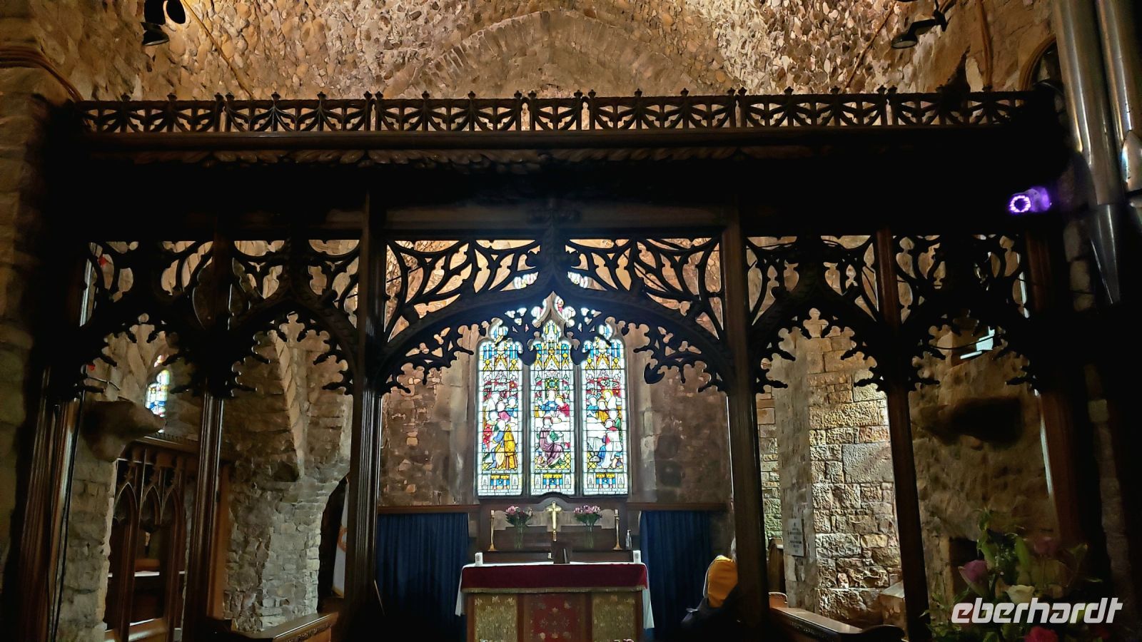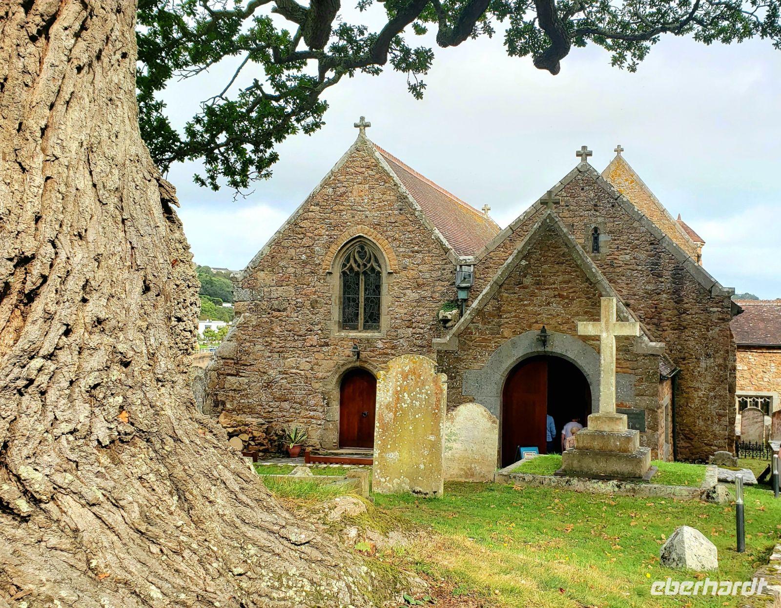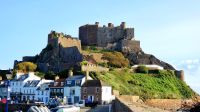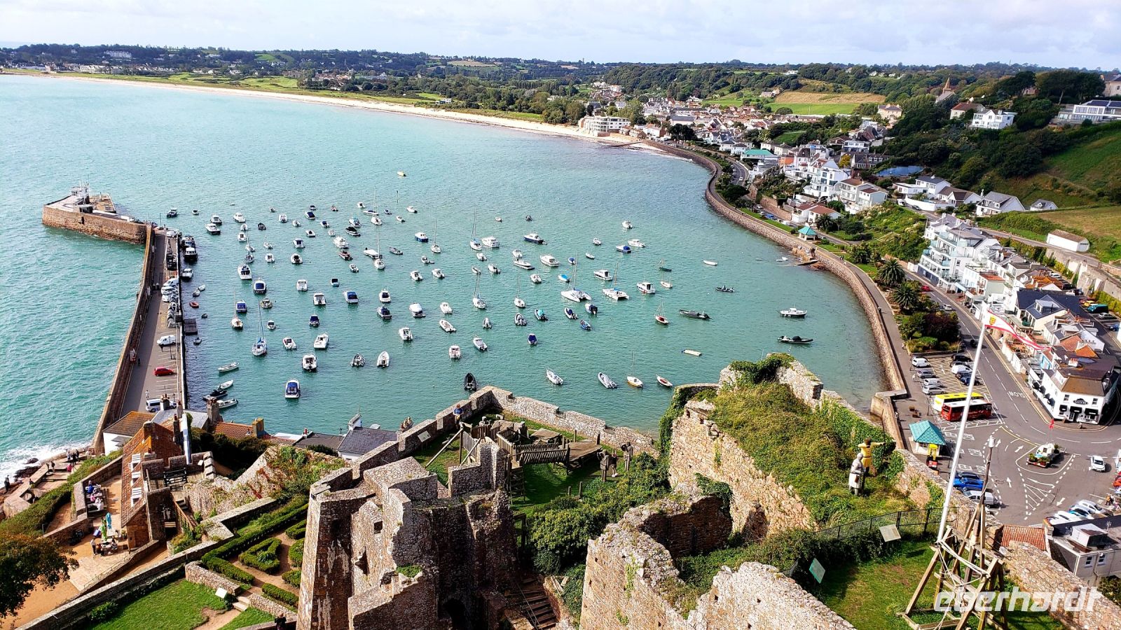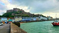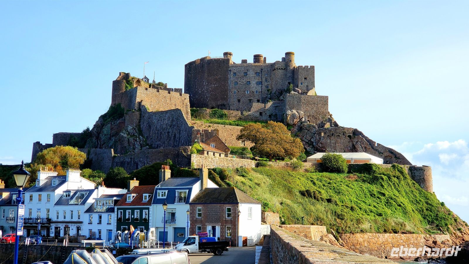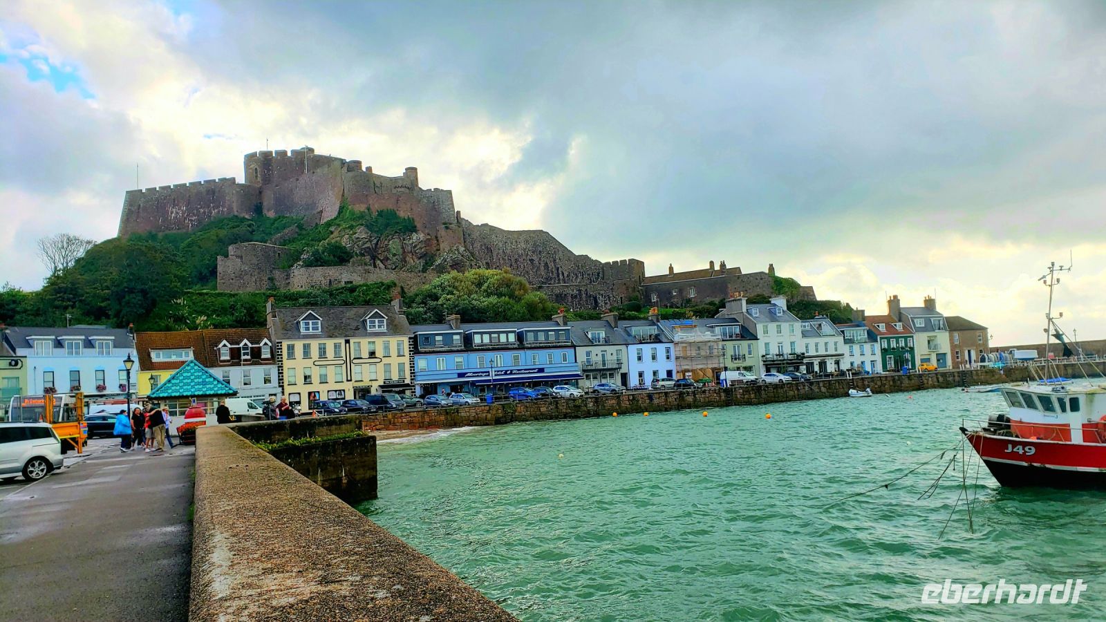 Aussicht zu genießen und Fotos zu machen. Besonders gefällt uns der Ort Gorey mit der imposanten Burg im Hintergrund und Fischerhäusern davor mit kleinen Geschäften. Zum Mittagessen kehren wir in ein typisch englisches Pub ein, wo es sehr gemütlich ist und das Essen lecker. Nach dem Essen schauen wir uns noch die Kirche St. Brelade an und haben Zeit, am längsten Strand der Insel zu spazieren.