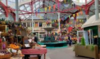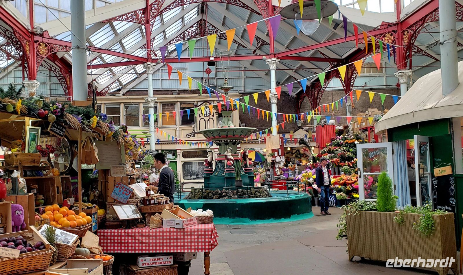 Heute gibt es keine organisierte Tour mehr, da Heidi und Ernst in den wohlverdienten Urlaub nach Österreich fliegen, weshalb alle Touren an den Anfang der Woche gelegt wurden. Ich habe der Gruppe verschiedene Aktivitäten vorgeschlagen und 6 Gäste kommen mit mir nach Gorey, dir anderen wollen erstmal ausschlafen und dann shoppen gehen. Der Bus 1 fährt um 9 Uhr von unserem Hotel direkt dorthin, an der schönen Küste entlang. Wir spazieren am Pier entlang und steigen dann zur Burg herauf, schauen uns alle verwinkelten Räume und Gänge an und genießen die spektakuläre Aussicht von ganz oben auf die Bucht. Es ist klare Sicht bis Frankreich und sehr sonnig. Wieder unten, trinken wir noch etwas und bummeln anschließend die kleine Geschäftszeile entlang. Um 12.30 Uhr nehmen wir wieder den Bus, fahren am Hotel vorbei gleich bis Liberation Square. Von dort gehen wir zur viktorianischen Markthalle, wo wir in Rosie's Tea Room am Rand der Halle draußen eine Kleinigkeit essen. Dann trennen sich unsere Wege, einige bummeln noch weiter, andere gehen zum Hotel ausruhen.
