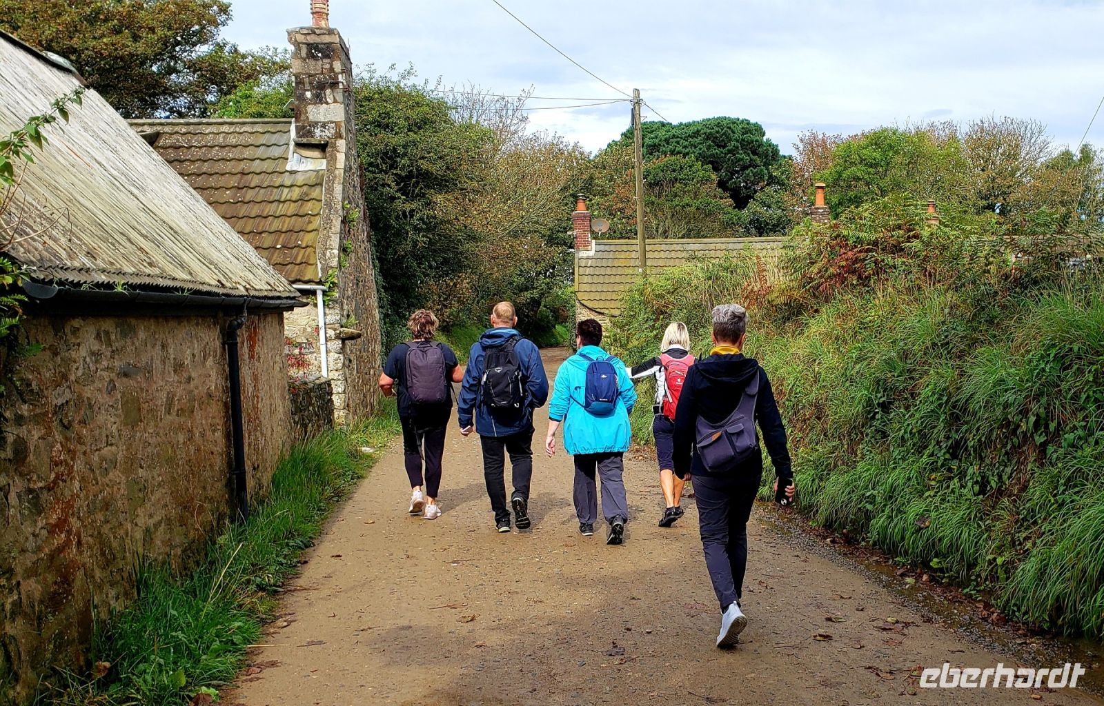 Für unseren Ausflug zur Insel Sark war den ganzen Tag Regen angekündigt, sogar mit Gewitter. Aber wenn Engel reisen, scheint natürlich die Sonne und zwar den ganzen Tag! Die Fahrt mit der Fähre dauert eine Stunde und wir fahren zunächst entlang der Küste von Jersey, wo wir den Corbiere Leuchtturm und das Elisabeth Castle sehen. Unsere Guidin Heidi, eine Österreicherin, die mit ihrem Mann Ernst schon seit vielen Jahren auf Jersey lebt, führt uns über die Insel. Alle Gäste zeigen sich begeistert von Sark, den Wanderungen und den Seigneurie Gärten. Entlang typisch englischer Cottages und üppigen Waldstücken finden die Gäste viele Fotomotive. Zum Mittagessen im Garten eines Restaurants bestellen die meisten Fish & Chips und es schmeckt allen sehr gut. Die vier Stunden Aufenthalt gehen viel zu schnell vorbei, dann fährt die Fähre schon wieder zurück nach Jersey. Die Gäste sind sich einig, dass es ein wunderschöner Tag war und sagen den zweien, die nicht mit waren, dass sie wirklich etwas verpasst haben.