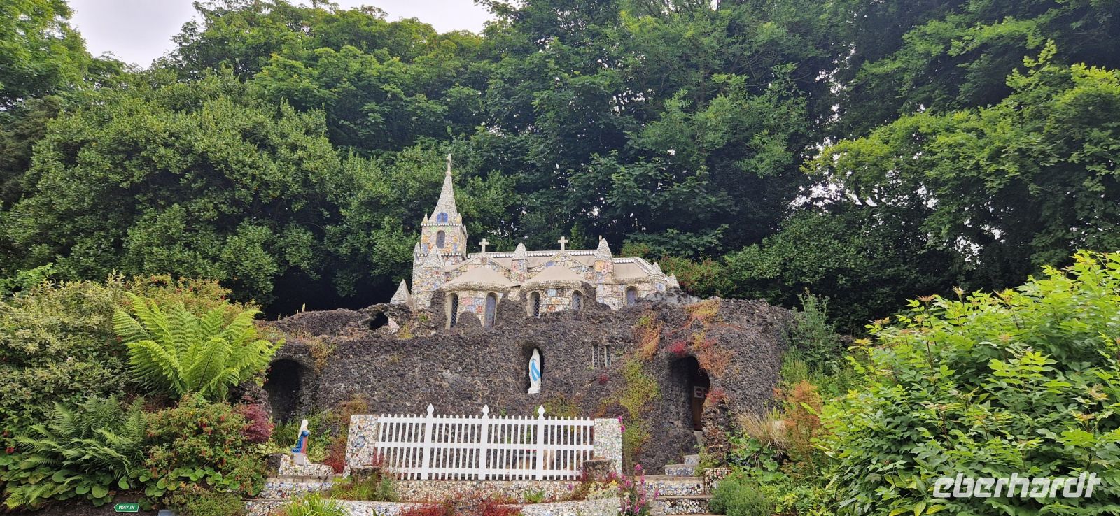 Es erwartete uns der örtliche Reiseleiter Ken und ein Kleinbus, mit dem wir zu einer kleinen Rundfahrt starteten. Die Fahrt geht an die Steilküste zur Saints Bay und dann weiter zur Little Chapel. Eine lustig wirkende Miniaturausgabe der Basilika von Lourdes, die von Bruder Déodat 1914 hier errichtet wurde. Es ist der dritte Bau(versuch), der nun tatsächlich auch zu betreten ist. Die Außen und Innenwände sind liebevoll mit Scherben verziert. Wir fahren die Westküste entlang und schauen auf das Meer und die langen Mauern als Schutz vor den Gewalten der Gezeiten. Dann geht es zurück nach St. Peter Port. Manny lädt uns ein diese Stadt näher kennenzulernen und erzählt viel Interessantes. Höhepunkt im wahrsten Sinne des Wortes war der Aufstieg oberhalb des Marktes, wo man einen herrlichen Blick über die Stadt und den Hafen hatte.