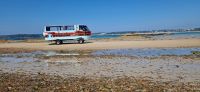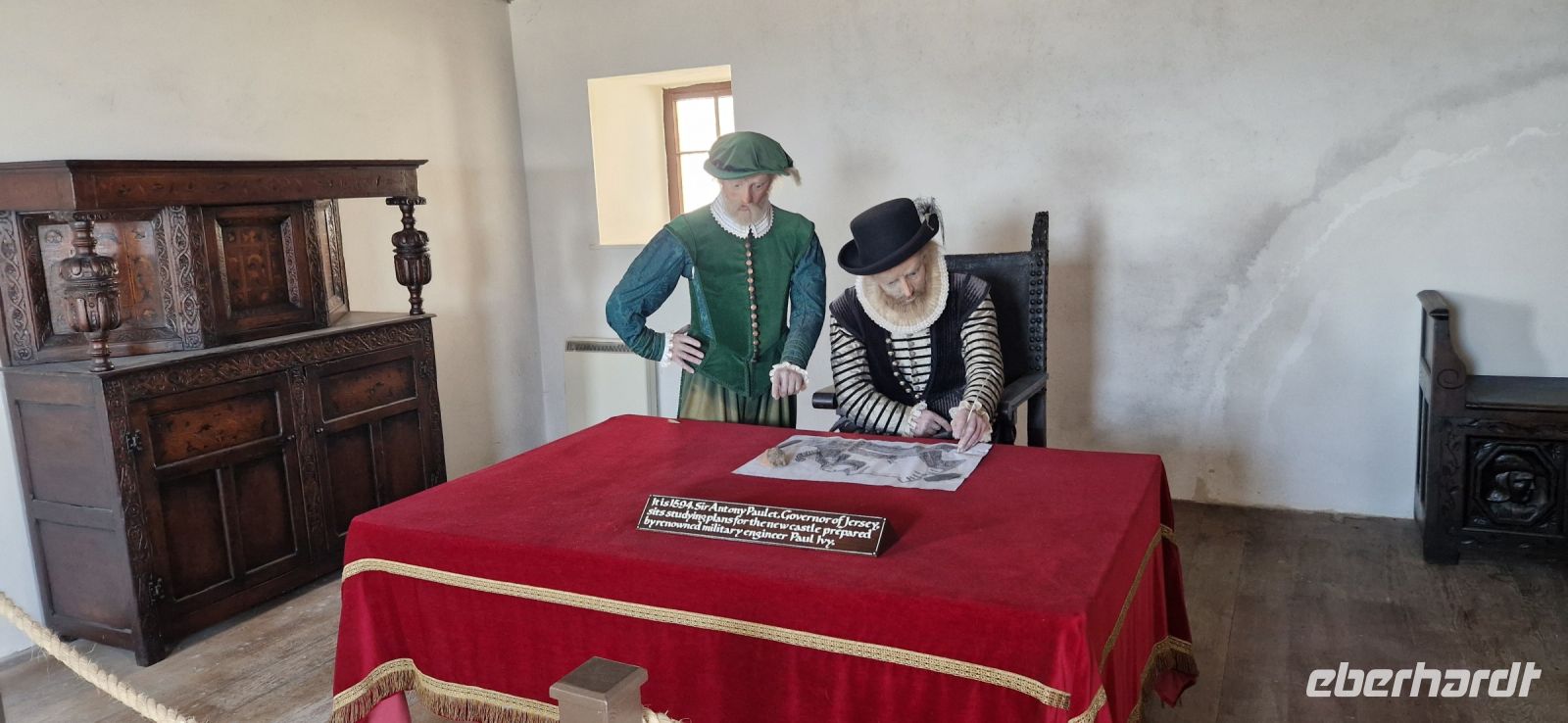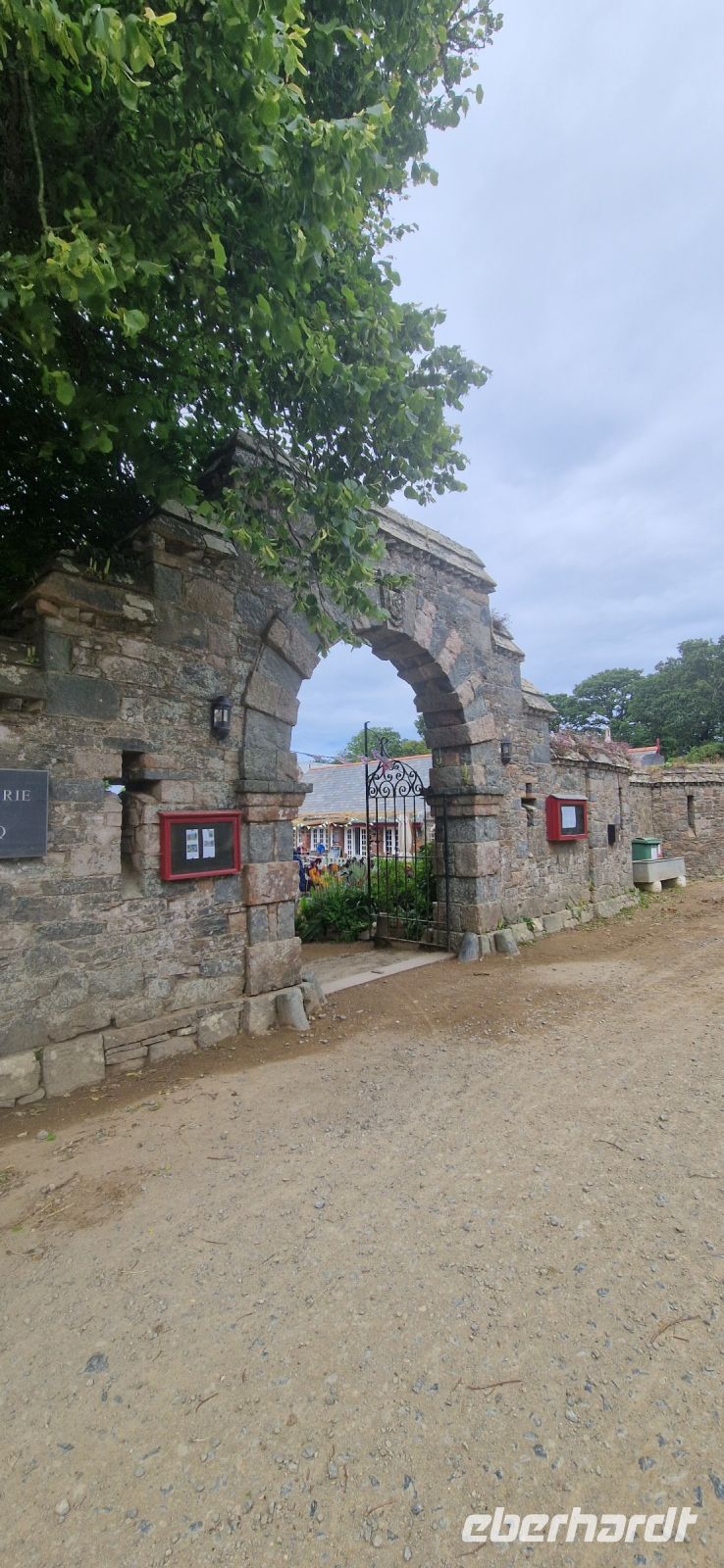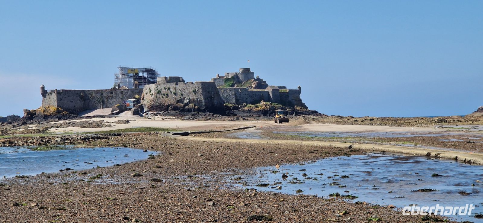 Das Angebot, Elisabeth Castle zu besuchen, nahmen einige Gäste dankend an. Wir liefen gemeinsam zu der Stelle, wo man die Burganlage zu Fuß erreichen kann. Es war Ebbe und der Weg dahin problemlos passierbar. Ein bereitstehendes Amphibien-fahrzeug war nicht erforderlich. Es sei denn, man verpasst die Zeit und muss auf dem Rückweg dort einsteigen. Im Gelände der Burg besichtigten wir individuell das Terrain der Festung.