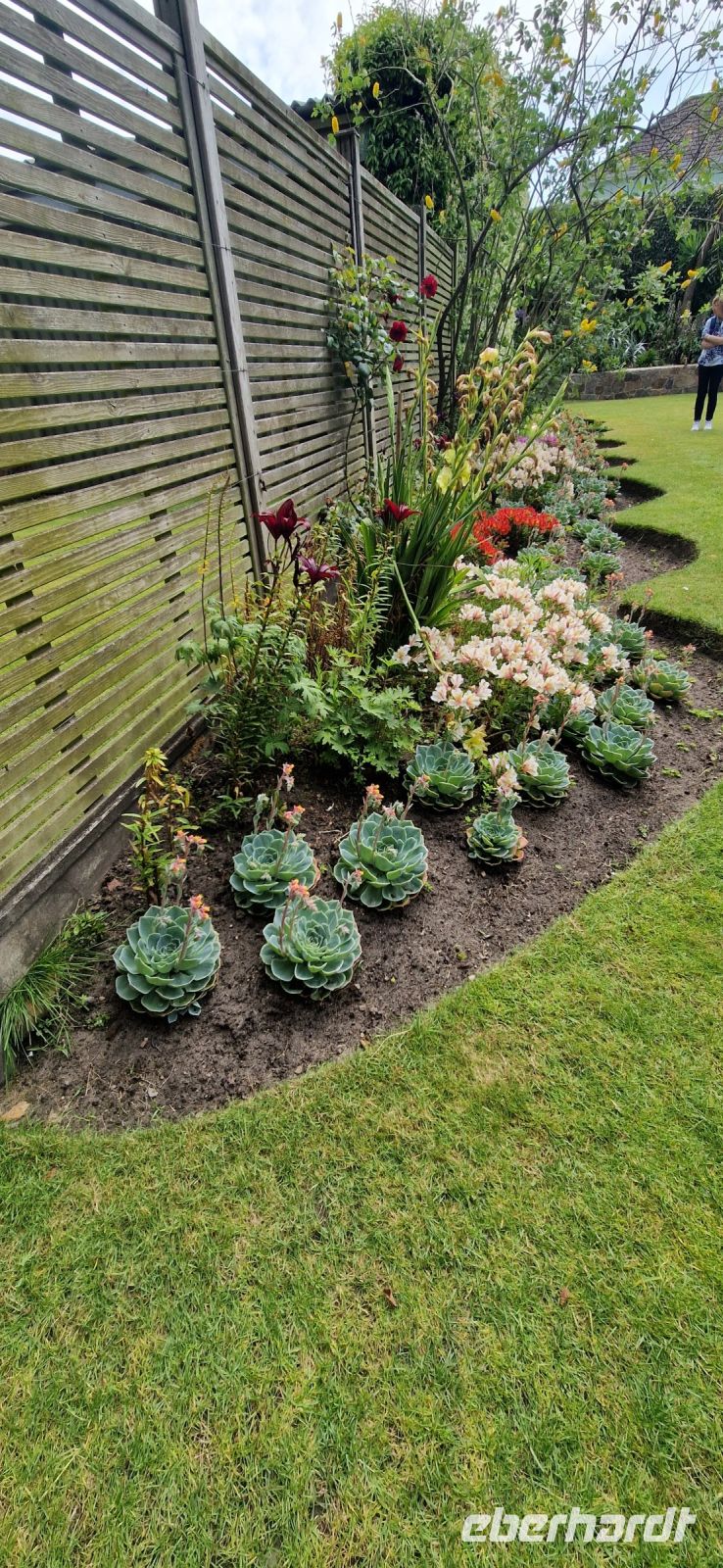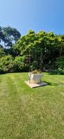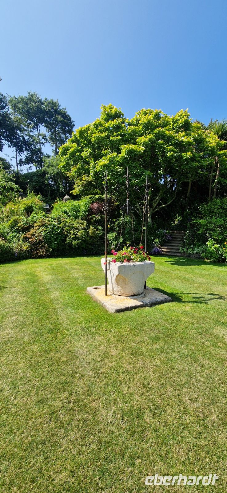Nach einer Stunde ging es weiter zum nächsten Garten. Auch hier empfing uns der Hausherr persönlich. Dieser Garten entsprach schon eher den Erwartungen, denn er zeigte seinen typischen englischen Charakter mit gepflegtem Rasen und einer mediterranen farbenfrohen Pflanzenvielfalt auf klar angeordneten Beeten. Die im griechischen Stil erbaute Villa wurde im Eingangsbereich von einem Springbrunnen geschmückt.