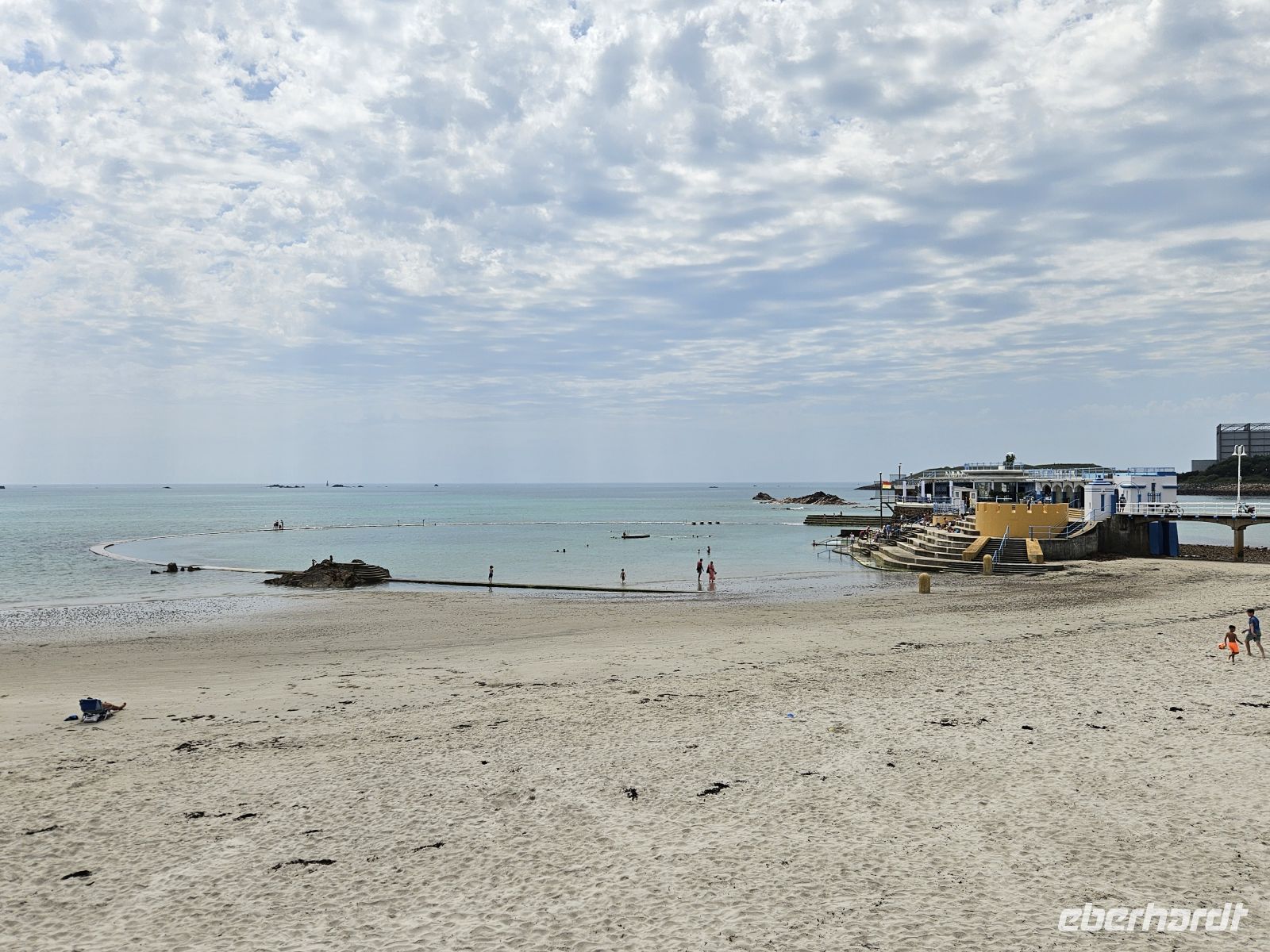 Hinter der Kirche befindet sich der Coronation Park, über den man wieder direkt zum Meer gelangt. Die eintretende Ebbe, der weite Strand und der strahlend blaue Himmel, luden geradezu zu einem 45-minütigen Spaziergang zu dem hübschen Hafenstädtchen St. Aubin ein. Hier kehrten einige aus unserer Gruppe in das Lokal „Boat House“ mit Blick direkt zum Hafen ein.