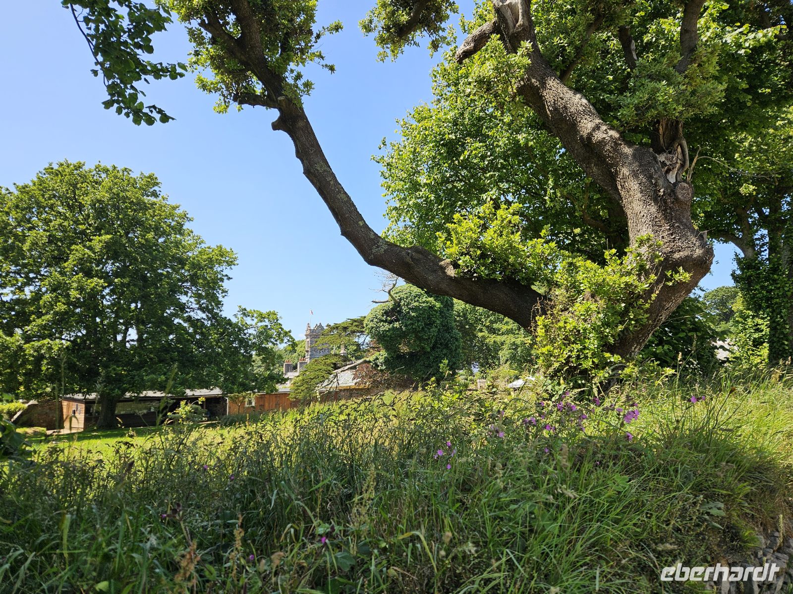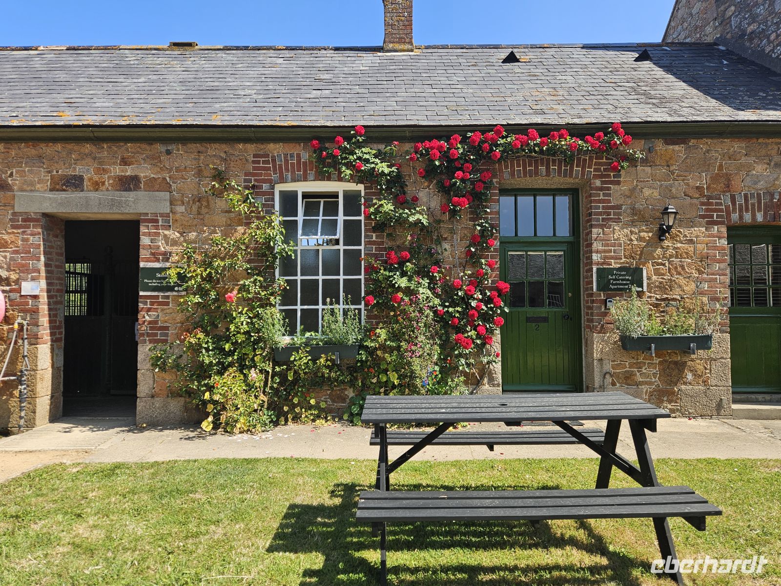 Auf dem Rückweg machten wir Stop an Boutiquehotel Chateau Chatre. Anne lockte uns unter dem Vorwand hierher den Taschentuchbaum zeigen zu vollen. Dieser war allerdings schon verblüht und anstatt der weißen Blüten sahen wir nur noch grüne Blätter an dem Baum. Der wahre Grund, warum wir zum Chateau Chatre fuhren, war jedoch ein ganz anderer: Hier wartete eine Überraschung auf die Gruppe und alle wurden zum typisch britischen Cream Tea eingeladen. Zum kräftigen Schwarztee werden ein frisch gebackener, fluffiger Scone, Erdbeermarmelade und Clotted Cream serviert. Anne meinte auch, dass es in dem Hotel die besten Scones auf der gesamten Insel gäbe.