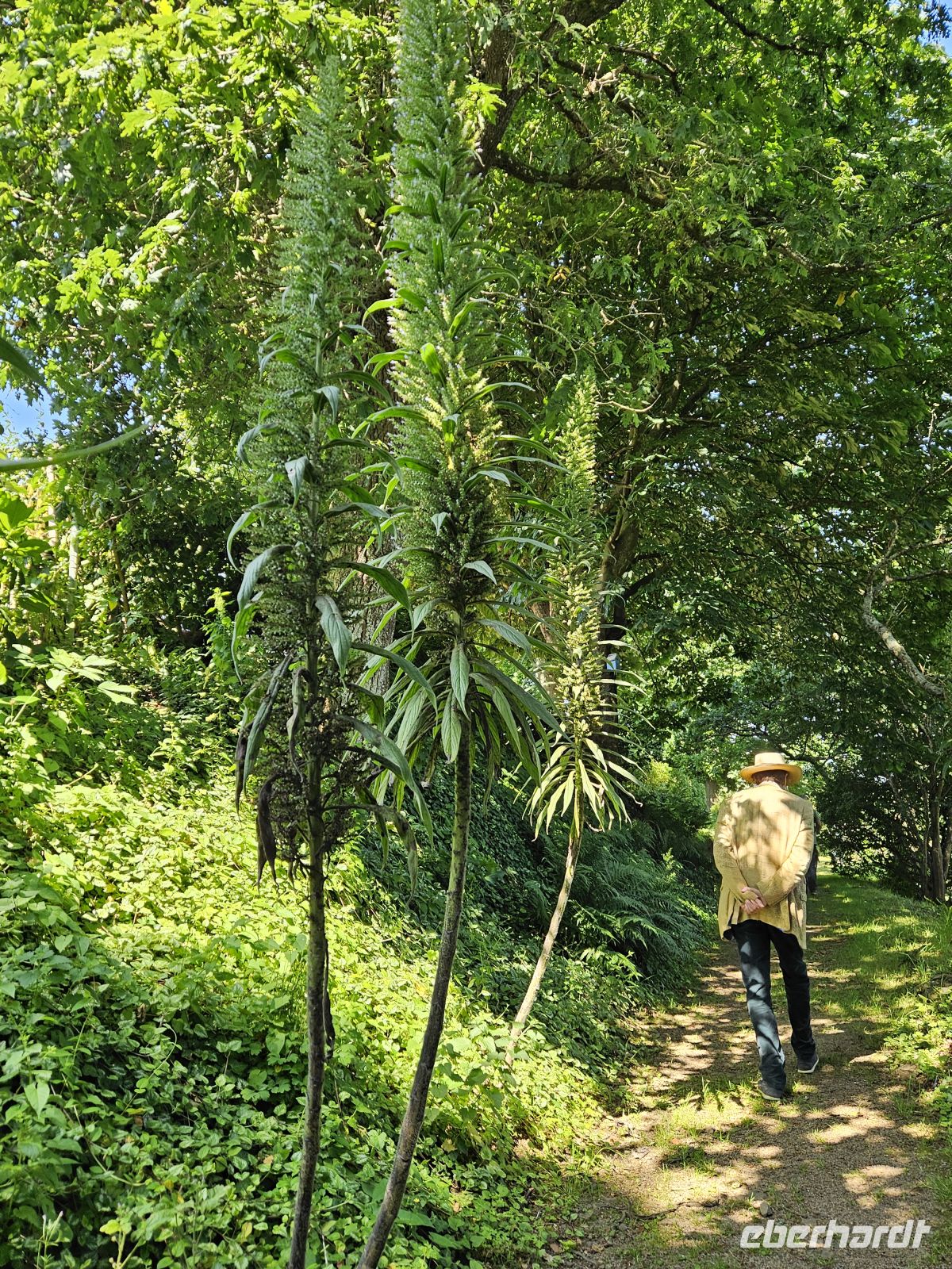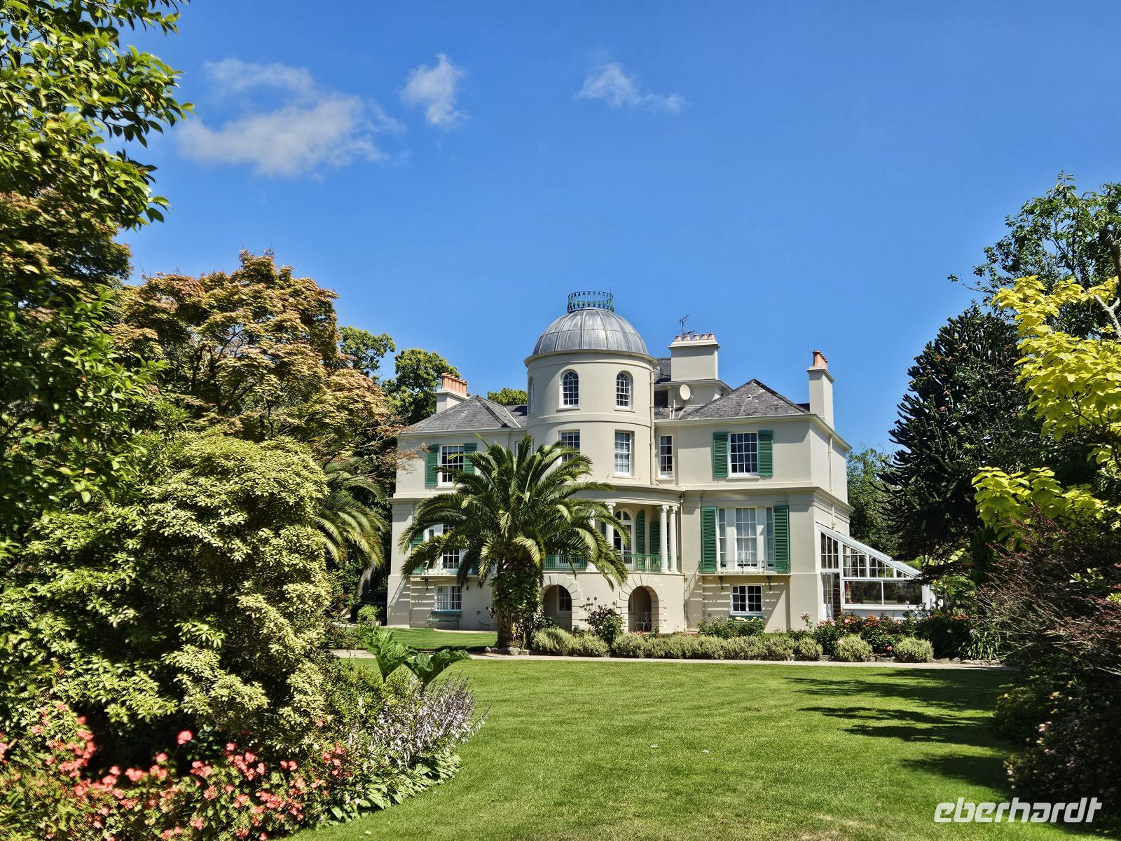 Als Erstes statteten wir Mr. & Mrs. Binny einen Besuch ab. Mr Binny hat zahlreiche Bücher geschrieben – beispielsweise über die Schlösser Schlesiens. Zudem wurde ihm mal die Ehre zuteil von Prinz Charles zum Lunch eingeladen worden zu sein. Gemeinsam mit seiner Frau und zwei Hunden lebt Mr. Binny in einem schönen Zinkerbau. Vom Haus führt ein kleiner Pfad direkt ins Grüne. Dieser Teil des Gartens etwas Wildes und Verwunschenes. Die Hortensien erblühten gerade in einem kräftigen blau und wir entdeckten eine riesige Magnolienblüte, die größer, als eine Handfläche war. Als nächstes besuchten wir Richard Miles. Sein Haus wurde im Jahr 1809 im griechischen Stil erbaut. Sein Garten ist besonders akkurat angelegt. Zudem hat Mr. Miles auch eine Schwäche für ausgefallene Pflanzen. So konnten wir an einer „Ananaspflanze“ riechen, die tatsächlich den Geruch von Ananas verströmte. Inmitten des Gartens war auch ein Teich angelegt, in dem riesige Koikarpfen schwammen. Auch Kiefernbäume gab es in dem Garten und wer wollte konnte sich eine der heruntergefallenen Kiefern mitnehmen. Anne erzählte uns später, dass der Hauptgärtner von Richard Miles aus Madeira kommt und so auch die Vielzahl der mediterranen Pflanzen zu erklären ist. Zudem wird nur ganz wenigen Bewohnern auf der Insel die Ehre zuteil solche Privatgärten zu erblicken und wir haben großes Glück, dass uns diese Pforten geöffnet wurden.