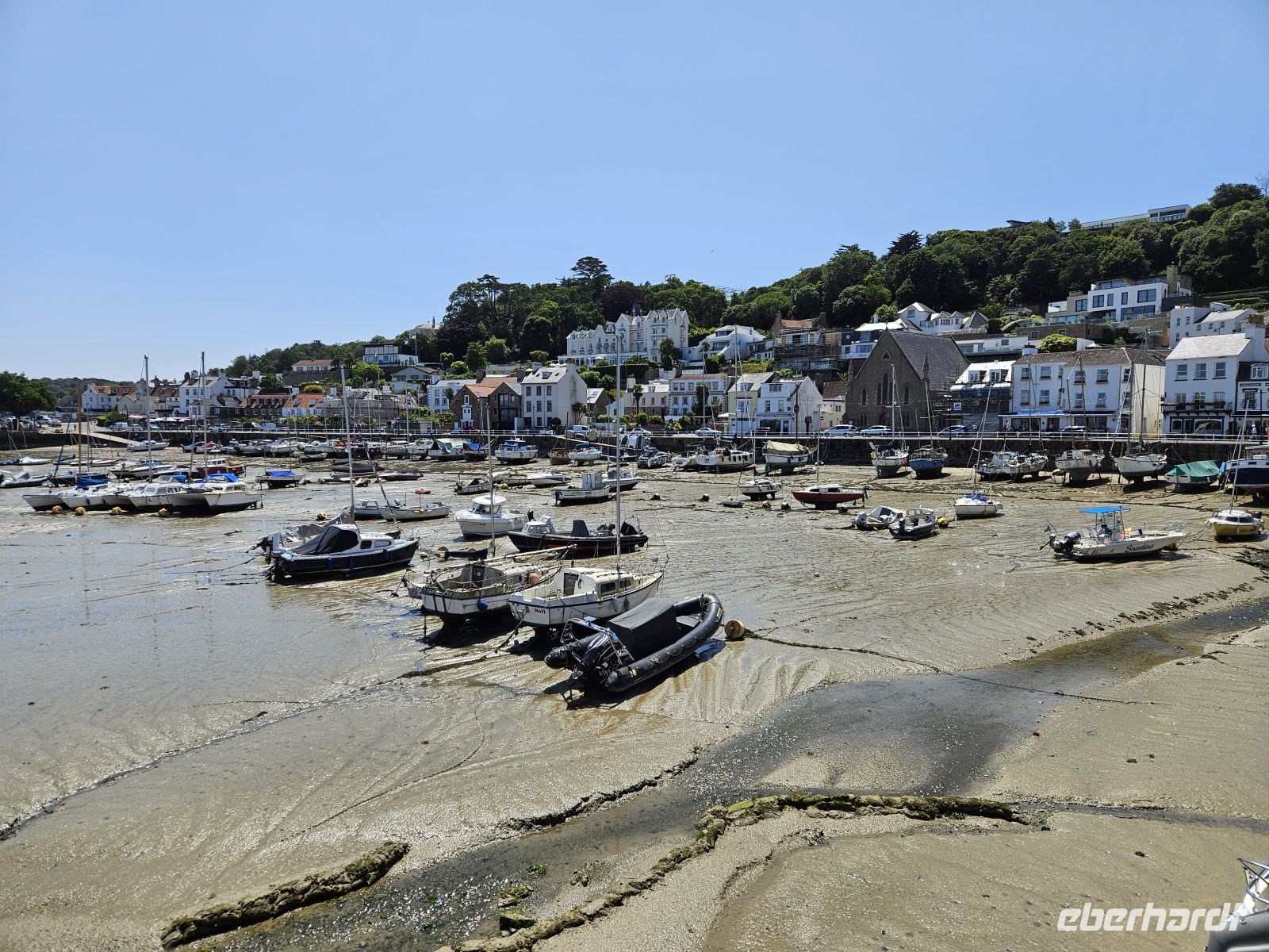 Nach dem Hotelfrühstück wartete bereits Jane mit ihrem kleinen Reisebus auf uns. In ihm saß auch gleich unsere Reiseleiterin Ann, die uns die kommenden Tagen Jersey und Guernsey zeigen wird. Am heutigen Tag stand gleich eine Inselrundfahrt entlang der Küste auf dem Programm: Unser erster Halt war La Rocque. Das kleine Hafenstädtchen ist vor allem bekannt für die größten Unterschiede zwischen Ebbe und Flut auf der Insel.
