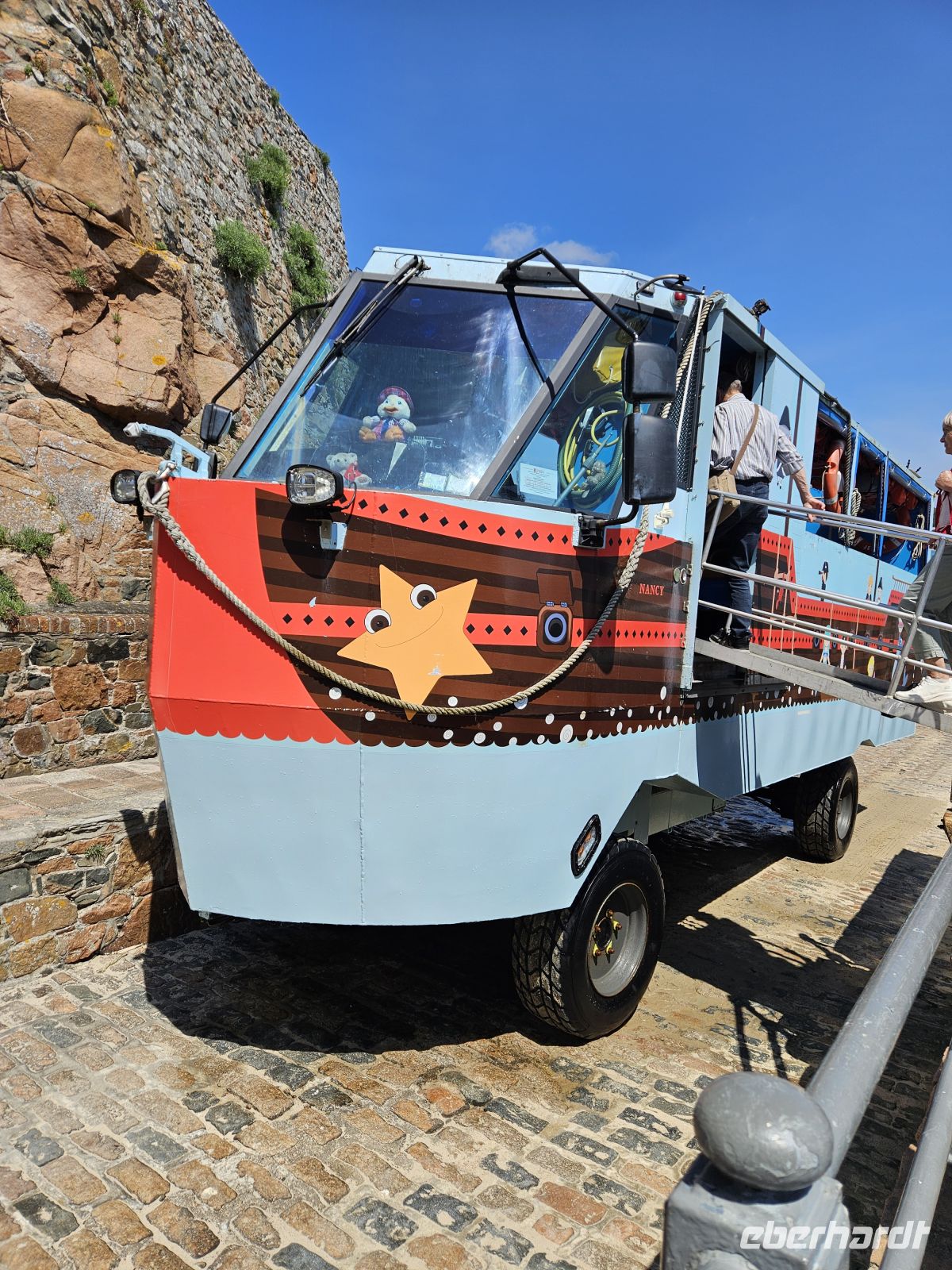 Pünktlich um 10.00 Uhr erreichten wir das Elizabeth Castle. Das Amphibienfahrzeug fährt zu jeder halben Stunde und kann je nach Stand der Ebbe und Flut schwimmen oder die Räder ausfahren und zum Elizabeth Castle über das schlammige Watt fahren. Um 10.30 Uhr hatte das Amphibienfahrzeug Nancy auch für die gesamte Gruppe Platz und wir setzen zum Elizabeth Castle über. Die Inselfestung Elizabeth Castle wurde im 15. Jahrhundert erbaut und verteilt sich auf einem Gelände von mehr als 24 Hektar. Die Burg sollte St. Helier beschützen, da die Festung in Gorey, als Schutz der Insel vor den Franzosen, nicht mehr ausreichte. Zudem sollte die Festung einen wichtigen Ankerplatz für Handelsschiffe bilden. Im Laufe der Jahrhunderte wurde die Burganlage für unterschiedliche Zwecke eingesetzt. Während der deutschen Besatzung von 1940-1945 war die Burg beispielsweise in Besitz der Deutschen und wurde von ihnen neu befestigt.