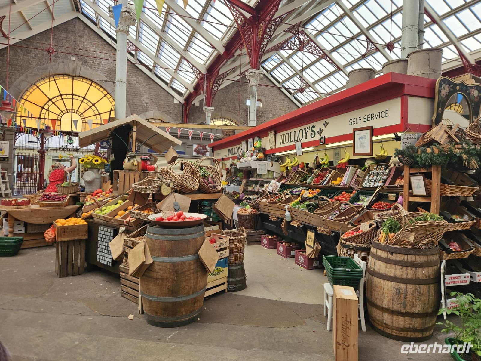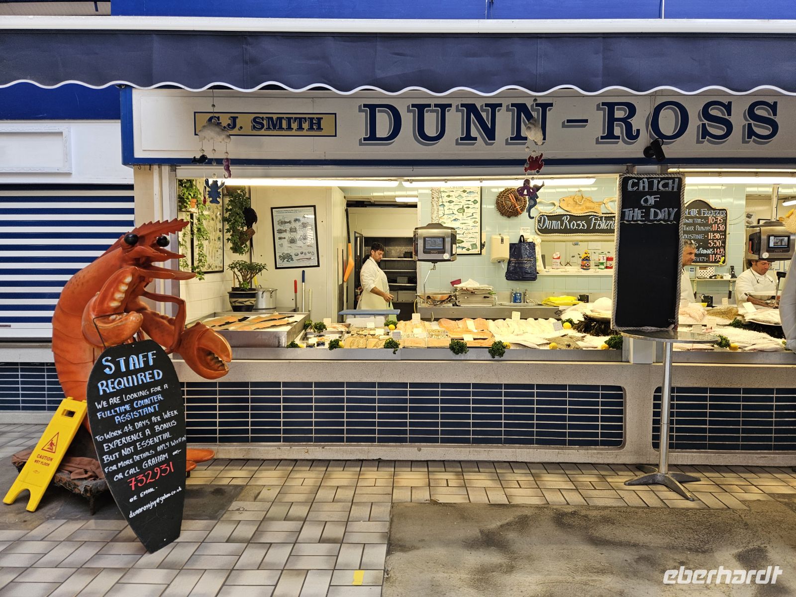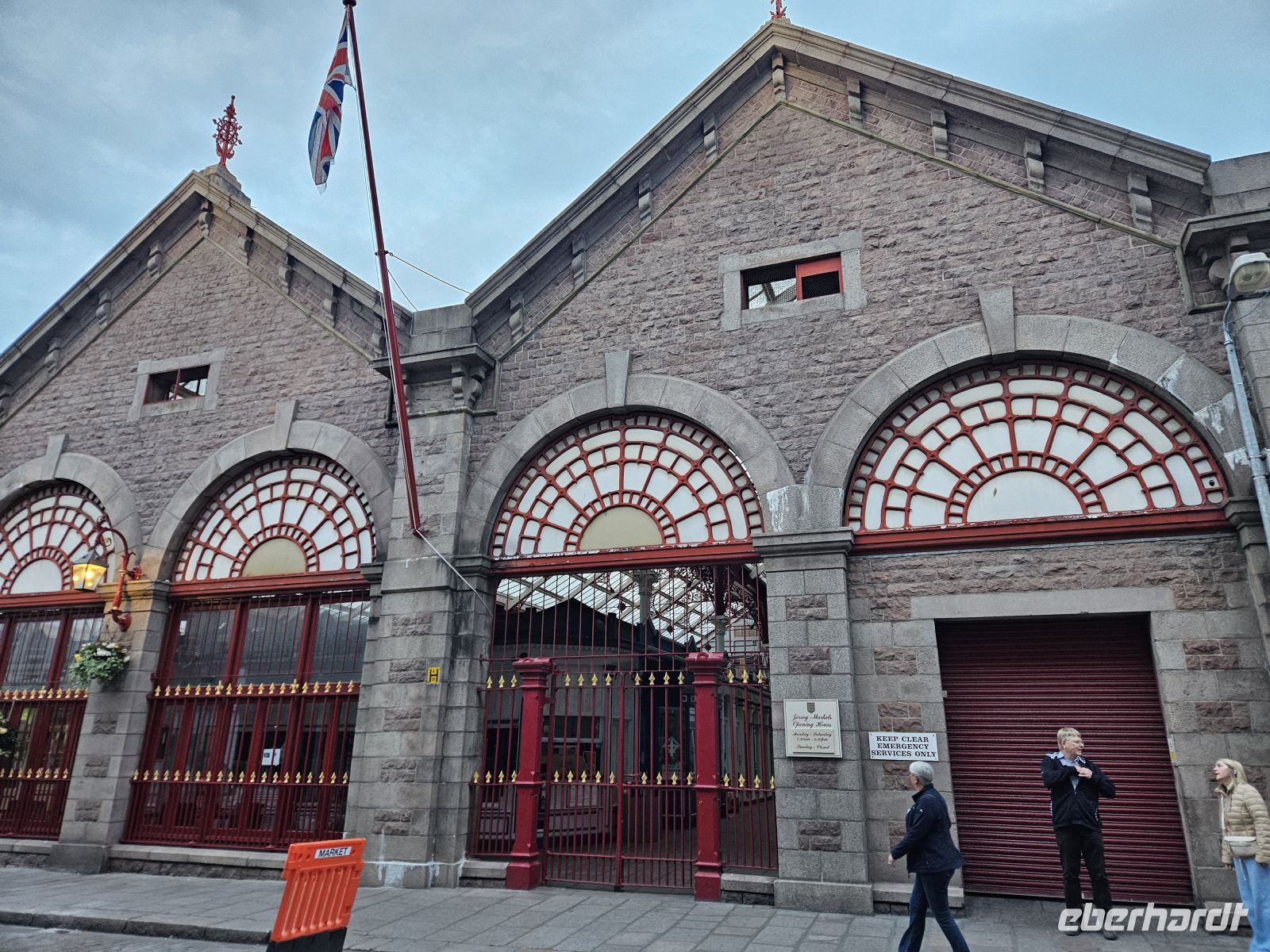 Heute stand für alle ein individueller Erkundungstag auf der Insel im Programm. Am Vormittag konnten alle Gäste an der Besichtigung der Hausfestung von St. Helier – dem Elizabeth Castle teilnehmen. Unsere Gruppe war zu 10.00 Uhr angemeldet und auf dem Weg machten wir einen Abstecher über die Markthalle und den Fischmarkt. Anne hatte uns am Vortag schon den Tipp gegeben dort hinzugehen, wenn die Märkte erst aufgemacht haben und die Produkte noch frisch sind. Die Markthallen haben von Montag bis Samstag immer von 07.30 – 17.30 Uhr geöffnet. Hier gibt es frisches Obst und Gemüse, Spezialitäten von Jersey, wie Fudge und Black Butter – aber auch Antiquitätengeschäfte. Hinter der Markthale befindet sich die Fischhalle, wo die Verkäufer die frisch gefangenen Fische mit gekonnter Hand filetieren.