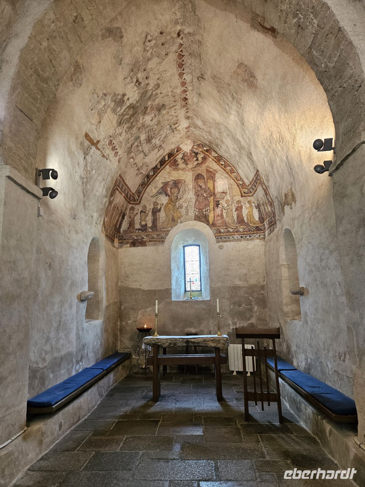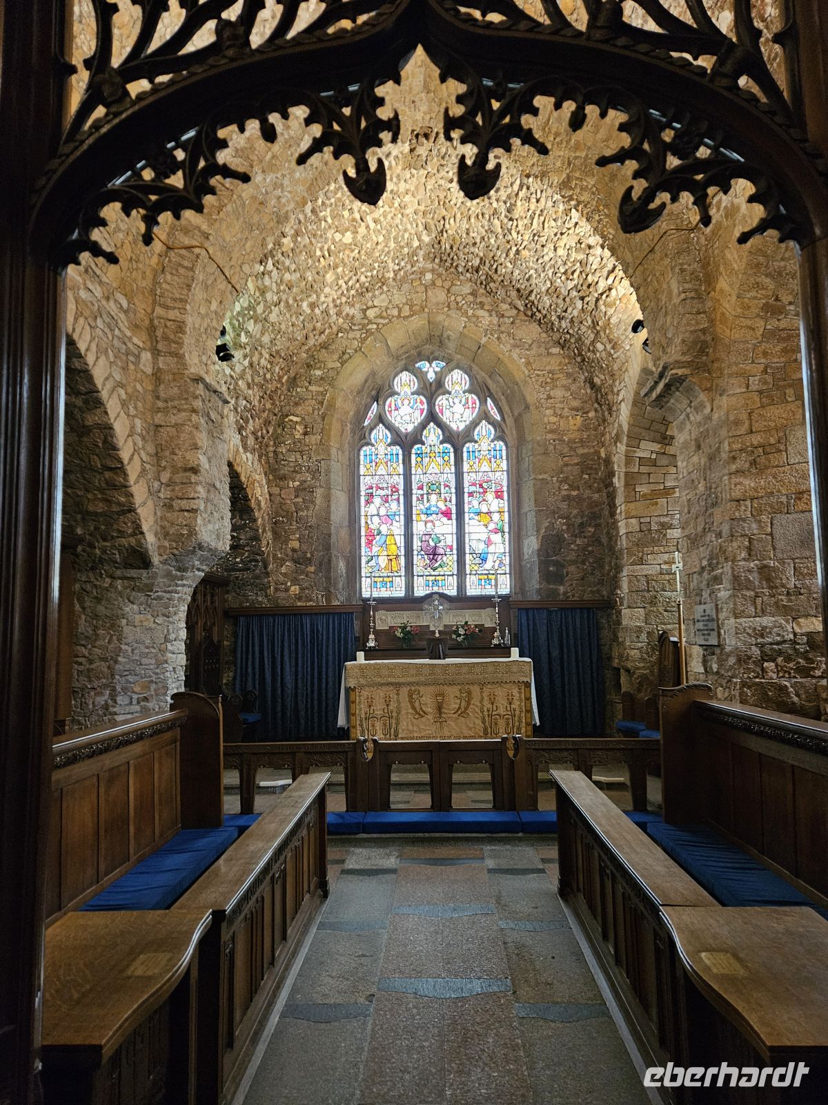Unser Bus fuhr jetzt Richtung Süden und brachte und in den kleinen Küstenort St. Brelade. Hier liefen wir zuerst ein kleines Stück durch den Churchill Memorial Sea Front Garden und dann entlang der Küste. Von hier sah man bereits den Kirchturm St. Brelade´s Parish Church und die Grabsteine der Fisherman´s Chapel und die Grabsteine des dazugehörigen Friedhofs. Direkt neben der Kirche steht die kleine Fishermen´s Chapel, die vermutlich im 11./12. Jahrhundert gebaut wurde. Im Inneren der Kapelle finden sich Fresken aus dem 13./14. Jahrhundert, auf denen unter anderem eine Verkündigungsszene oder Adam und Eva zu erkennen sind.