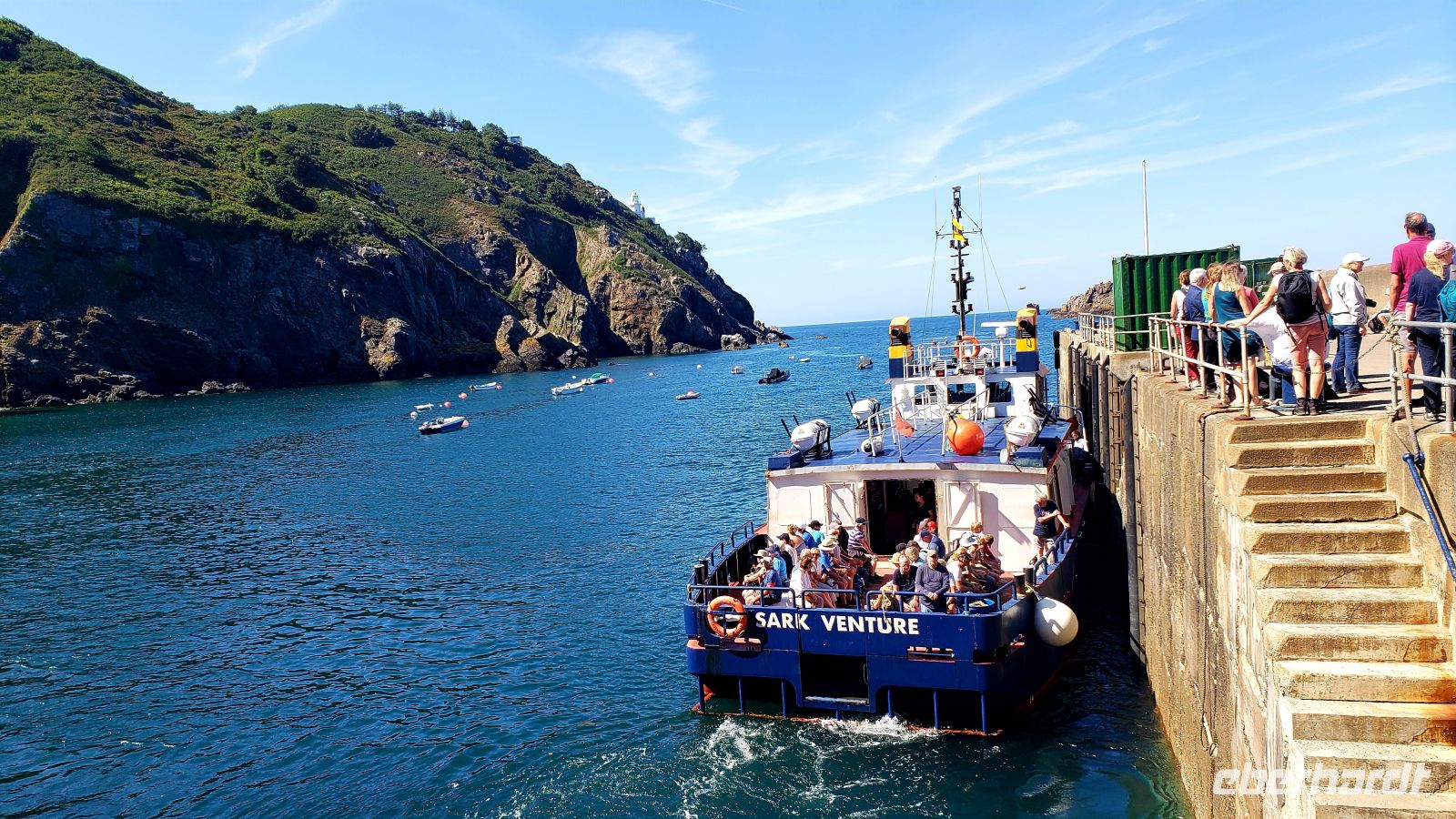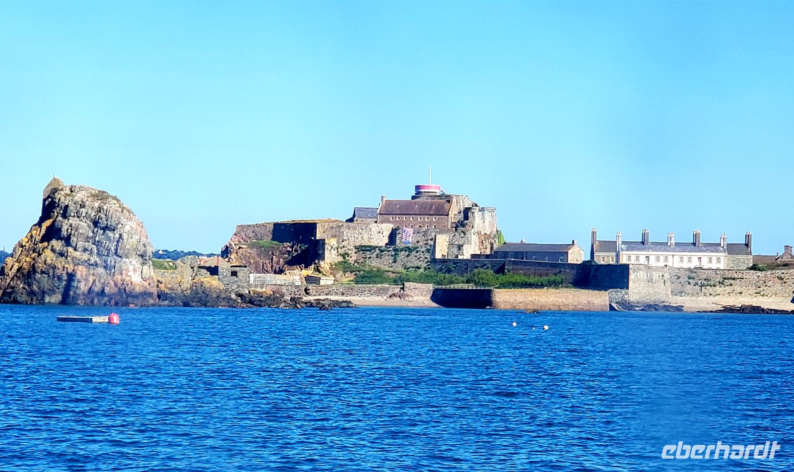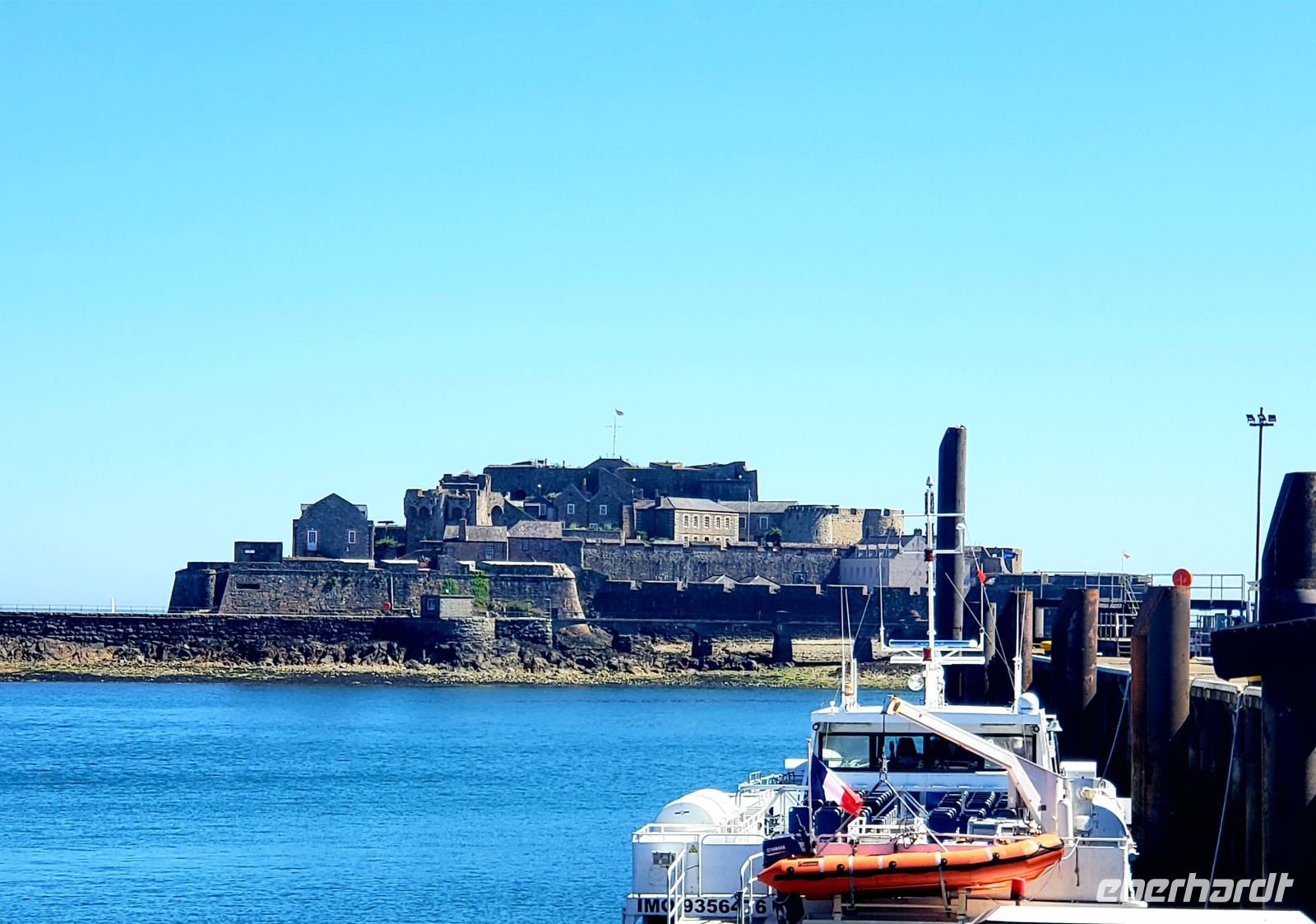 Die Fahrt mit der Fähre nach Sark dauert etwa eine Stunde und wir fahren zunächst entlang der Küste von Jersey, wo wir den Corbière Leuchtturm und das Elisabeth Castle auch von der Wasserseite sehen.