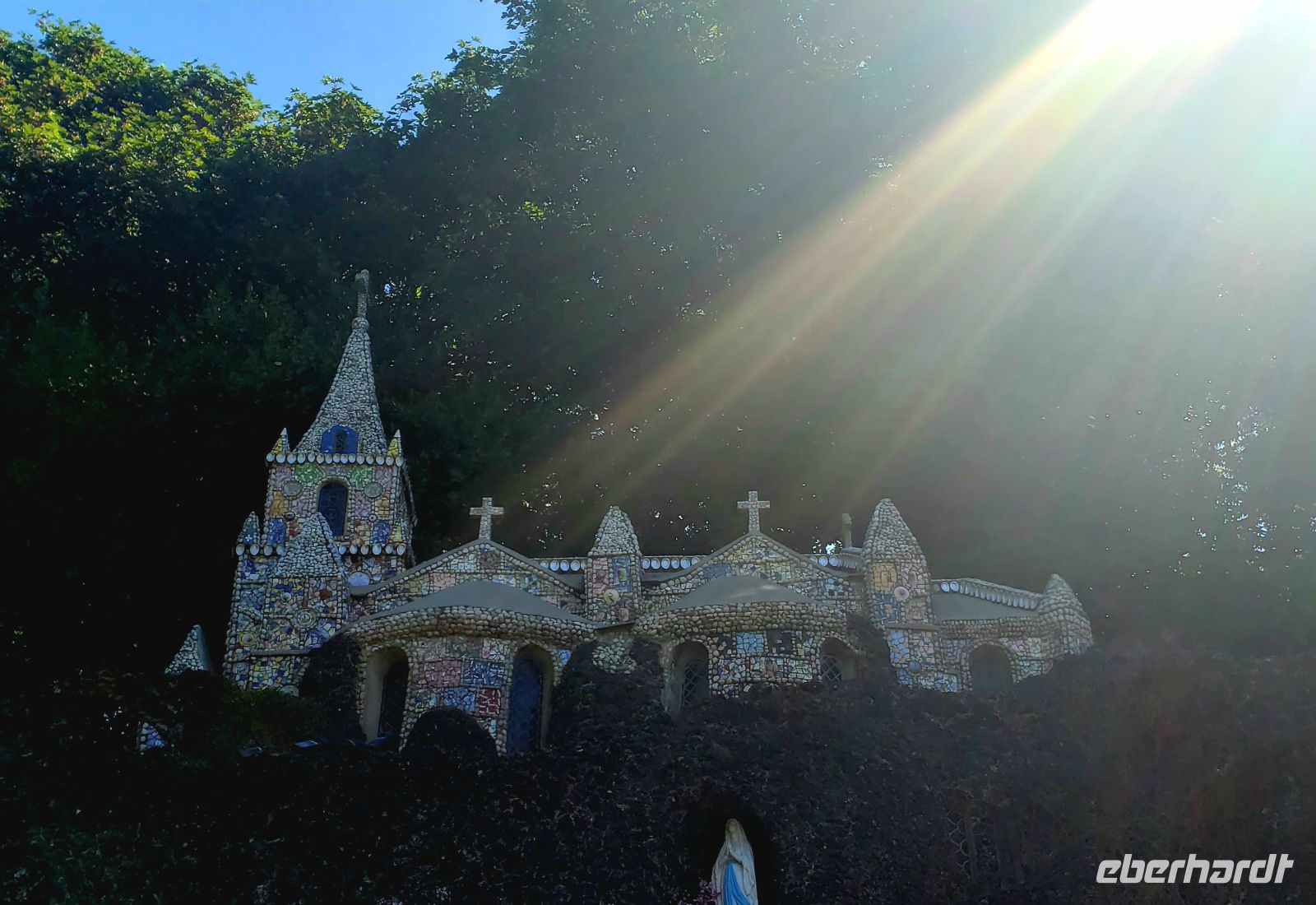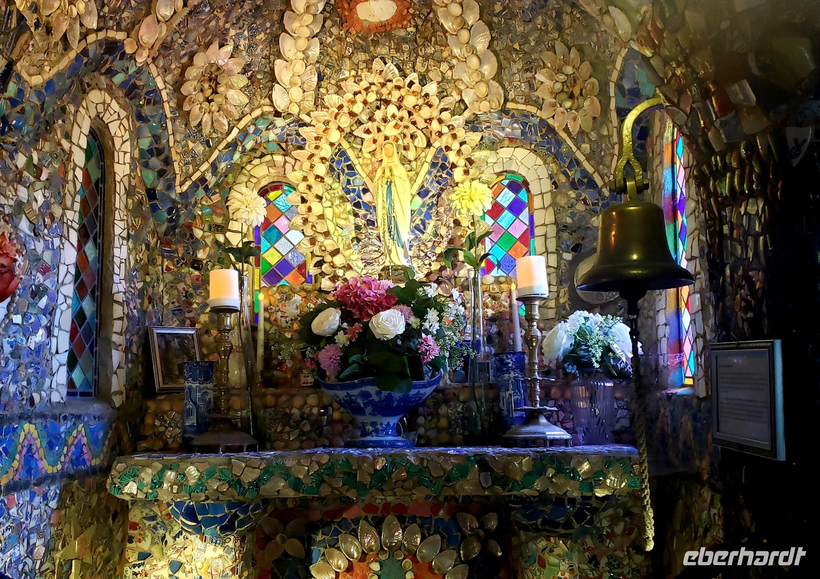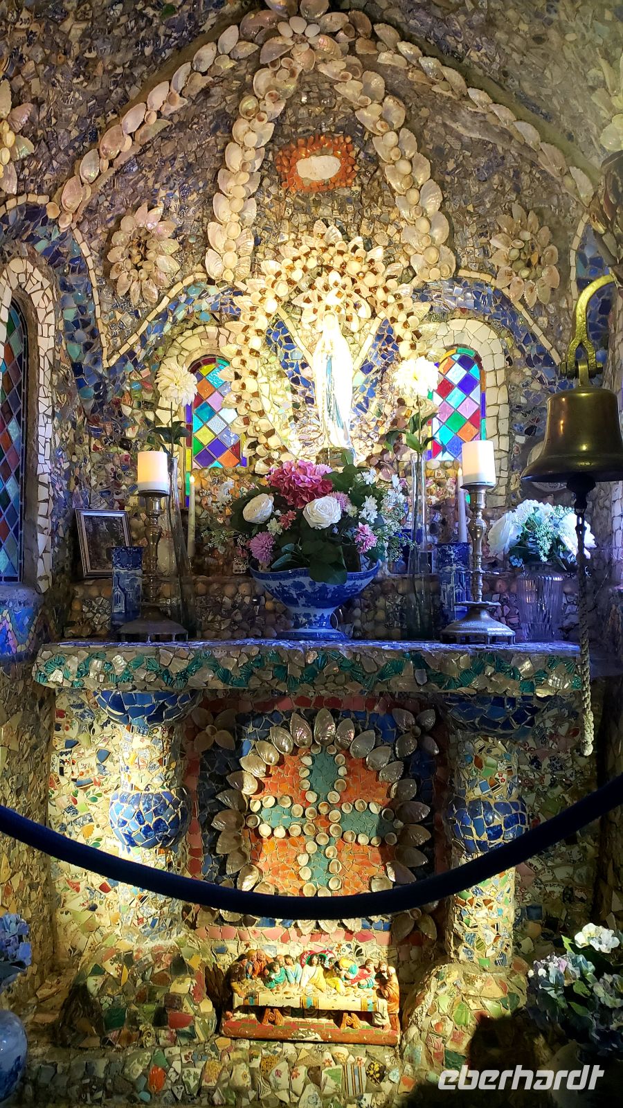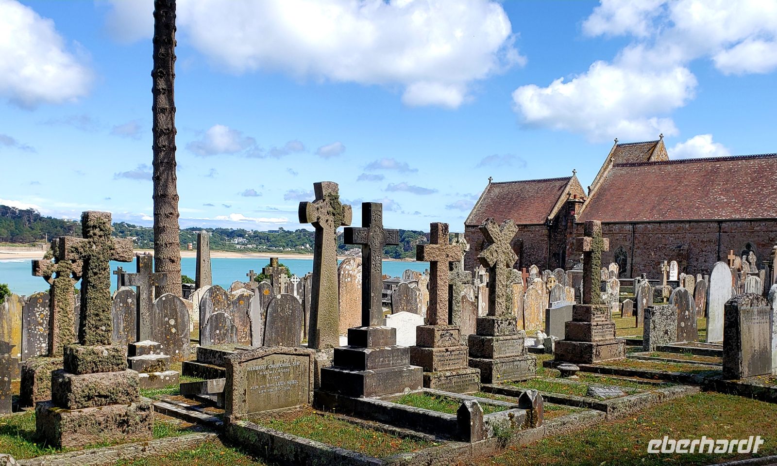 Heute werden wir um 8 Uhr abgeholt und zum Fährhafen gebracht, wo wir auf die Fähre nach Guernsey einchecken. Nach einer guten Stunde Fahrt erwartet Ken uns mit einem Bus und wir starten unsere Guernsey-Inselrundfahrt. Ken ist ein wandelndes Lexikon, kein Wunder, er ist auf Guernsey geboren! Zunächst schauen wir uns die sehr eindrucksvolle und wunderschöne „wahrscheinlich kleinste Kirche der Welt“ an, welche innen und außen über und über mit Muscheln und Keramikscherben verziert ist. Beim Betreten der Kirche können die Gäste nur hintereinanderstehen, mehr Platz ist dort nicht. Dann geht es nach unten, überall sind Altarnischen und schon ist man wieder draußen. Aber was für eine Augenweide!