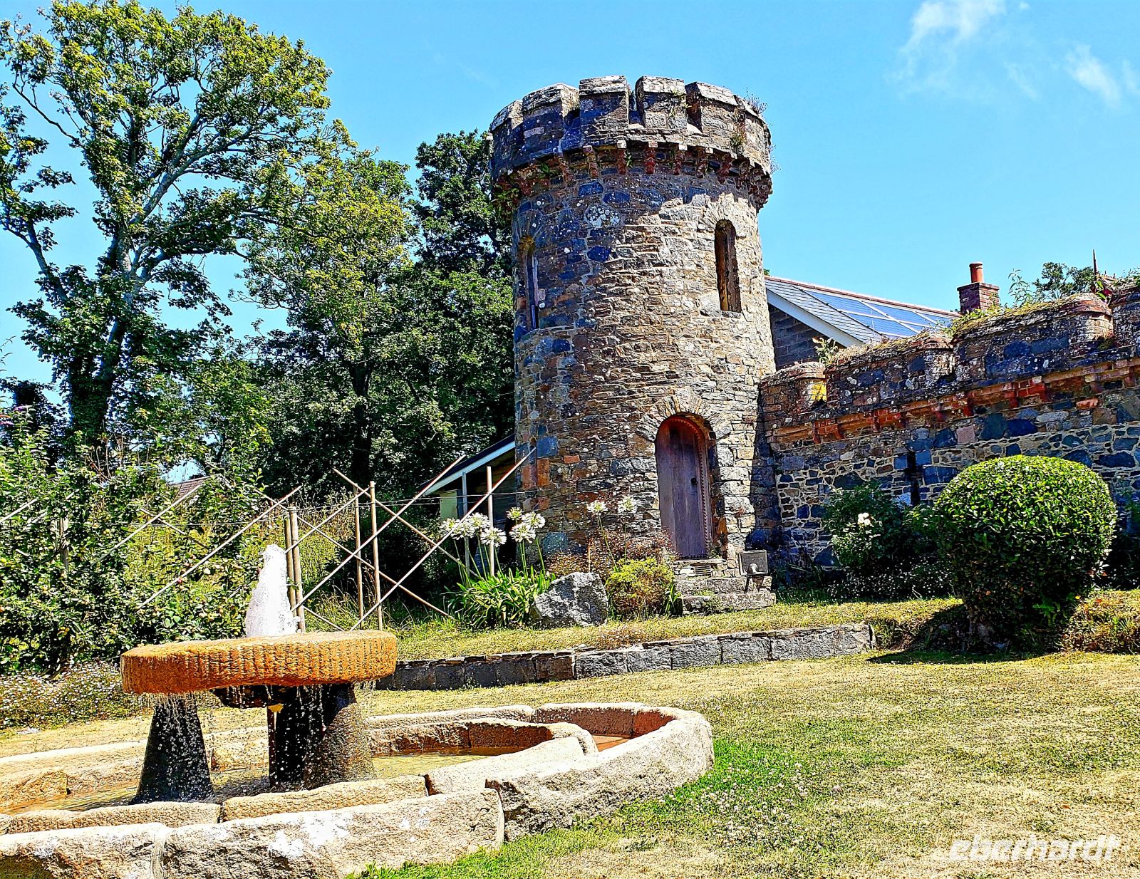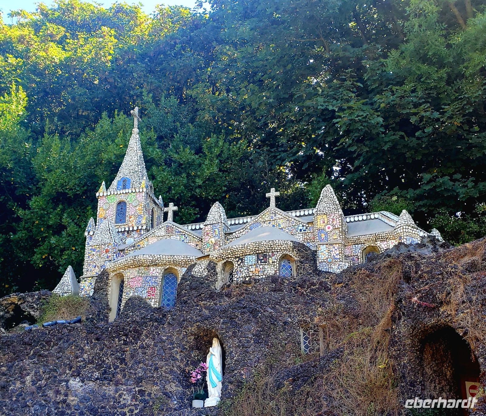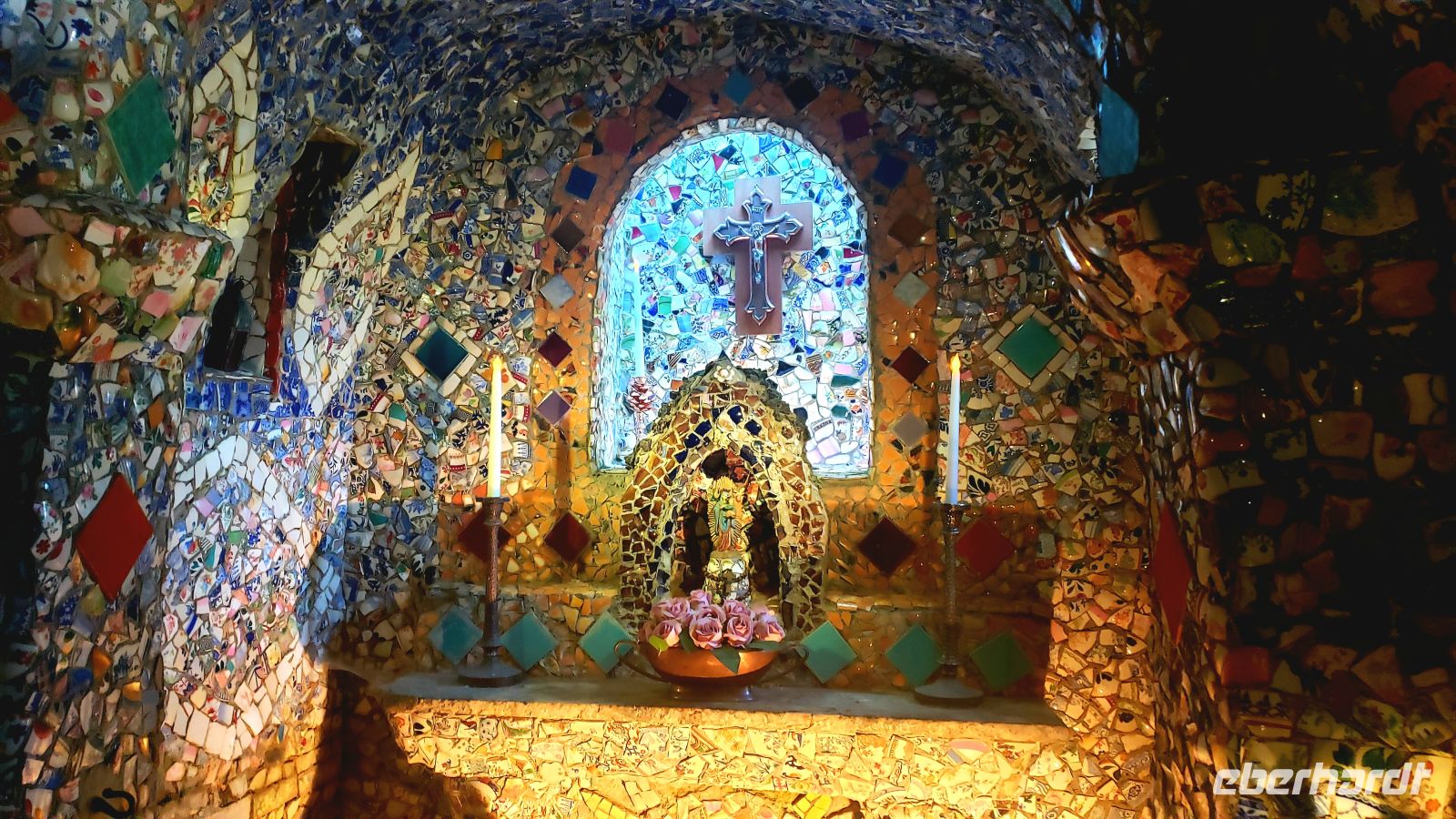 Heute werden wir um 8 Uhr abgeholt und zum Fährhafen gebracht, wo wir auf die Fähre nach Guernsey einchecken. Nach einer guten Stunde Fahrt erwartet Ken uns mit einem Bus und wir starten unsere Guernsey-Inselrundfahrt. Ken ist ein wandelndes Lexikon, kein Wunder, er ist auf Guernsey geboren! Zunächst schauen wir uns die sehr eindrucksvolle und wunderschöne „wahrscheinlich kleinste Kirche der Welt“ an, welche innen und außen über und über mit Muscheln und Keramikscherben verziert ist. Beim Betreten der Kirche können die Gäste nur hintereinanderstehen, mehr Platz ist dort nicht. Dann geht es nach unten, überall sind Altarnischen und schon ist man wieder draußen. Aber was für eine Augenweide!