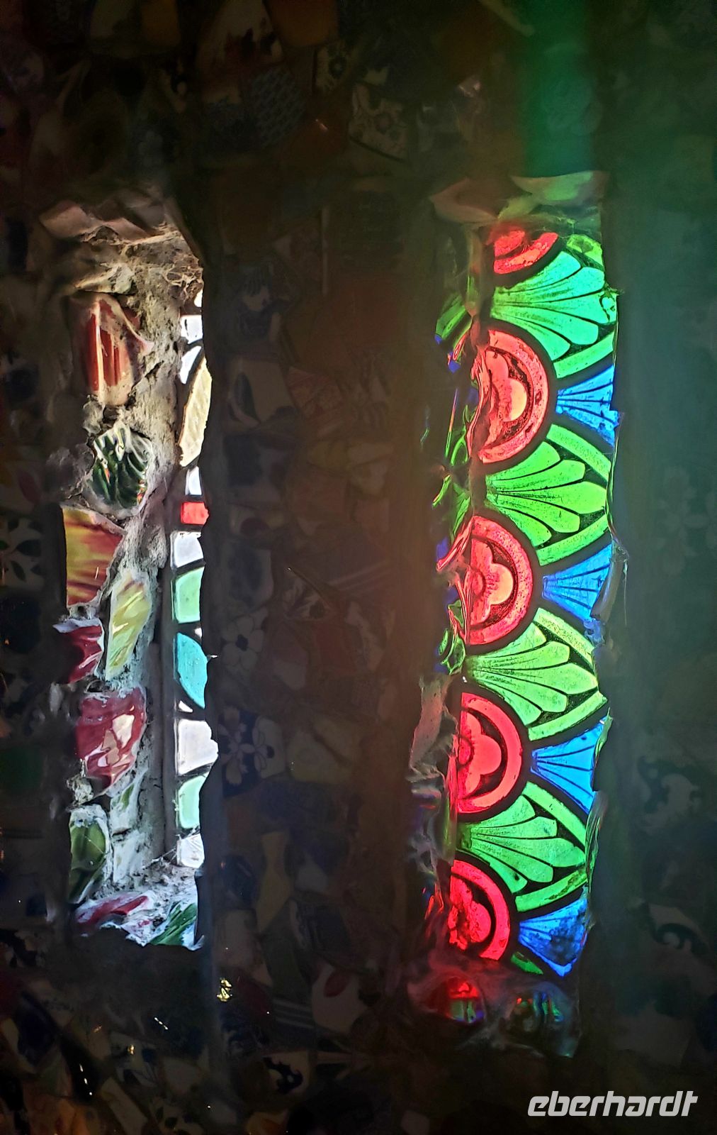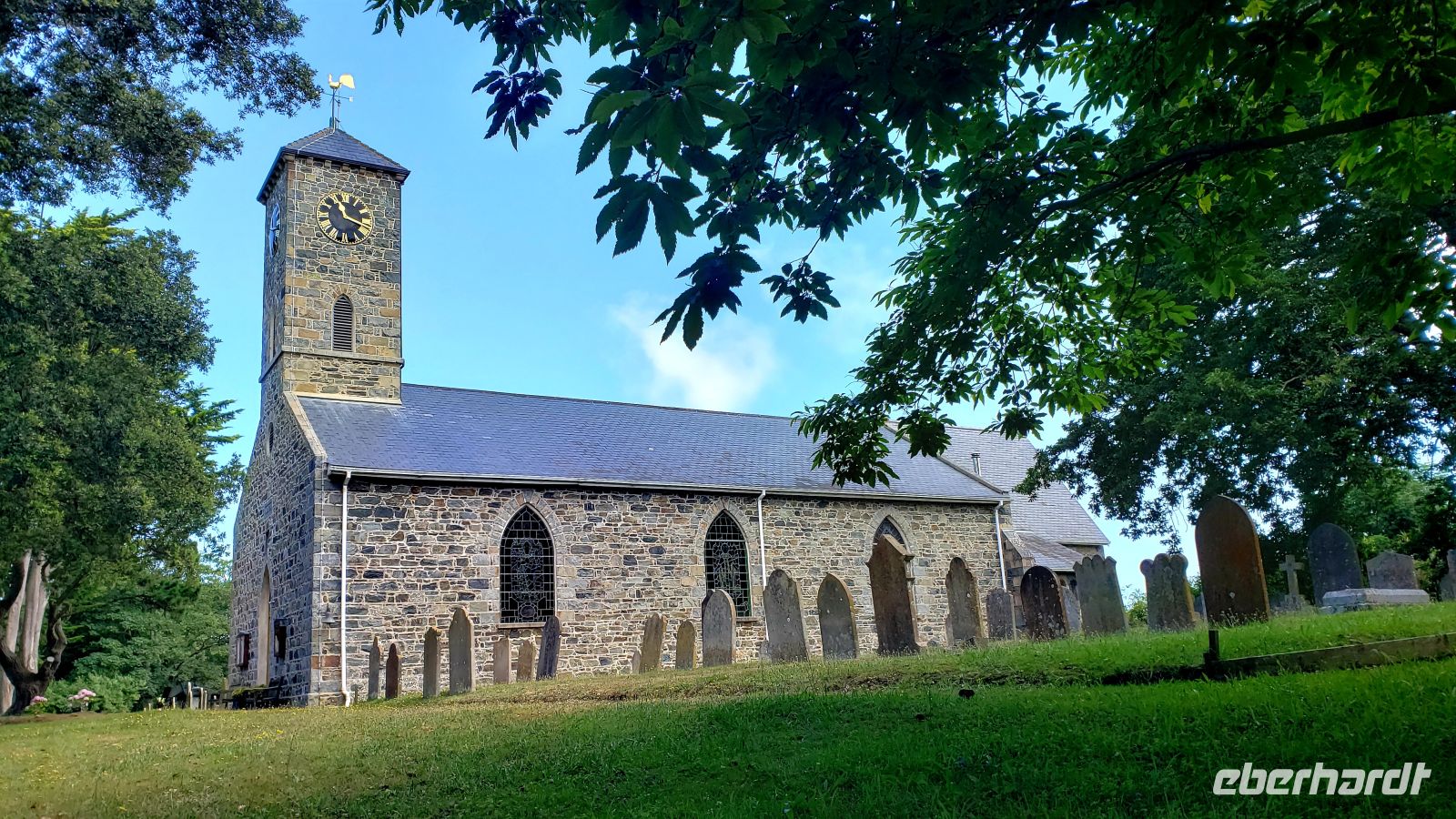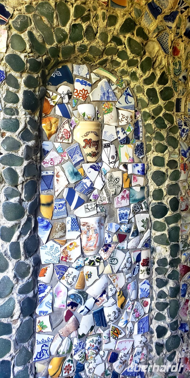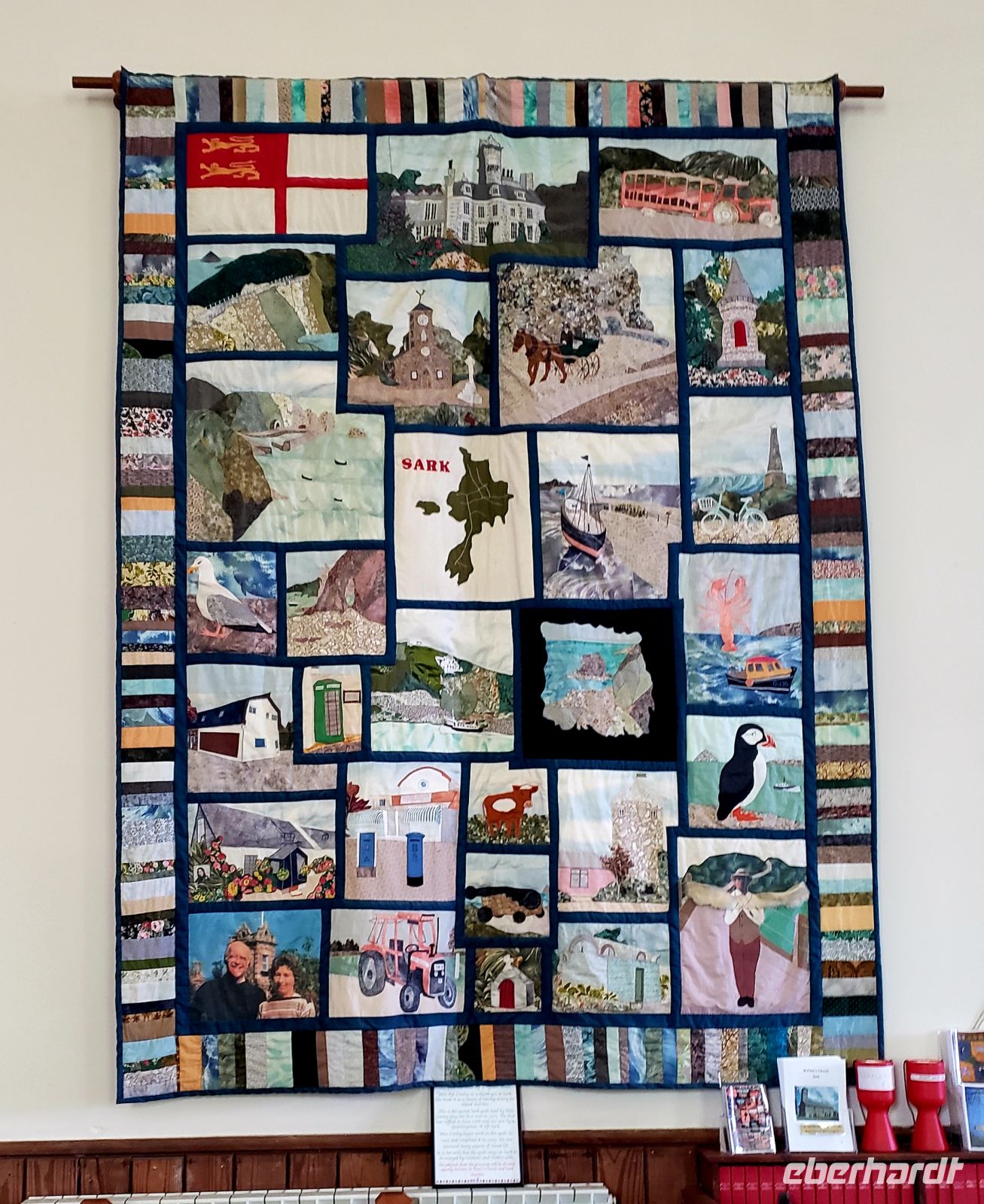 Heute werden wir um 8 Uhr abgeholt und zum Fährhafen gebracht, wo wir auf die Fähre nach Guernsey einchecken. Nach einer guten Stunde Fahrt erwartet Ken uns mit einem Bus und wir starten unsere Guernsey-Inselrundfahrt. Ken ist ein wandelndes Lexikon, kein Wunder, er ist auf Guernsey geboren! Zunächst schauen wir uns die sehr eindrucksvolle und wunderschöne „wahrscheinlich kleinste Kirche der Welt“ an, welche innen und außen über und über mit Muscheln und Keramikscherben verziert ist. Beim Betreten der Kirche können die Gäste nur hintereinanderstehen, mehr Platz ist dort nicht. Dann geht es nach unten, überall sind Altarnischen und schon ist man wieder draußen. Aber was für eine Augenweide!