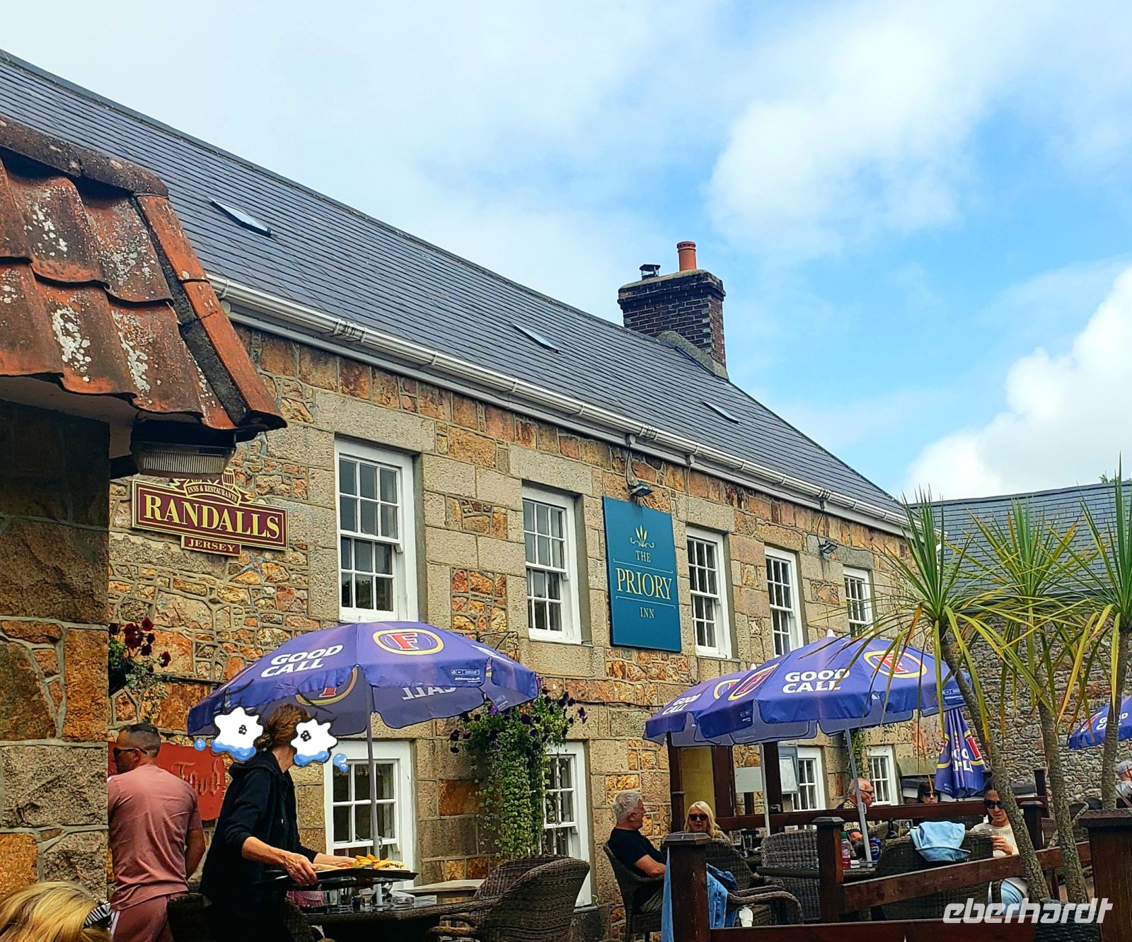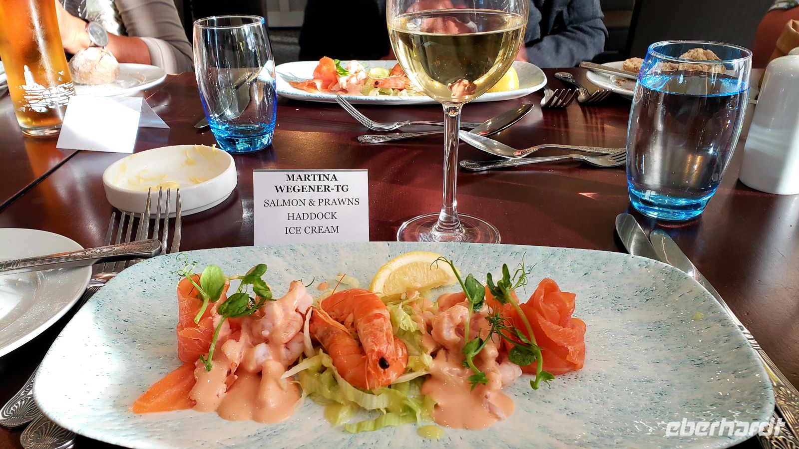 Dann wandern wir zurück zu dem Pub „Priory Inn“, wo wir auf der gemütlichen Terrasse eine Kleinigkeit zum Mittag essen. Vor dem Pub fährt direkt der Bus zurück zur Liberation Busstation, dort verteilt sich die Gruppe, einige spazieren durch die Stadt zum Hotel zurück, einige kommen mit mir den etwas längeren Weg am Hafen entlang und über den Hügel zum Hotel. Das 3-Gänge Menu lässt wieder kaum Wünsche offen.