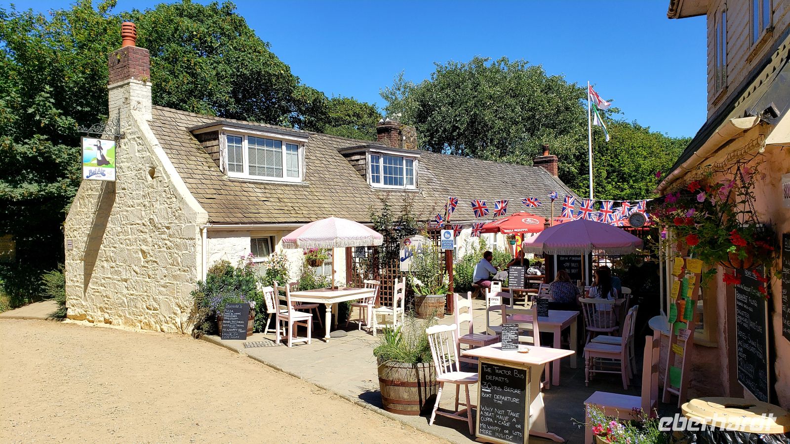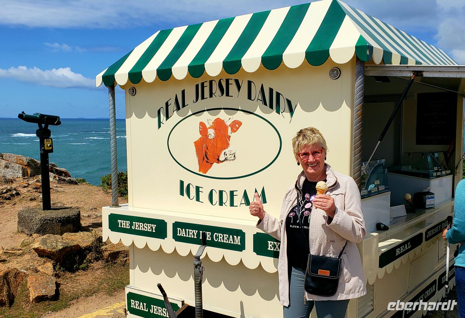 Bei bestem Wetter werden wir von unserer Reiseleiterin Vanessa und der Chauffeurin Jane mit dem Kleinbus zur Jersey-Inselrundfahrt abgeholt. Vanessa erzählt uns viel über Jersey und wir machen rund um die Insel Stopps an malerischen Buchten, schroffen Klippen und der Burgruine Grosnez Castle, wo wir Zeit haben, die Aussicht zu genießen und Fotos zu machen. Besonders gefällt uns der Ort Gorey mit der imposanten Burg im Hintergrund und den Fischerhäusern davor mit kleinen Geschäften. Zum Mittagessen kehren wir in ein typisch englisches Pub ein, wo es sehr gemütlich ist und das Essen lecker.